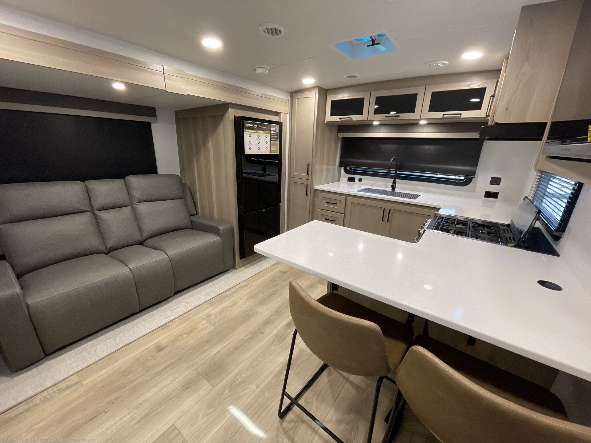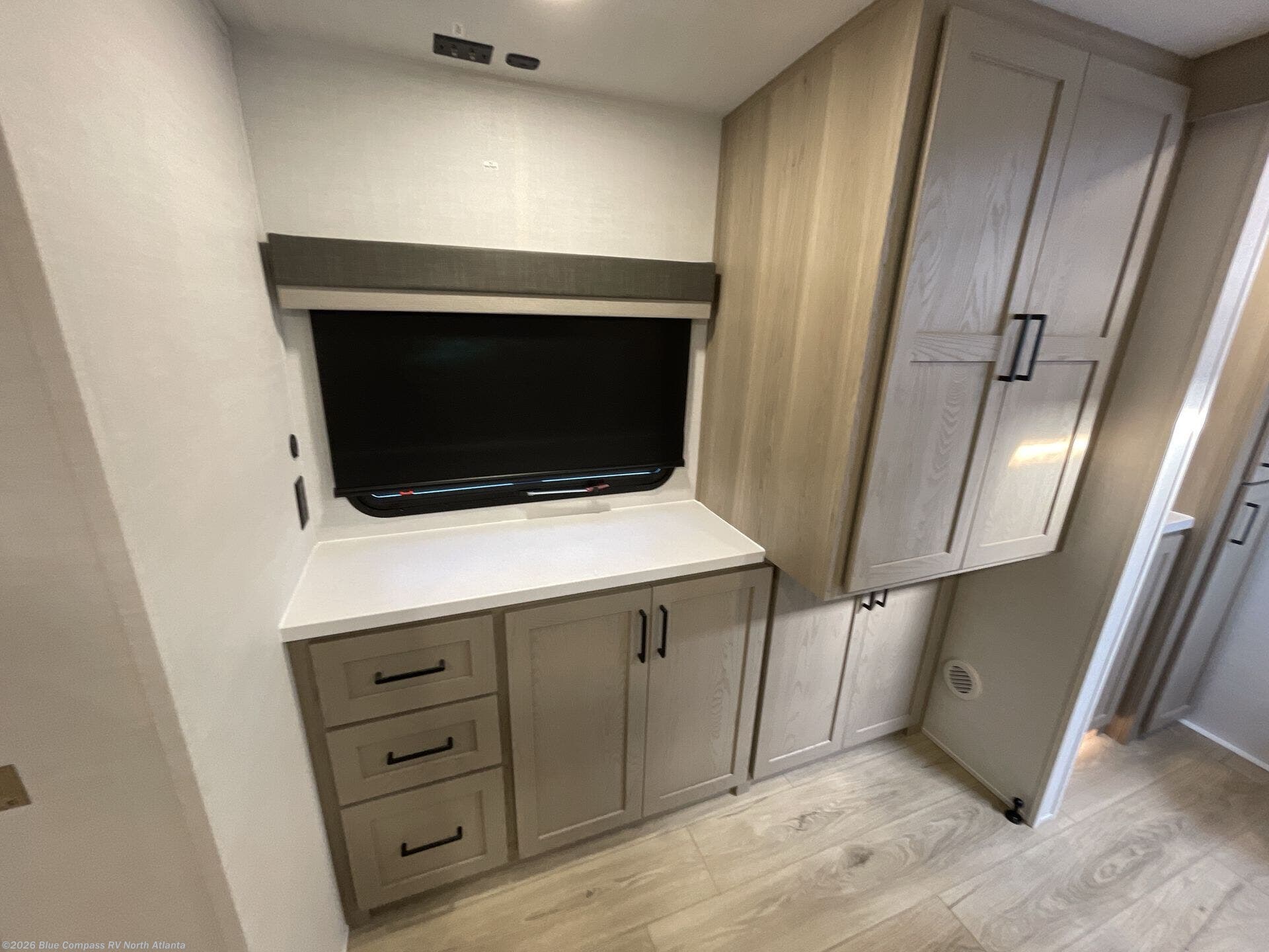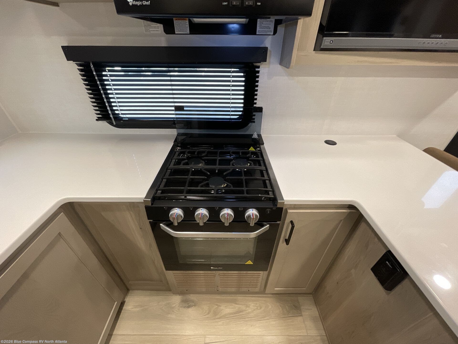 This travel trailer is the best option for you and your partner! The lavish full rear bathroom features a spacious layout and a convenient linen closet, perfect for relaxation and refreshment. The elegant bedroom boasts a plush queen bed, ample wardrobe space, and stylish dresser, creating a serene retreat. The spacious living room and kitchen combined area is the heart of the trailer, featuring plush theater seating for cozy movie nights, a generous closet for storing essentials, and a 12V Smart TV for entertainment on the go. Plus, the expansive countertop with chairs provides a perfect spot for gourmet meals or socializing, while the premium three-burner cooktop, kitchen pantry, and microwave make meal prep and cooking a true delight.