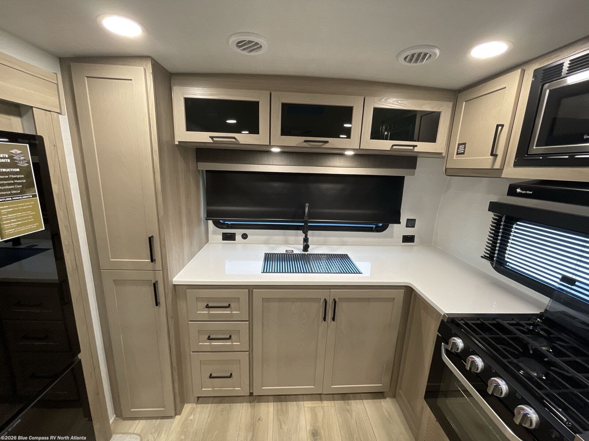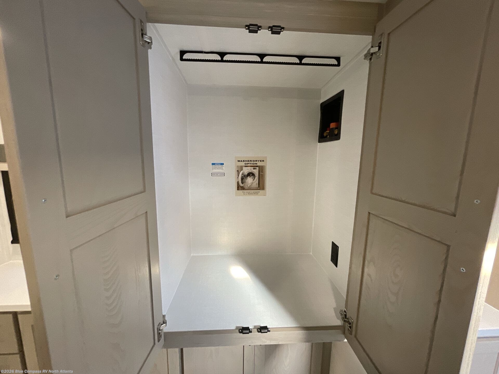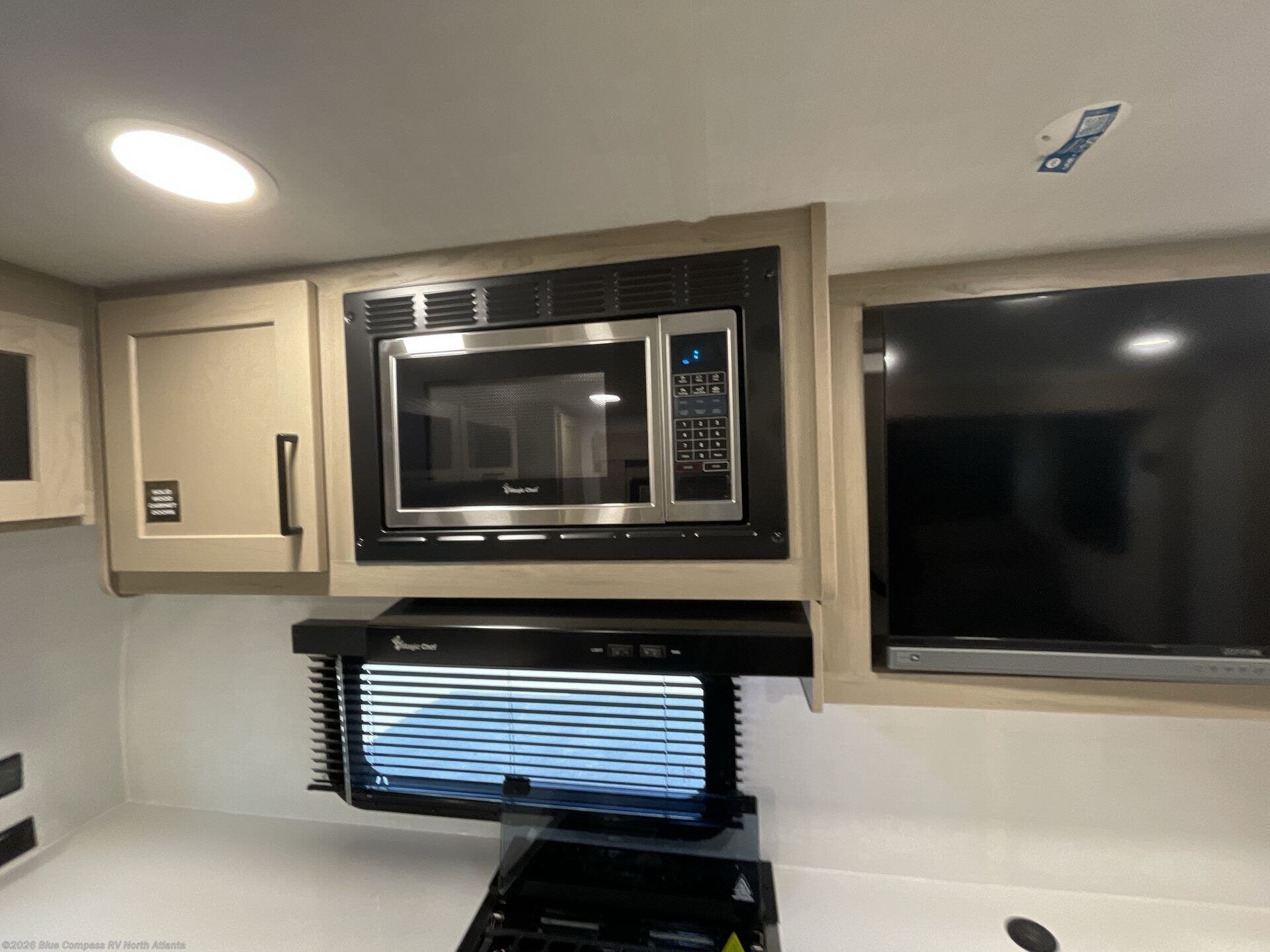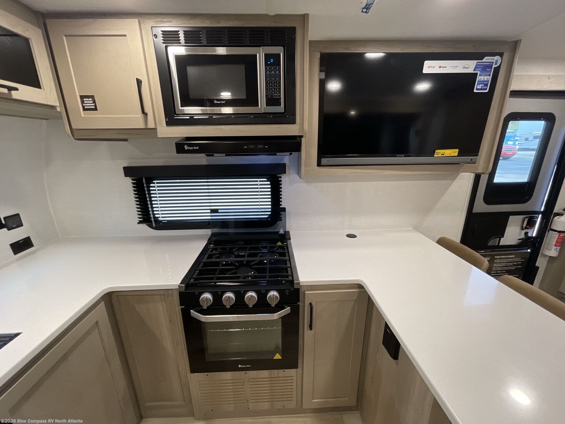 This travel trailer is the best option for you and your partner! The lavish full rear bathroom features a spacious layout and a convenient linen closet, perfect for relaxation and refreshment. The elegant bedroom boasts a plush queen bed, ample wardrobe space, and stylish dresser, creating a serene retreat. The spacious living room and kitchen combined area is the heart of the trailer, featuring plush theater seating for cozy movie nights, a generous closet for storing essentials, and a 12V Smart TV for entertainment on the go. Plus, the expansive countertop with chairs provides a perfect spot for gourmet meals or socializing, while the premium three-burner cooktop, kitchen pantry, and microwave make meal prep and cooking a true delight.