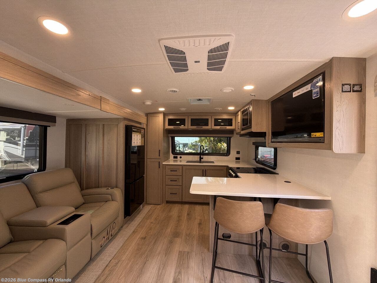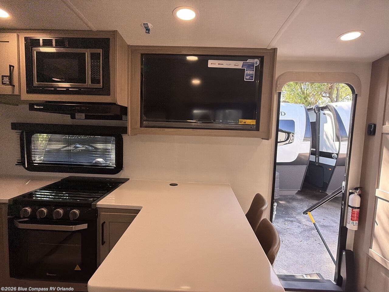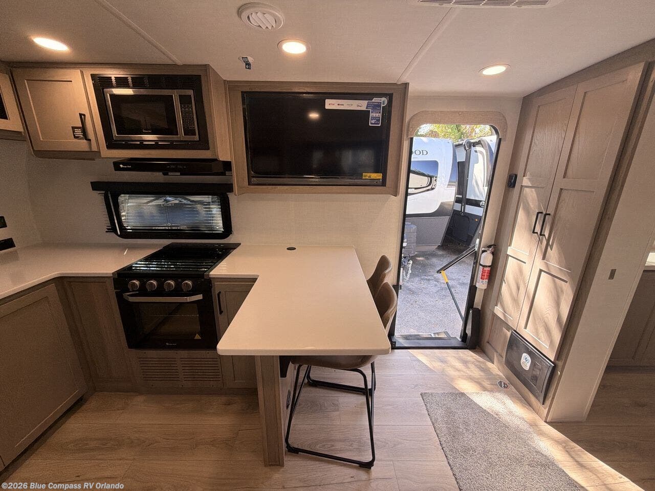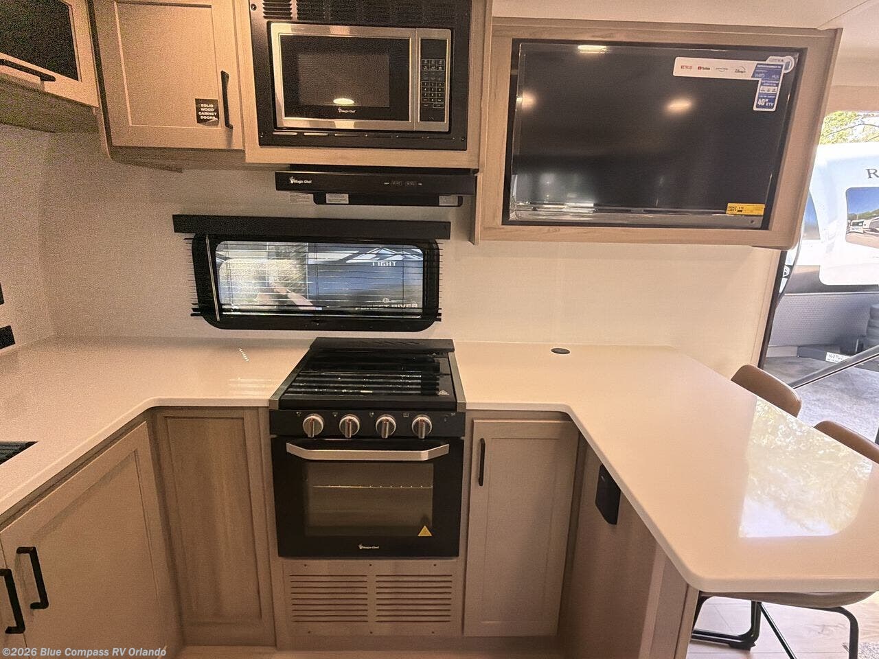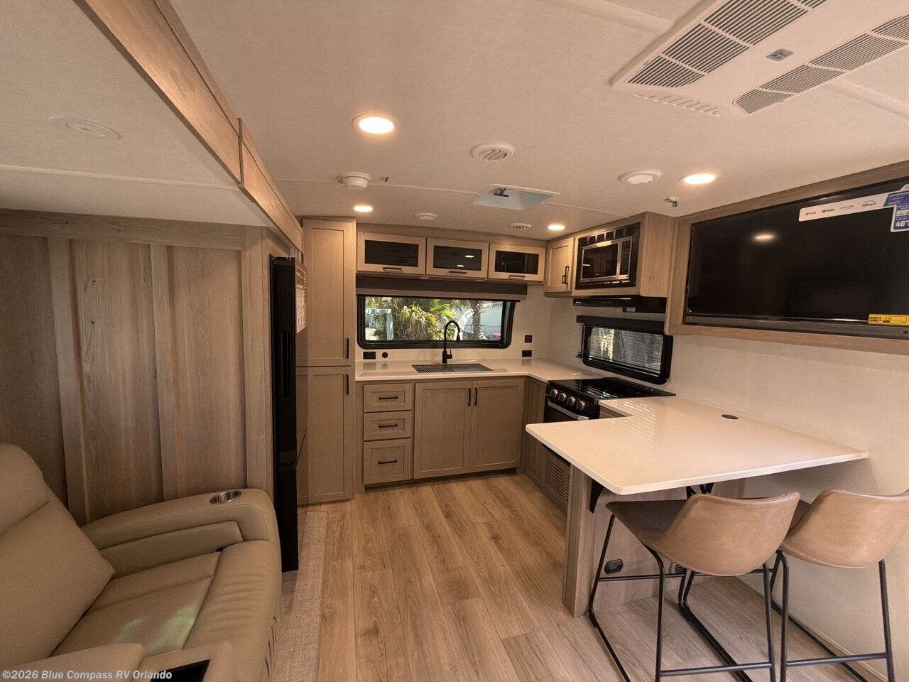 This travel trailer is the best option for you and your partner! The lavish full rear bathroom features a spacious layout and a convenient linen closet, perfect for relaxation and refreshment. The elegant bedroom boasts a plush queen bed, ample wardrobe space, and stylish dresser, creating a serene retreat. The spacious living room and kitchen combined area is the heart of the trailer, featuring plush theater seating for cozy movie nights, a generous closet for storing essentials, and a 12V Smart TV for entertainment on the go. Plus, the expansive countertop with chairs provides a perfect spot for gourmet meals or socializing, while the premium three-burner cooktop, kitchen pantry, and microwave make meal prep and cooking a true delight.