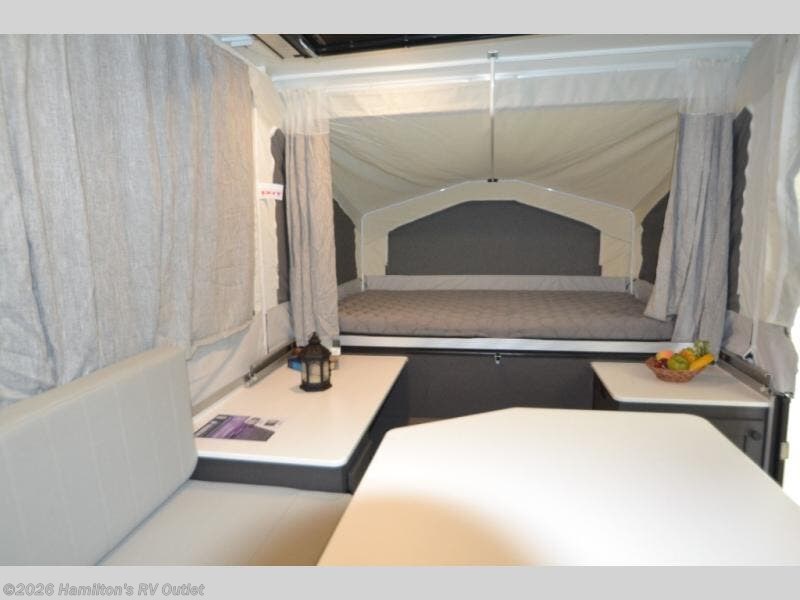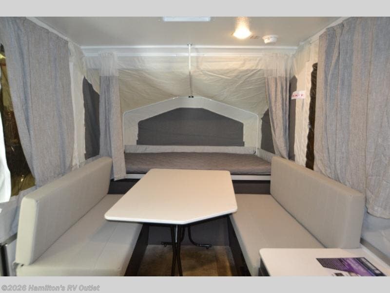 With any Rockwood OTG (Off The Ground) folding pop-up camper by Forest River, you will enjoy a more simple approach to outdoor fun. If you're a regular tent camper, but are looking for a little more comfort, then take a look at these easy-to-tow models! There are electric brakes, 12" radial tires, and Dexter sprung axles that provide that easy towing, and the clay fiberglass exterior is durable. A one-piece screen door also comes standard so you can let fresh air in, while keeping bugs out, and the LED interior lights will be an added benefit you didn't have while tent camping. Each model also includes residential style cabinet doors, wood look flooring, and an Andover Sable wood interior for a more outdoorsy feel!