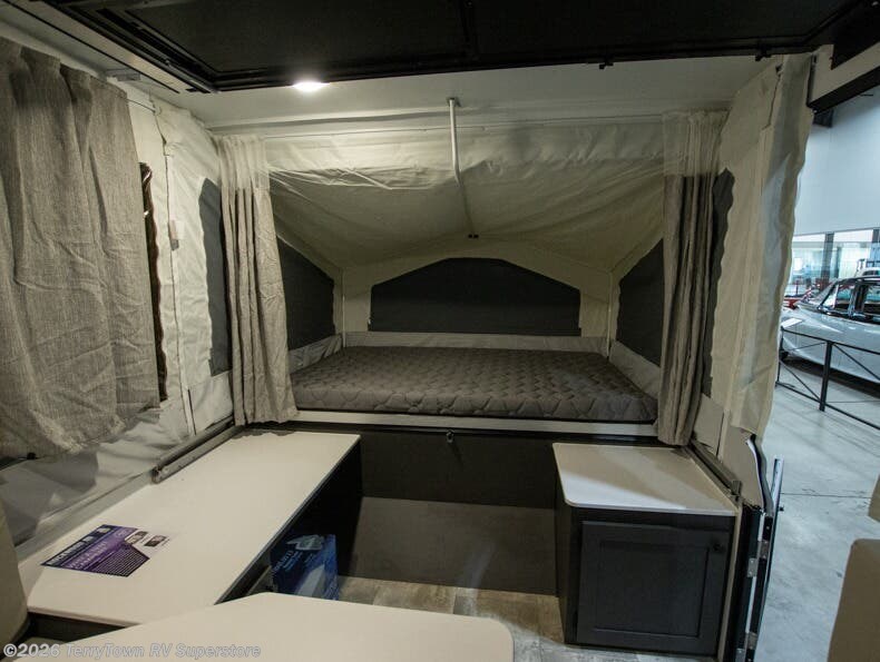 With any Rockwood OTG (Off The Ground) folding pop-up camper by Forest River, you will enjoy a more simple approach to outdoor fun. If you're a regular tent camper, but are looking for a little more comfort, then take a look at these easy-to-tow models! There are electric brakes, 12" radial tires, and Dexter sprung axles that provide that easy towing, and the clay fiberglass exterior is durable. A one-piece screen door also comes standard so you can let fresh air in, while keeping bugs out, and the LED interior lights will be an added benefit you didn't have while tent camping. Each model also includes residential style cabinet doors, wood look flooring, and an Andover Sable wood interior for a more outdoorsy feel!