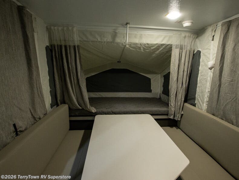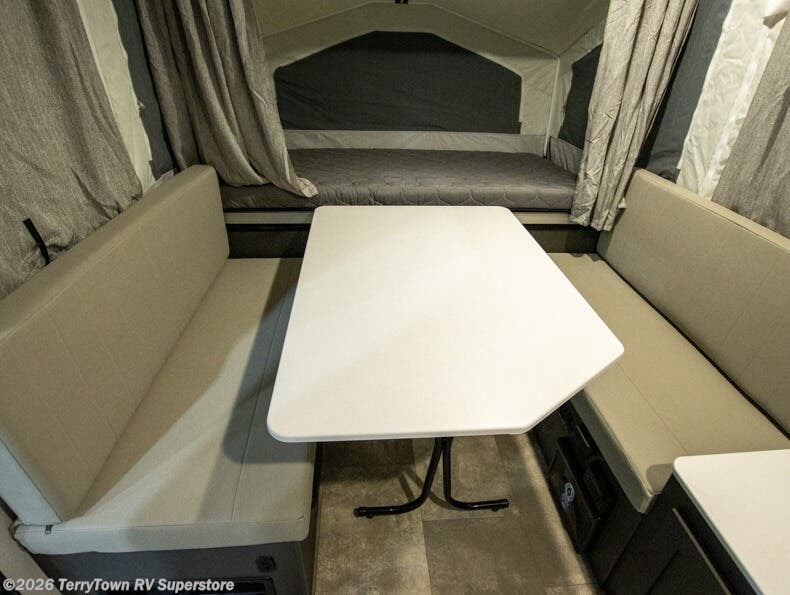 With any Rockwood OTG (Off The Ground) folding pop-up camper by Forest River, you will enjoy a more simple approach to outdoor fun. If you're a regular tent camper, but are looking for a little more comfort, then take a look at these easy-to-tow models! There are electric brakes, 12" radial tires, and Dexter sprung axles that provide that easy towing, and the clay fiberglass exterior is durable. A one-piece screen door also comes standard so you can let fresh air in, while keeping bugs out, and the LED interior lights will be an added benefit you didn't have while tent camping. Each model also includes residential style cabinet doors, wood look flooring, and an Andover Sable wood interior for a more outdoorsy feel!