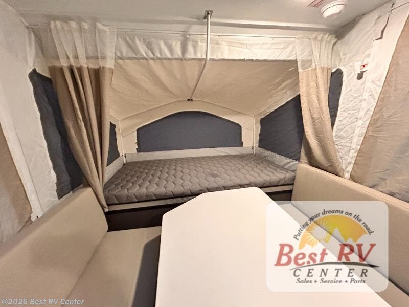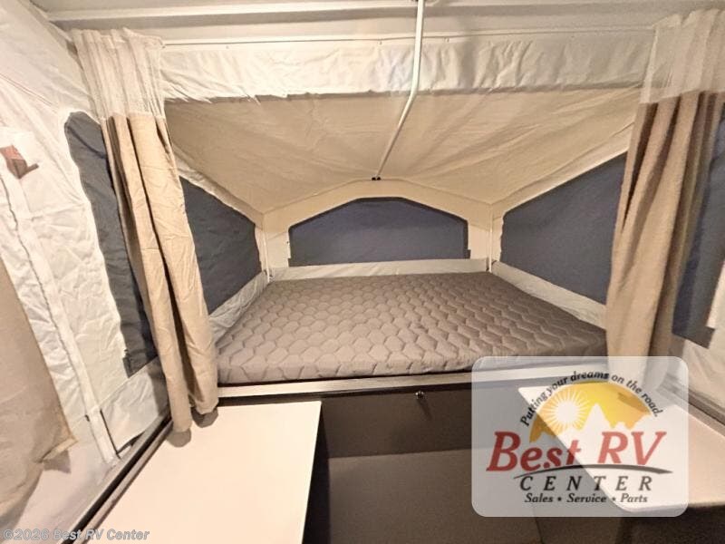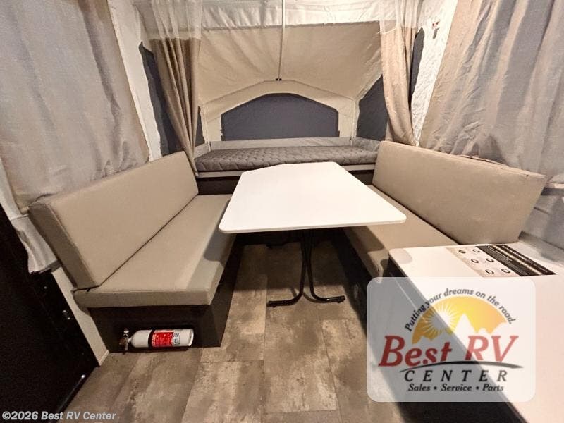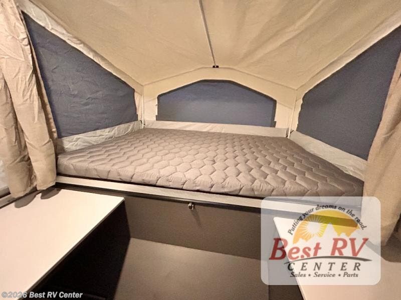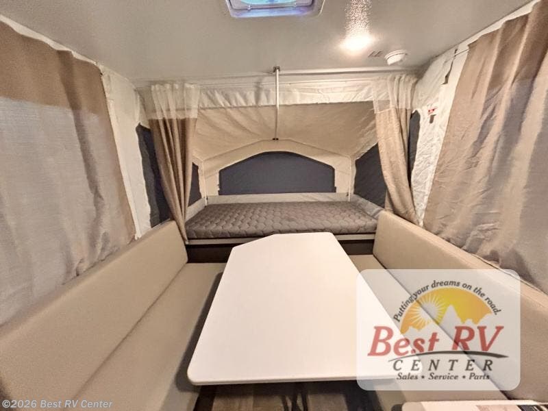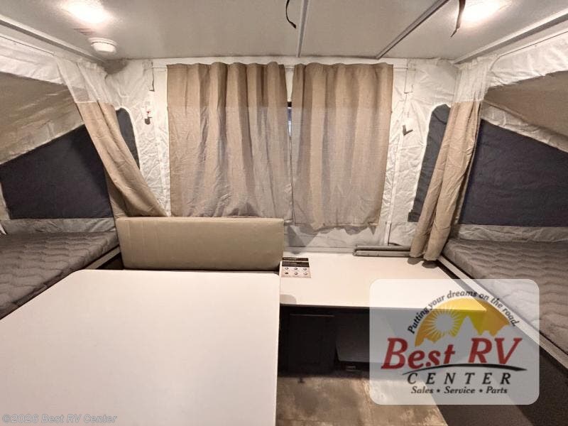With any Rockwood OTG (Off The Ground) folding pop-up camper by Forest River, you will enjoy a more simple approach to outdoor fun. If you're a regular tent camper, but are looking for a little more comfort, then take a look at these easy-to-tow models! There are electric brakes, 12" radial tires, and Dexter sprung axles that provide that easy towing, and the clay fiberglass exterior is durable. A one-piece screen door also comes standard so you can let fresh air in, while keeping bugs out, and the LED interior lights will be an added benefit you didn't have while tent camping. Each model also includes residential style cabinet doors, wood look flooring, and an Andover Sable wood interior for a more outdoorsy feel!
