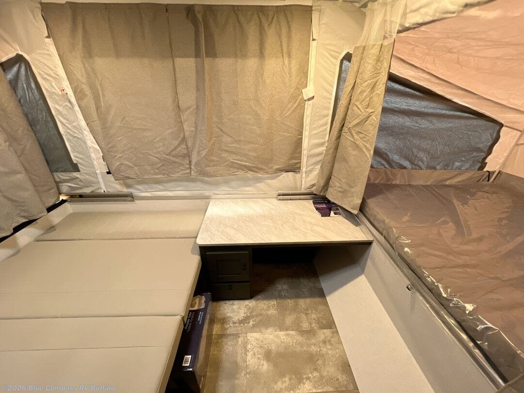With any Rockwood OTG (Off The Ground) folding pop-up camper by Forest River, you will enjoy a more simple approach to outdoor fun. If you're a regular tent camper, but are looking for a little more comfort, then take a look at these easy-to-tow models! There are electric brakes, 12" radial tires, and Dexter sprung axles that provide that easy towing, and the clay fiberglass exterior is durable. A one-piece screen door also comes standard so you can let fresh air in, while keeping bugs out, and the LED interior lights will be an added benefit you didn't have while tent camping. Each model also includes residential style cabinet doors, wood look flooring, and an Andover Sable wood interior for a more outdoorsy feel!