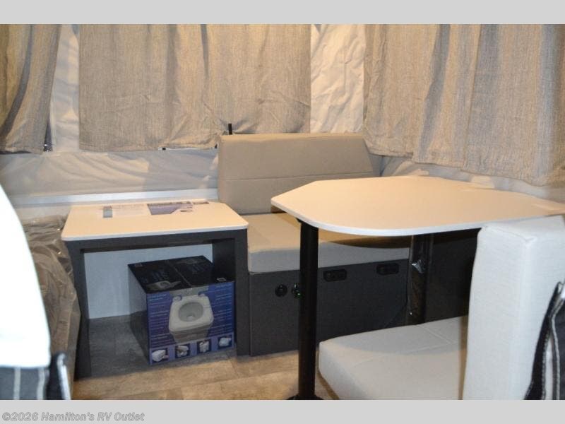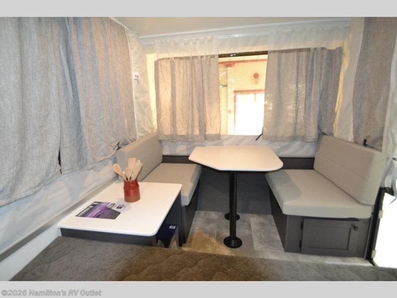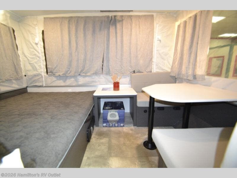 With any Rockwood OTG (Off The Ground) folding pop-up camper by Forest River, you will enjoy a more simple approach to outdoor fun. If you're a regular tent camper, but are looking for a little more comfort, then take a look at these easy-to-tow models! There are electric brakes, 12" radial tires, and Dexter sprung axles that provide that easy towing, and the clay fiberglass exterior is durable. A one-piece screen door also comes standard so you can let fresh air in, while keeping bugs out, and the LED interior lights will be an added benefit you didn't have while tent camping. Each model also includes residential style cabinet doors, wood look flooring, and an Andover Sable wood interior for a more outdoorsy feel!