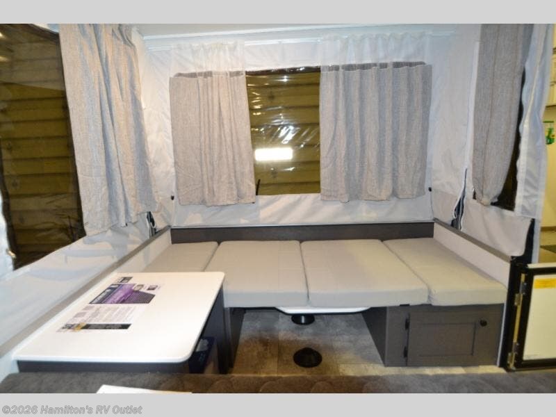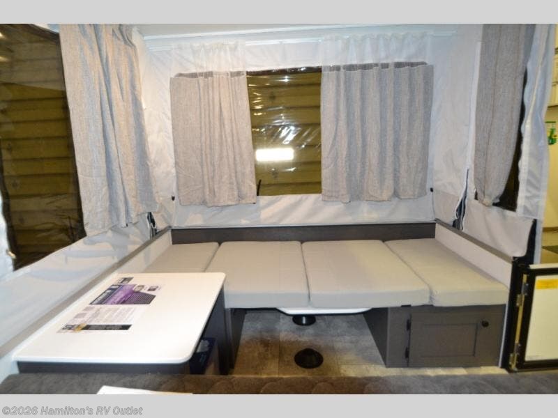 With any Rockwood OTG (Off The Ground) folding pop-up camper by Forest River, you will enjoy a more simple approach to outdoor fun. If you're a regular tent camper, but are looking for a little more comfort, then take a look at these easy-to-tow models! There are electric brakes, 12" radial tires, and Dexter sprung axles that provide that easy towing, and the clay fiberglass exterior is durable. A one-piece screen door also comes standard so you can let fresh air in, while keeping bugs out, and the LED interior lights will be an added benefit you didn't have while tent camping. Each model also includes residential style cabinet doors, wood look flooring, and an Andover Sable wood interior for a more outdoorsy feel!