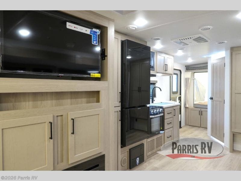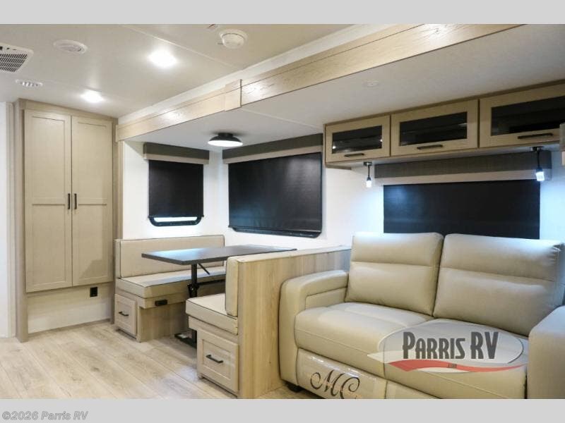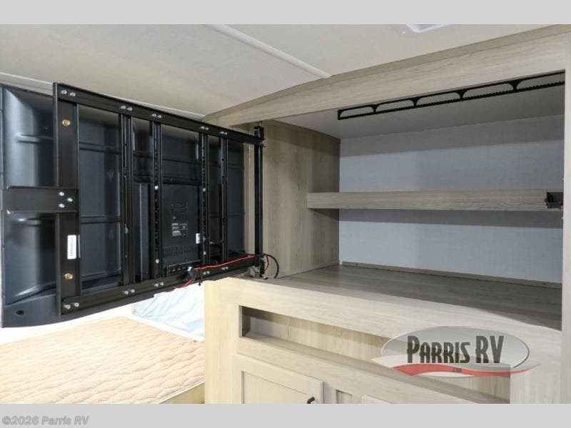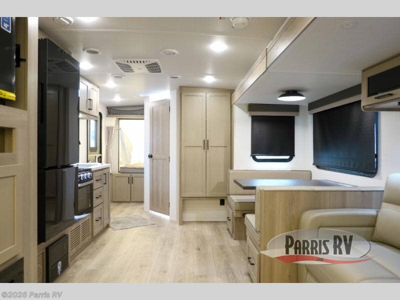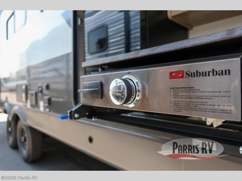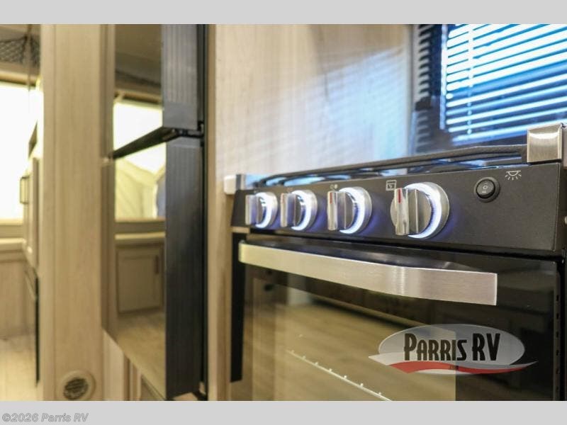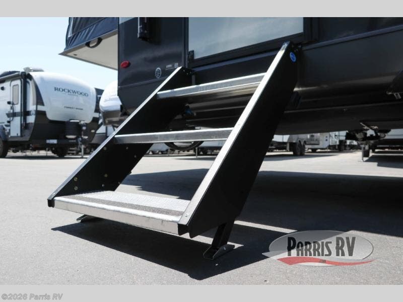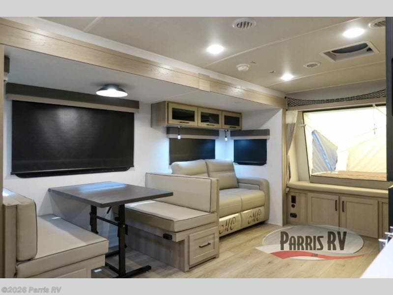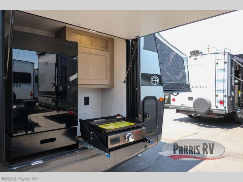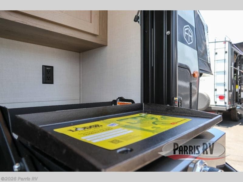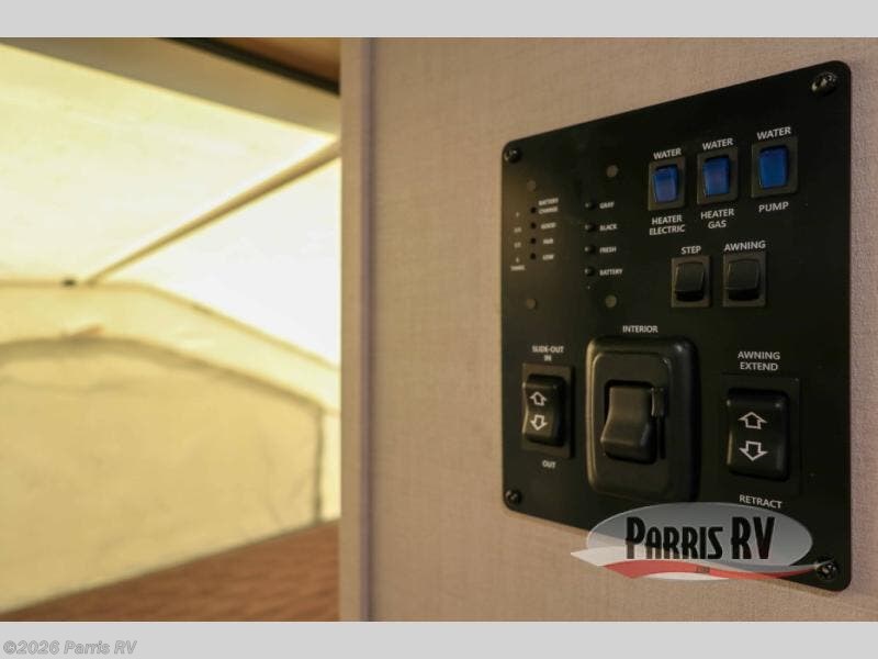 This expandable includes a large slide out that will make you feel right at home, so come take a look! The LED TV and fireplace is right across from the hide-a-bed sofa for easy viewing, and there is a booth dinette to dine together. The chef of the family can cook indoors on the three burner cooktop, or outdoors on the exterior griddle. Tuck your belongings in the overhead shelves, and snacks can go in the pantry. Don't forget about the exterior storage for your larger camp gear!