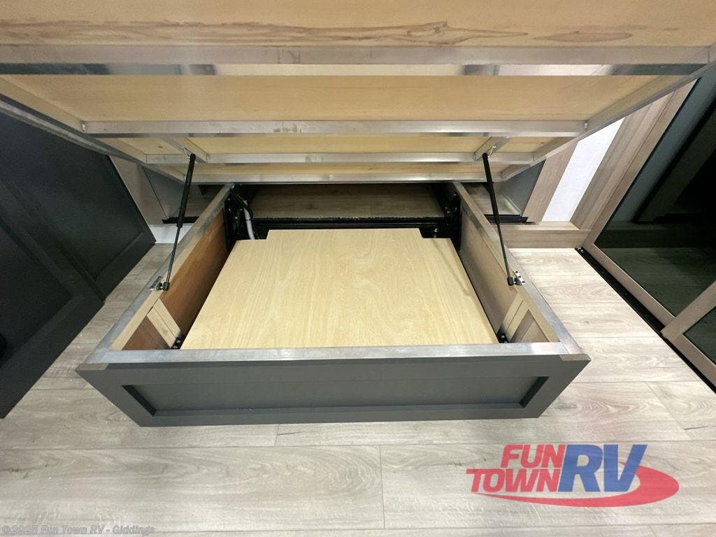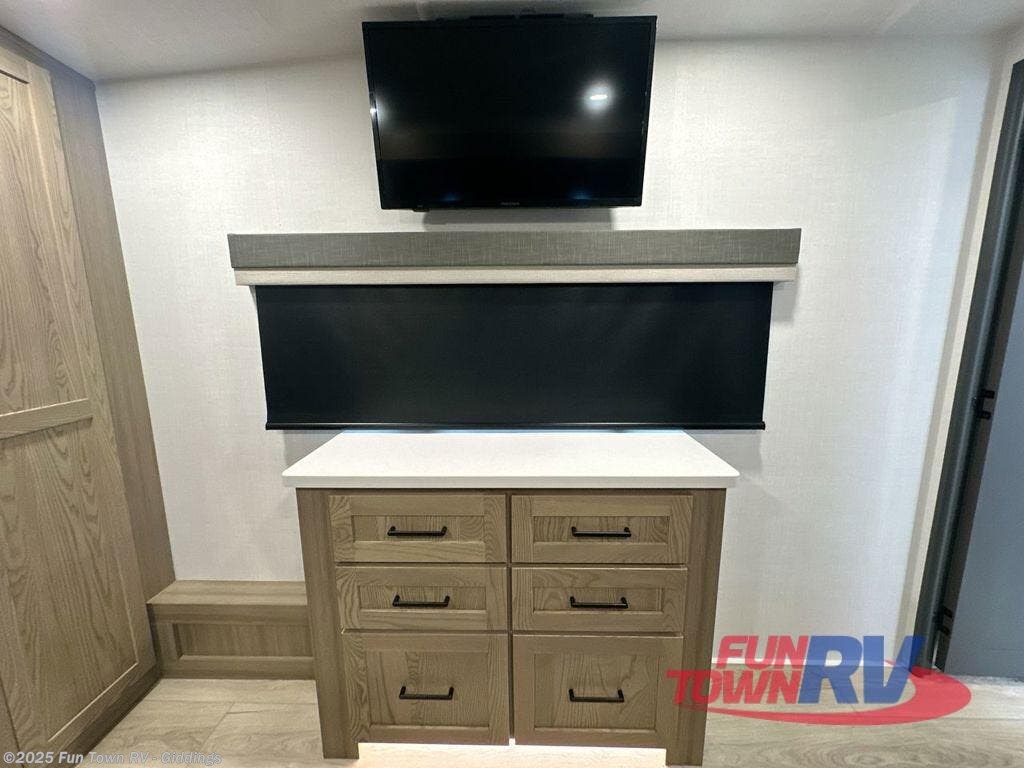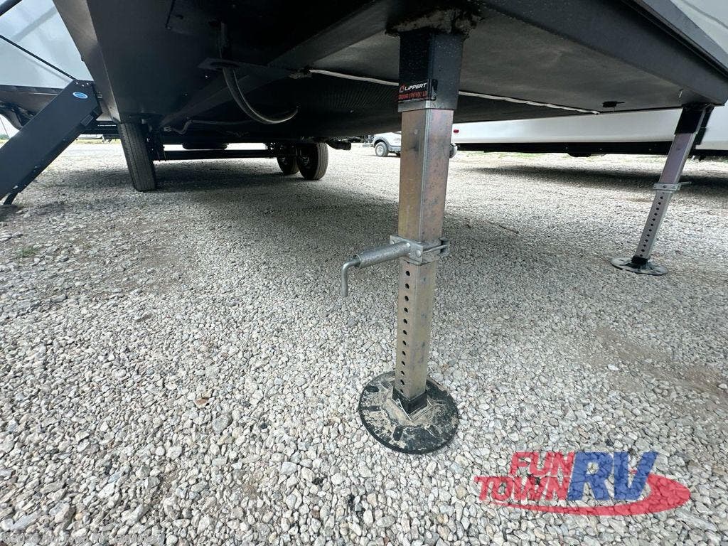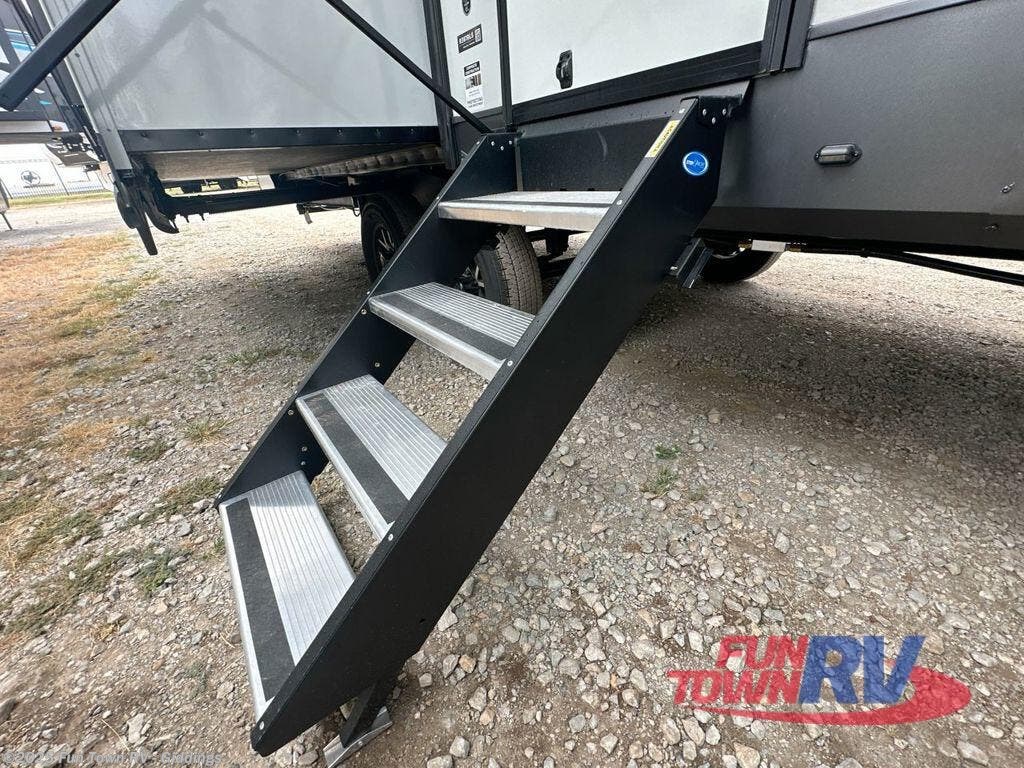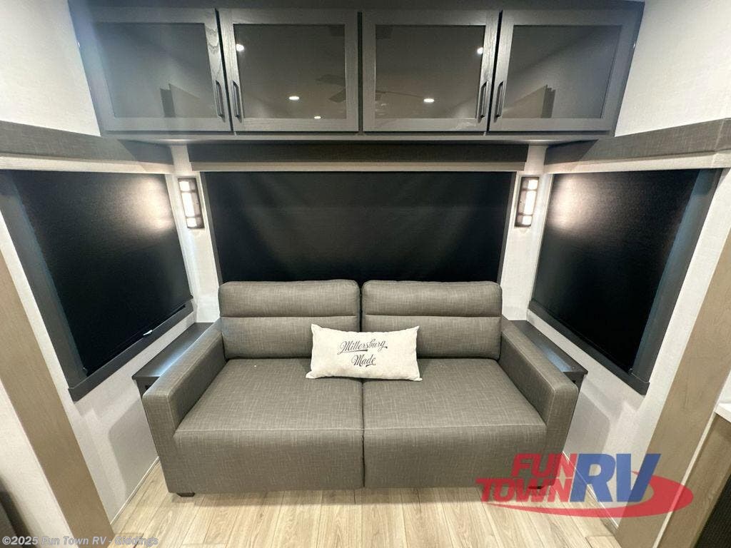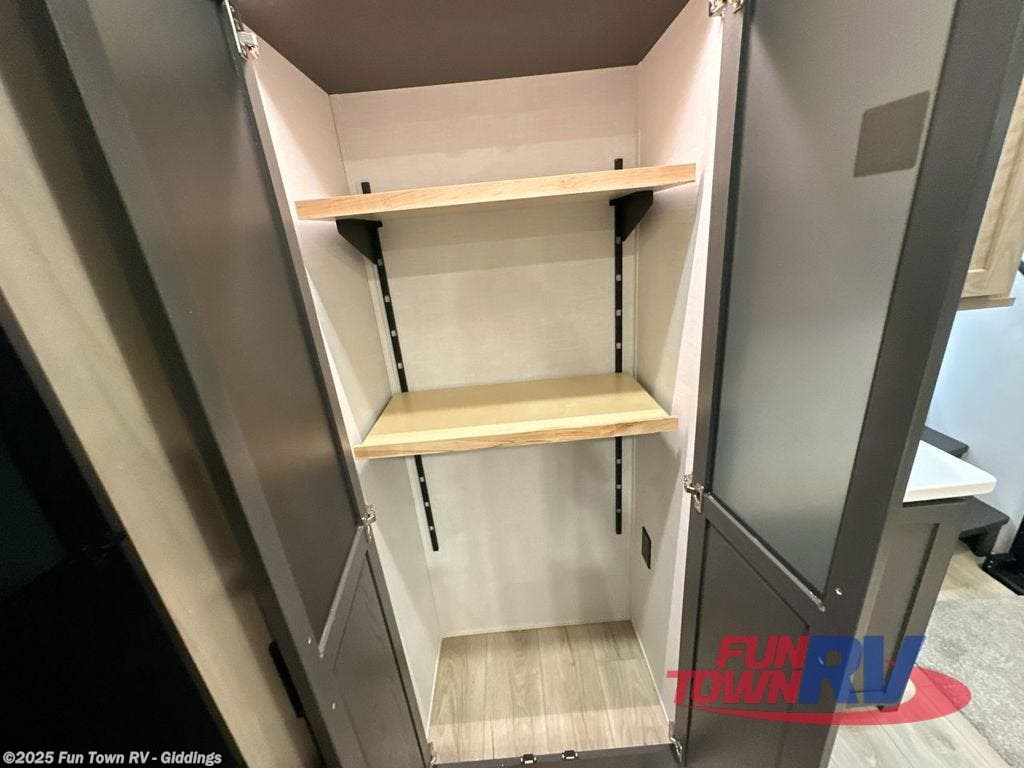 You can enjoy views from inside or outside each day once this RV is set up at the campgrounds! The large windows in the furniture slide and the windows throughout allow you to take in the scenery, and the three slide outs give you a spacious main living and kitchen area as well as front bedroom. You will find lots of seating for guests on the hide-a-bed sofa in the rear, on the theater seats and the table, chairs and bench in the slide. The cook will love the 12V refrigerator and large pantry to store food, and everyone can enjoy the Smart TV and fireplace when visiting and relaxing. The front bedroom offers a king bed slide, a front wardrobe, plus washer and dryer prep if you choose to add those appliances.