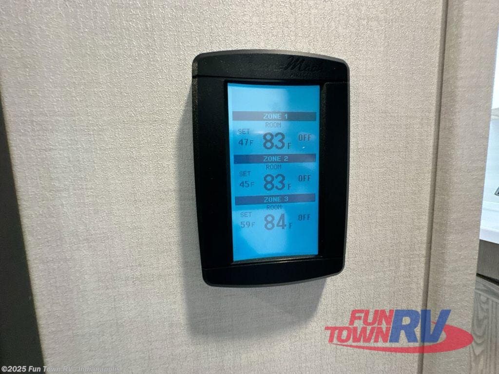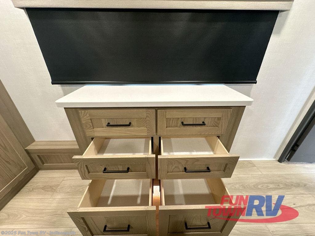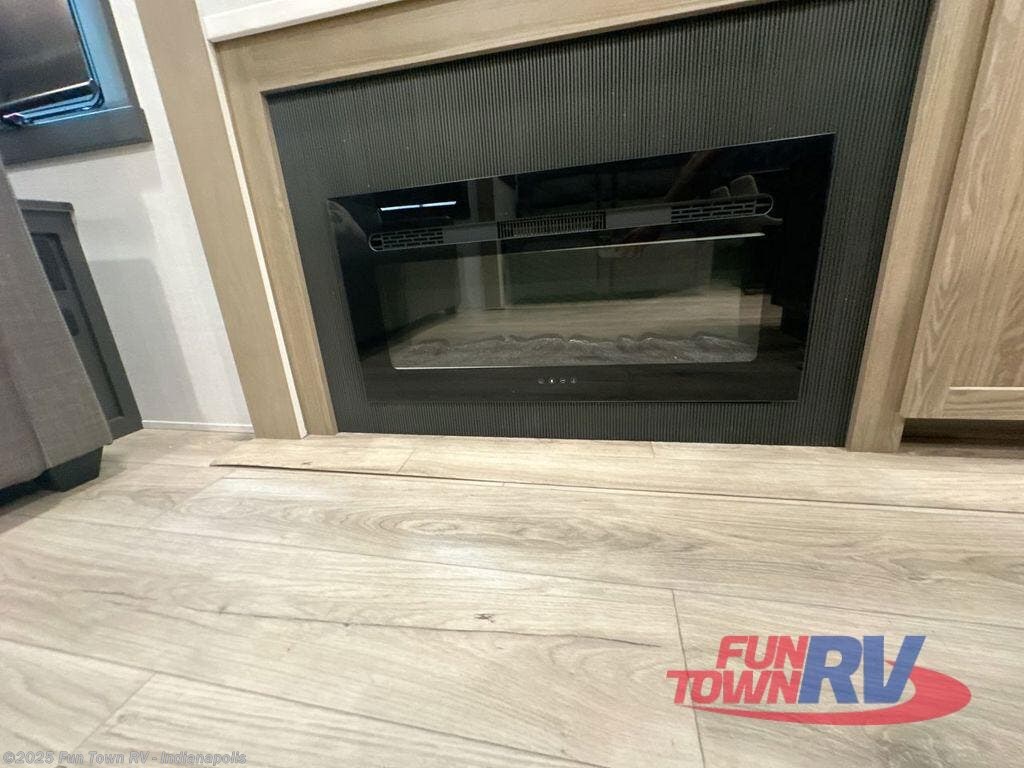 You can enjoy views from inside or outside each day once this RV is set up at the campgrounds! The large windows in the furniture slide and the windows throughout allow you to take in the scenery, and the three slide outs give you a spacious main living and kitchen area as well as front bedroom. You will find lots of seating for guests on the hide-a-bed sofa in the rear, on the theater seats and the table, chairs and bench in the slide. The cook will love the 12V refrigerator and large pantry to store food, and everyone can enjoy the Smart TV and fireplace when visiting and relaxing. The front bedroom offers a king bed slide, a front wardrobe, plus washer and dryer prep if you choose to add those appliances.