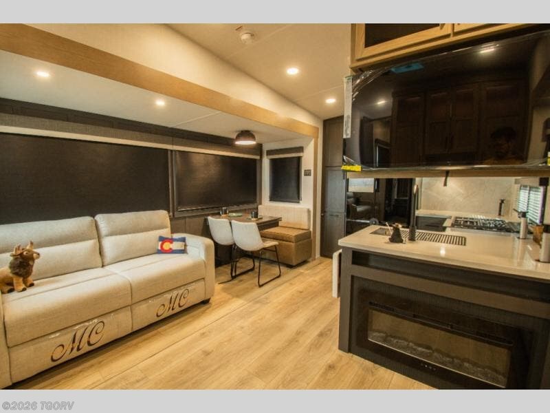 This rear kitchen fifth wheel is the perfect coach for a couple, or one that likes to entertain overnight guests. With two hide-a-bed sofas, one 60" and the other 68", you will have plenty of room for taking along extra family or friends on your adventures. The kitchen is tucked in the back and features a u-shaped counter area, and there is a table, chairs & bench within the slide that houses the 68" HAB sofa. You could also choose the optional theater seating in place of this hide-a-bed if you don't need the extra sleeping space. There is also a 60" theater seat for movie night opposite the TV/fireplace. Head up the steps to your private front bedroom with slide out queen bed, dresser, and large wardrobe with washer and dryer prep. The bathroom is at the top of the steps up and includes a large shower, linen cabinet and sink, plus a toilet. This unit also features ample storage on the outside as well as on the interior.