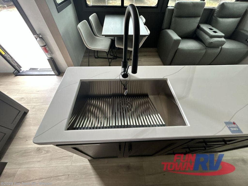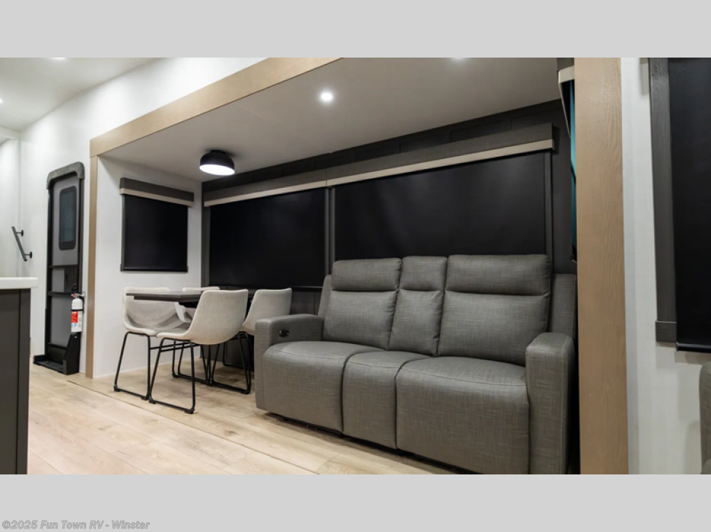 This well-designed layout offers both comfort and functionality. The 72" x 80" king bed provides a spacious and restful sleeping area in the main bedroom. Just steps away, the full front bathroom includes a shower seat for added accessibility, while a convenient half bath near the entrance is perfect for quick use. The kitchen features solid surface countertops and a large island, giving the cook plenty of room to move and work comfortably, along with a rotating table and chairs for dinner and board games. A pull-out desk creates a dedicated space for working away from home, and the 76" hide-a-bed adds extra sleeping space for the whole gang.