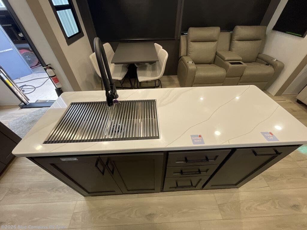 This well-designed layout offers both comfort and functionality. The 72" x 80" king bed provides a spacious and restful sleeping area in the main bedroom. Just steps away, the full front bathroom includes a shower seat for added accessibility, while a convenient half bath near the entrance is perfect for quick use. The kitchen features solid surface countertops and a large island, giving the cook plenty of room to move and work comfortably, along with a rotating table and chairs for dinner and board games. A pull-out desk creates a dedicated space for working away from home, and the 76" hide-a-bed adds extra sleeping space for the whole gang.