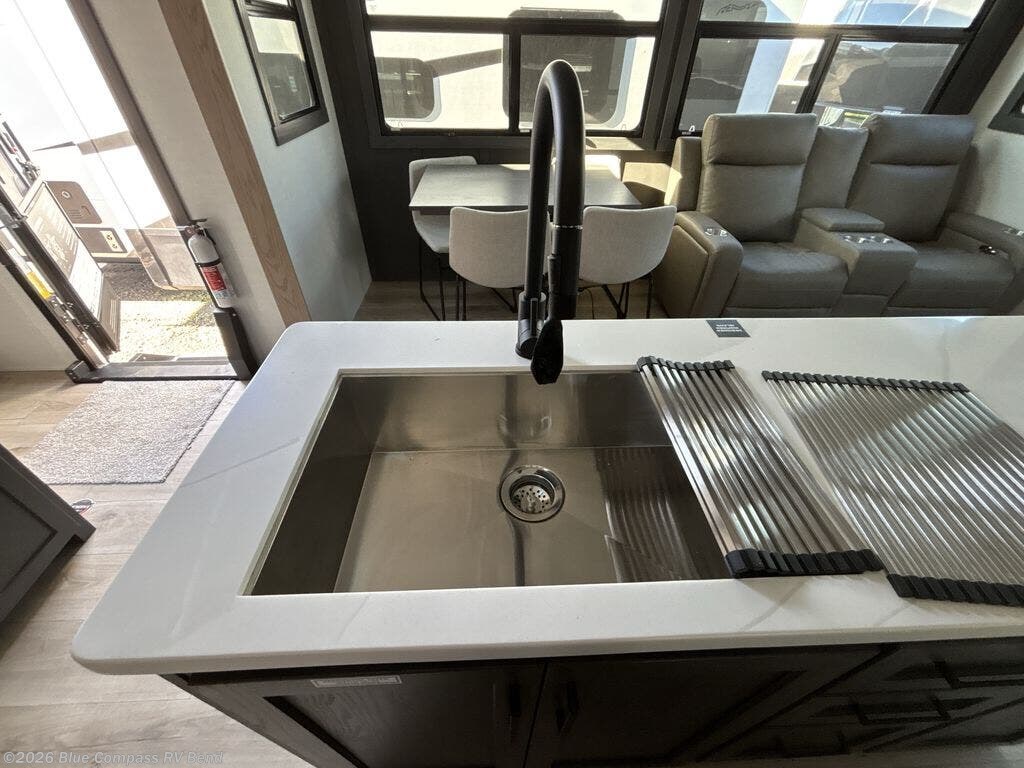 This well-designed layout offers both comfort and functionality. The 72" x 80" king bed provides a spacious and restful sleeping area in the main bedroom. Just steps away, the full front bathroom includes a shower seat for added accessibility, while a convenient half bath near the entrance is perfect for quick use. The kitchen features solid surface countertops and a large island, giving the cook plenty of room to move and work comfortably, along with a rotating table and chairs for dinner and board games. A pull-out desk creates a dedicated space for working away from home, and the 76" hide-a-bed adds extra sleeping space for the whole gang.