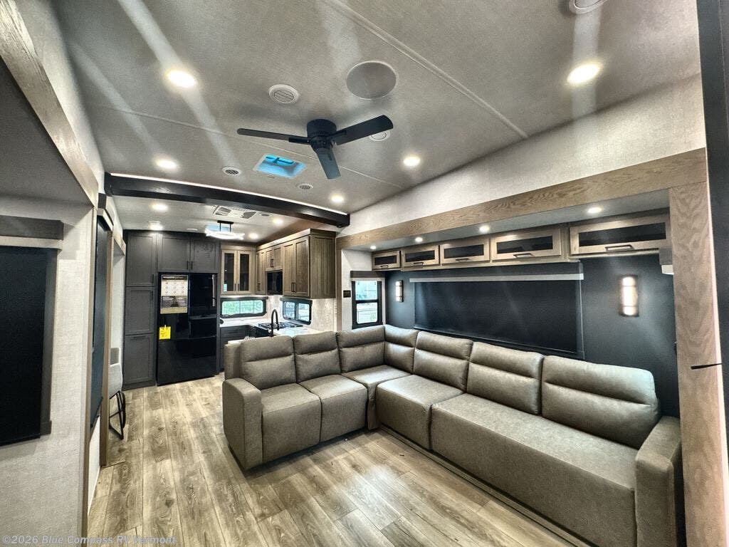 This thoughtfully designed layout begins at the front with a spacious full bedroom featuring a 72" x 80" king bed in a slide-out, giving you extra walking room without sacrificing a great night’s sleep. A wardrobe to the side and a dresser across the bed provide ample storage for clothing and everyday essentials. Down the hall, the full bathroom offers added convenience with a linen closet for towels and toiletries, along with double sinks so two people can get ready comfortably at the same time. The center living area is perfect for relaxing or entertaining, showcasing a large L-shaped sofa made up of a 52" theater seat, a 66" fixed corner sofa, and a 54" hide-a-bed, all positioned across from the TV and fireplace. A desk in an opposite slide-out creates a dedicated space to work from home if needed. At the rear, the kitchen delivers generous counterspace and overhead cabinetry, equipped with a residential gas range, microwave, and 12V refrigerator, plus a nearby pantry for dry goods. Across from the kitchen, a slide-out with a table and chairs provides the ideal spot for meals or gathering together for games and conversation.