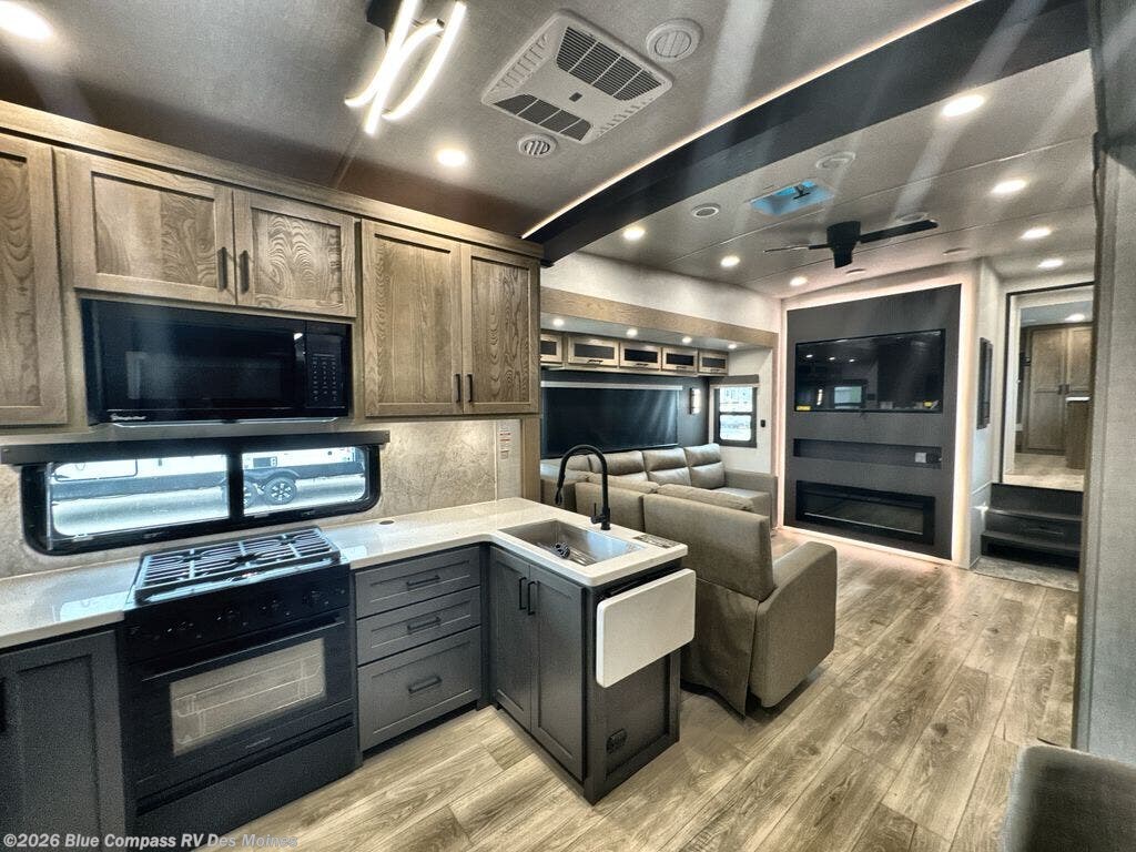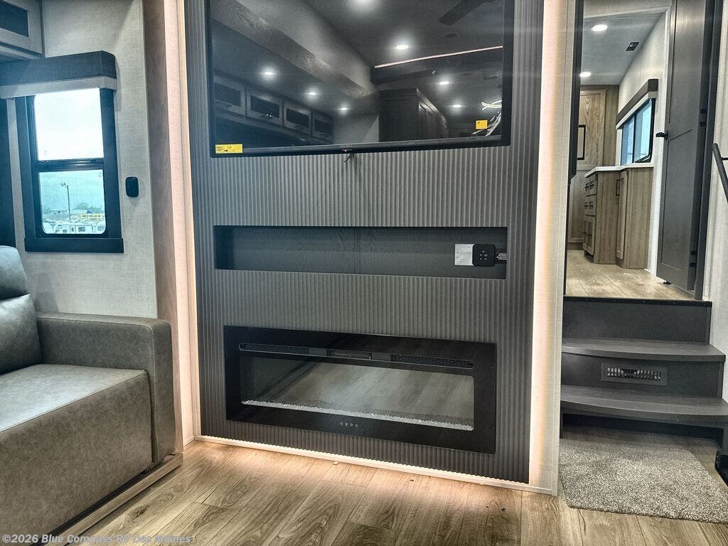 This thoughtfully designed layout begins at the front with a spacious full bedroom featuring a 72" x 80" king bed in a slide-out, giving you extra walking room without sacrificing a great night’s sleep. A wardrobe to the side and a dresser across the bed provide ample storage for clothing and everyday essentials. Down the hall, the full bathroom offers added convenience with a linen closet for towels and toiletries, along with double sinks so two people can get ready comfortably at the same time. The center living area is perfect for relaxing or entertaining, showcasing a large L-shaped sofa made up of a 52" theater seat, a 66" fixed corner sofa, and a 54" hide-a-bed, all positioned across from the TV and fireplace. A desk in an opposite slide-out creates a dedicated space to work from home if needed. At the rear, the kitchen delivers generous counterspace and overhead cabinetry, equipped with a residential gas range, microwave, and 12V refrigerator, plus a nearby pantry for dry goods. Across from the kitchen, a slide-out with a table and chairs provides the ideal spot for meals or gathering together for games and conversation.