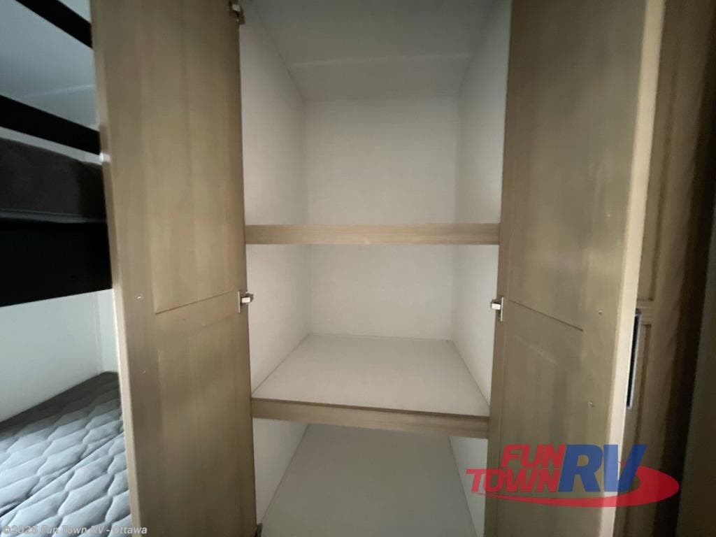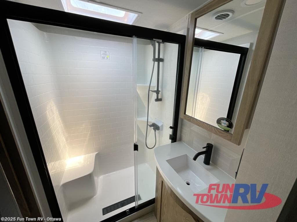 Designed with comfort and practicality in mind, this fifth wheel RV makes extended travel feel just like home. Each room is equipped with two large wardrobes, offering abundant space for clothing and storage this is perfect for families or long getaways with the whole gang. The spacious living and dining area allows everyone to move around freely without feeling cramped. A shower with a built-in seat adds a layer of comfort and accessibility. In the rear bunkhouse, a unique double bunk setup provides extra sleeping space so more friends or family members can join in on the adventure.