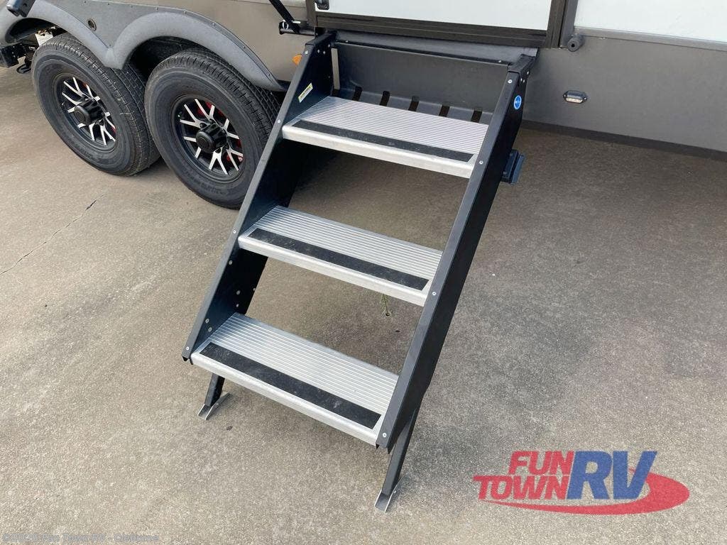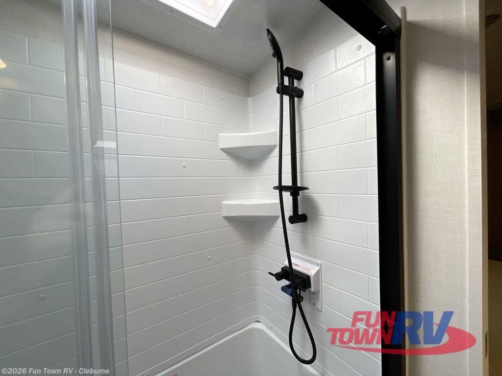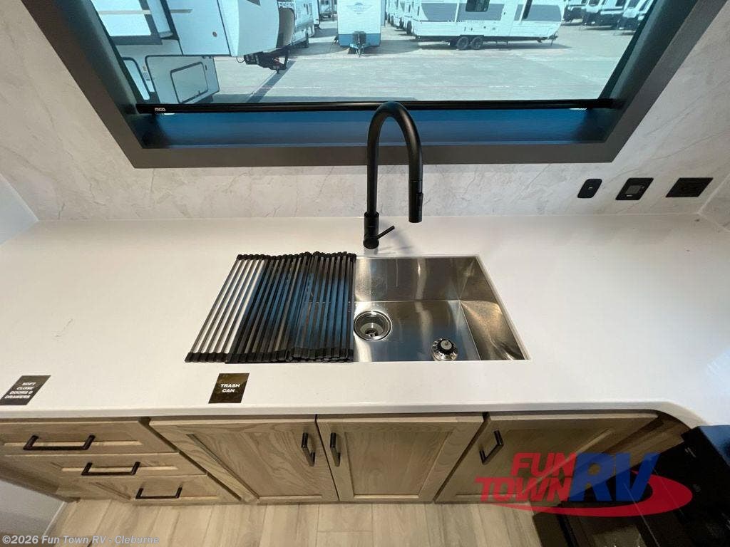 This front kitchen, couple's trailer is ready for adventure when you are! Once you arrive at your destination, prepare a quick lunch with the Griddle Prep, and enjoy the shade provided by the 19' power awning. You can eat outside, or inside at the counter with stools. The 67" theatre seat will make this travel trailer feel more like home, and the double slides provide more space to stretch out. Within the master bedroom you'll find a king bed, a large wardrobe and a dresser, plus an optional TV. And check out the full rear bath with dual bath sinks and a shower with a seat! Now, that's what I call comfort!