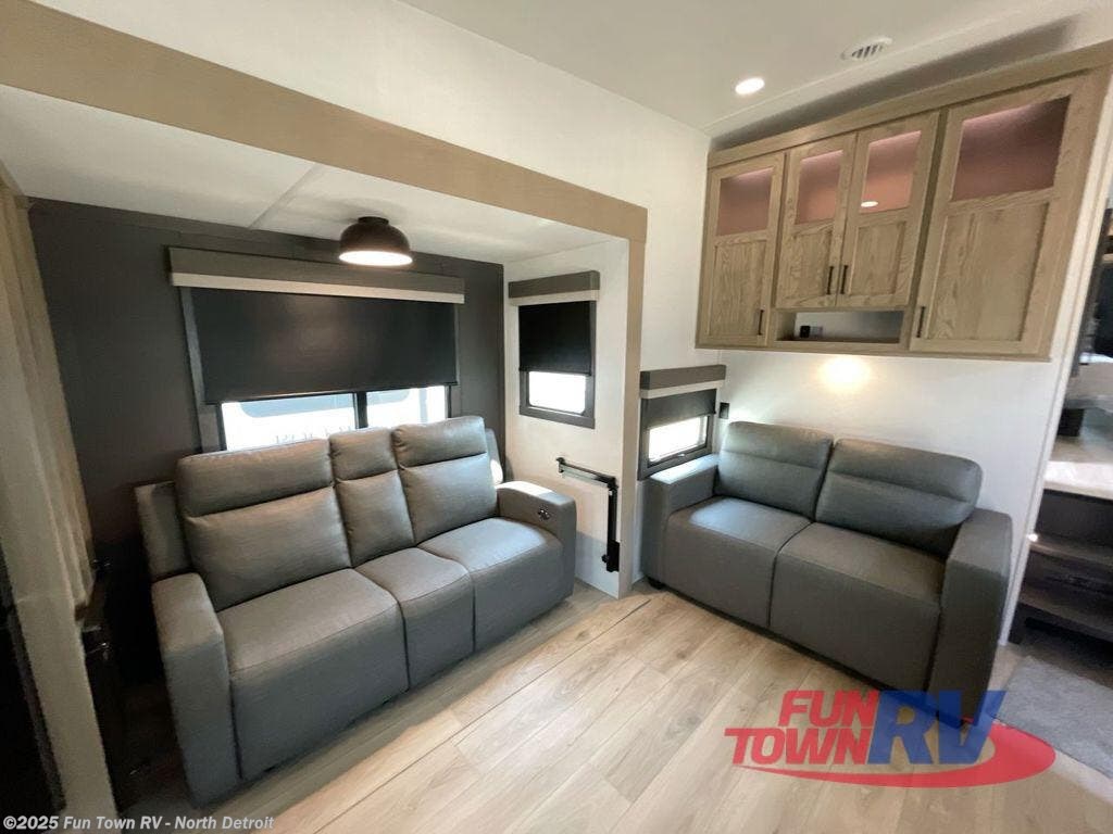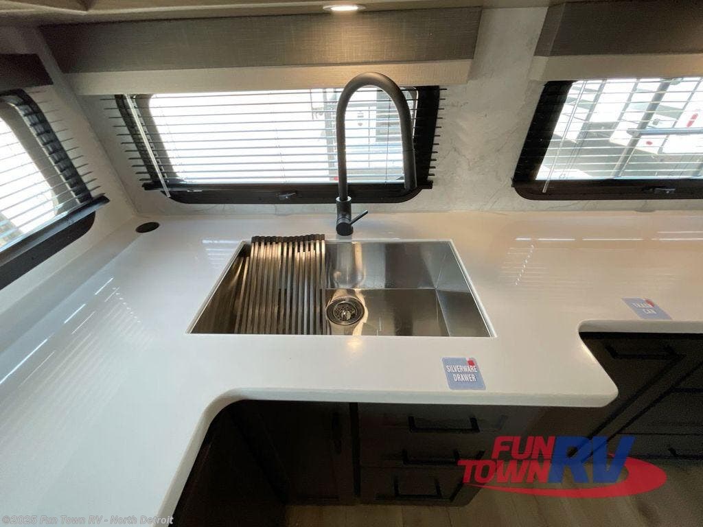 Why not have enough space for all your RVing friends to visit when you camp? This RV offers the perfect living and kitchen area with a large slide giving everyone more floor space, plus there is a king U-shaped dinette and a hide-a-bed sofa to sit on, a fireplace to enjoy and a Smart TV to watch a game or movie together. The cook will love the rear kitchen with extra counter space along a side wall to leave all the snacks and treats for everyone. You might even take everyone outside to enjoy the 21' power awning that offers an outdoor living area with some protection and LED lighting; just grab your camping chairs from the pass-through storage. At night, you can retire to the front bedroom with a queen bed, a spacious wardrobe, plus a TV option if you enjoy movies in bed!