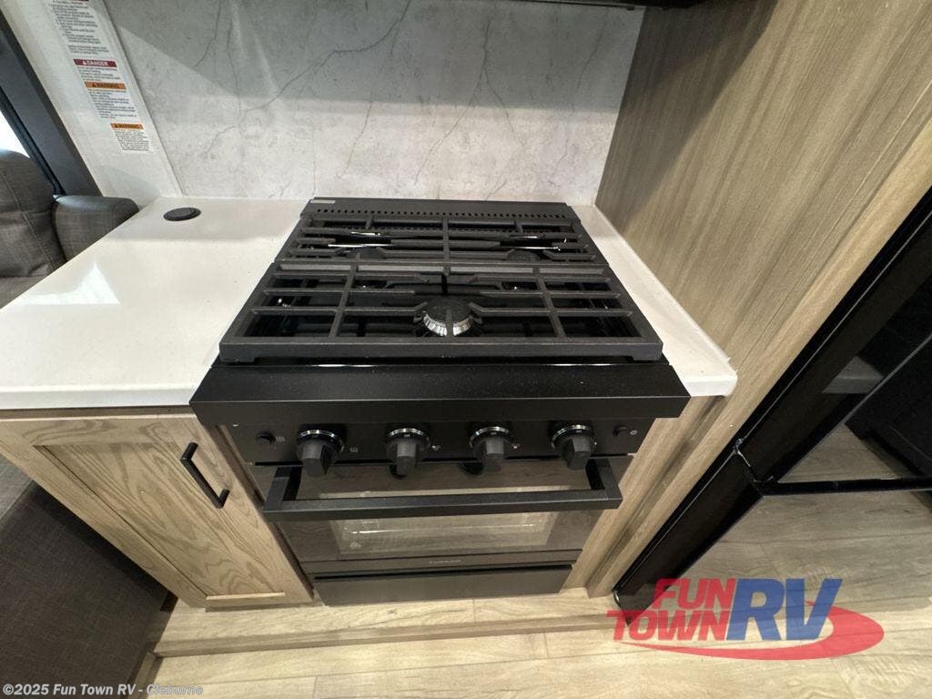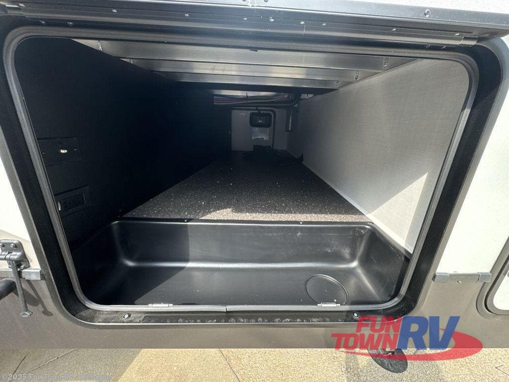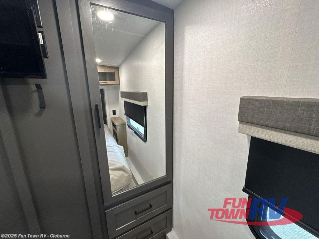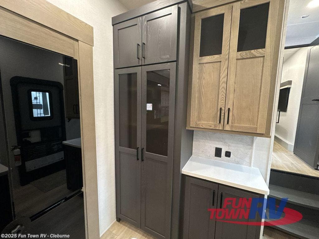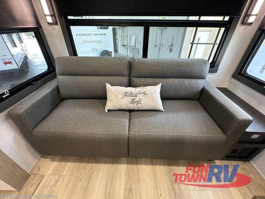 You can enjoy views from inside or outside each day once this RV is set up at the campgrounds! The large windows in the furniture slide and the windows throughout allow you to take in the scenery, and the dual opposing slides give you a spacious main living and kitchen area. You will find lots of seating for guests on the hide-a-bed sofa in the rear, and on the theater seats and table in the slide. The cook will love the 12V refrigerator and large pantry to store food, and everyone can enjoy the Smart TV and fireplace when visiting and relaxing. This unit also includes a pull-out desk which will be perfect if you plan to telecommute. And don't overlook the front private bedroom with its queen bed, wardrobe, and TV option!