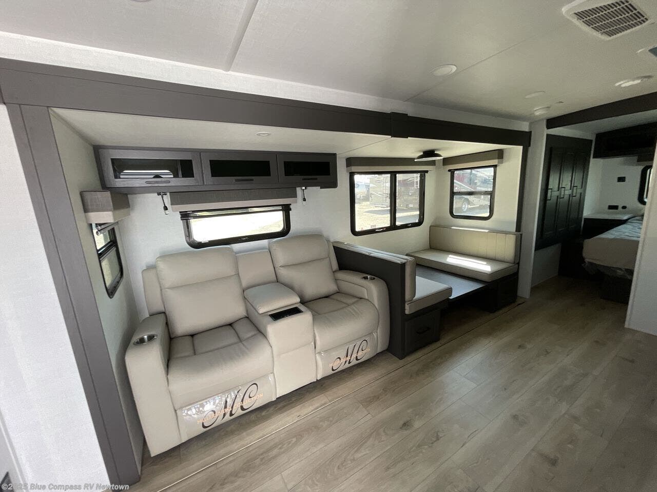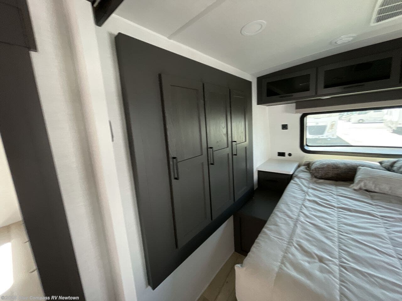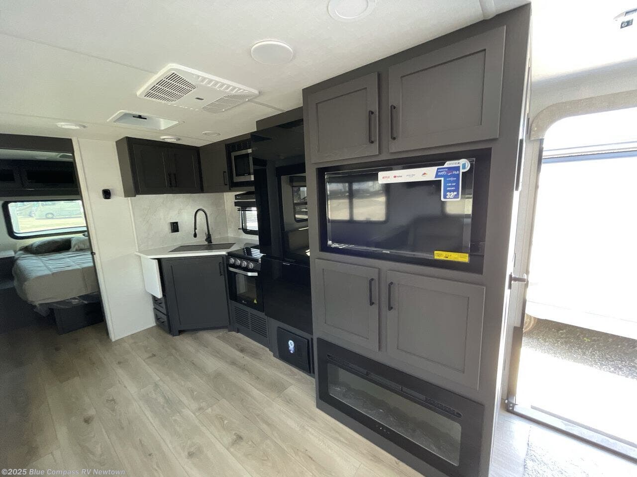 This trailer is the perfect couple's retreat with its private bedroom up front which includes a queen bed, a slide out wardrobe, and a TV option. The spacious rear full bathroom provides a shower and linen storage, and a space savings sliding door. The cook will have full amenities with ample counter space, a walk-in pantry for food storage, and a three burner range to cook meals on. If the weather is nice outside, you can make dinner on the exterior griddle, and there is a 21' awning to relax under. Or you can stay inside to enjoy the fireplace and Smart TV! You will also appreciate the pass thru storage with an optional steel sliding tray to easily access gear!