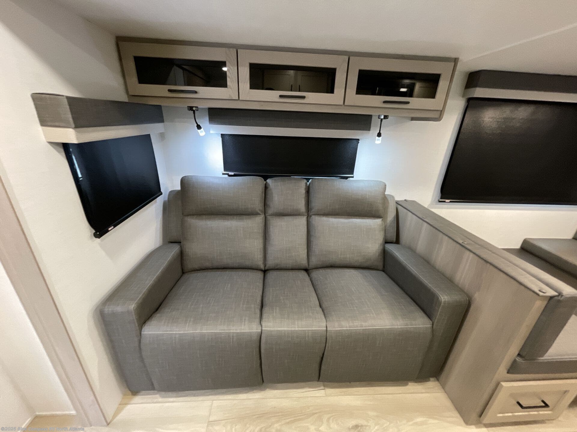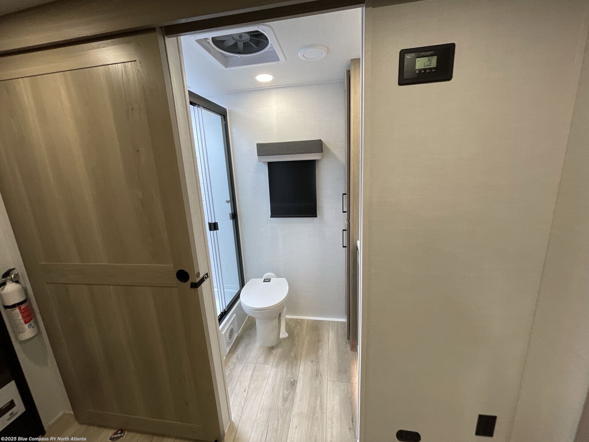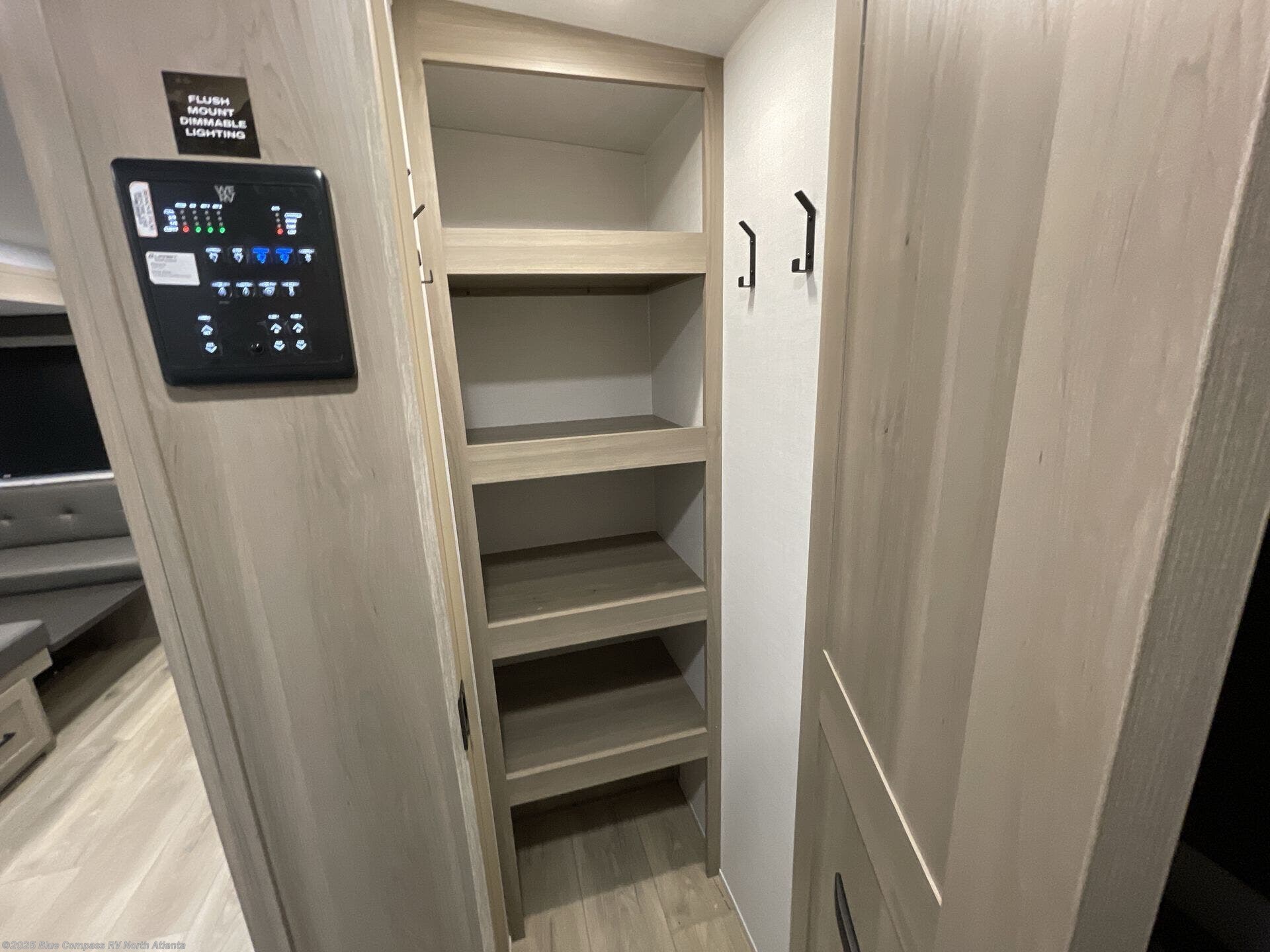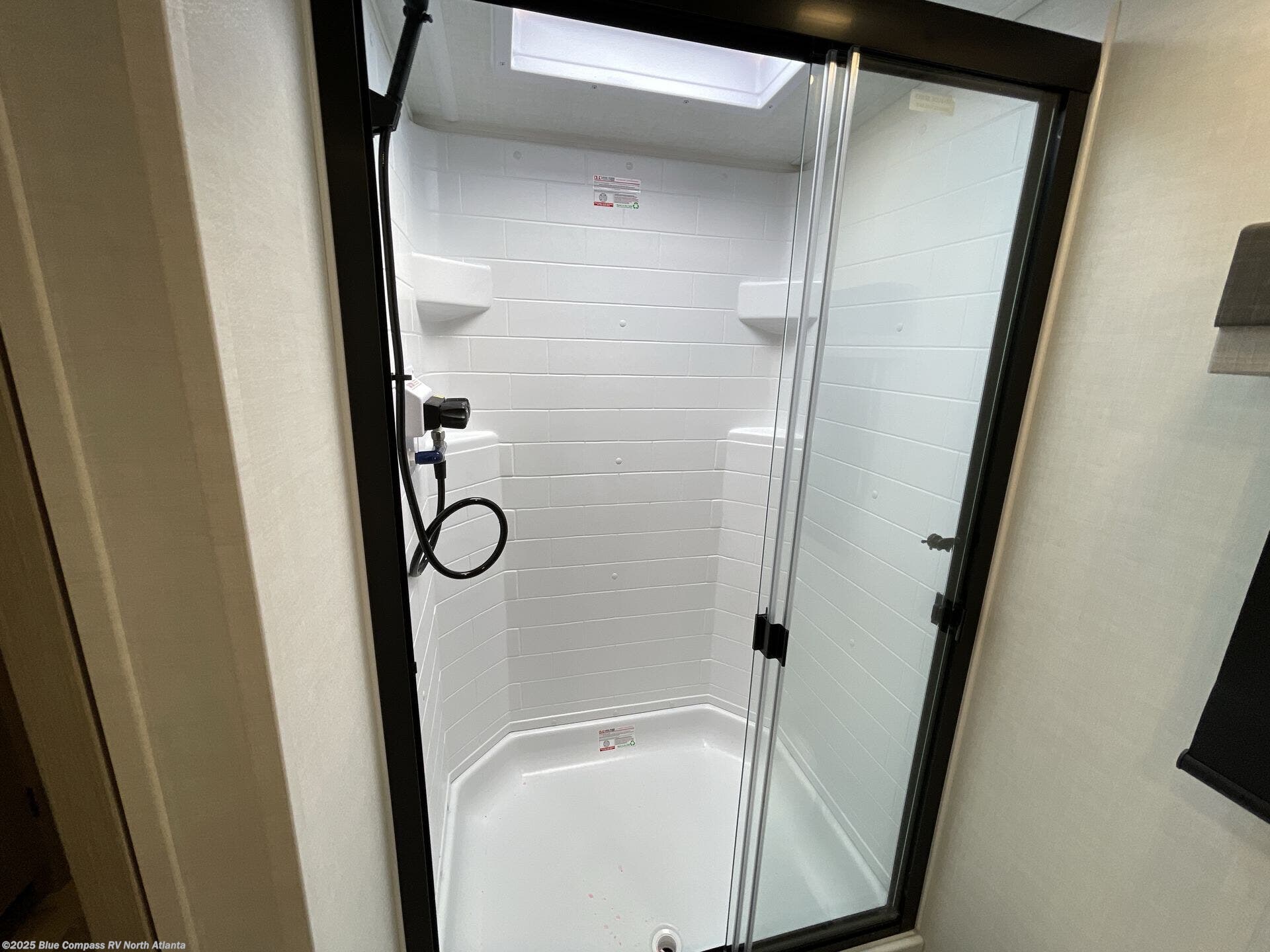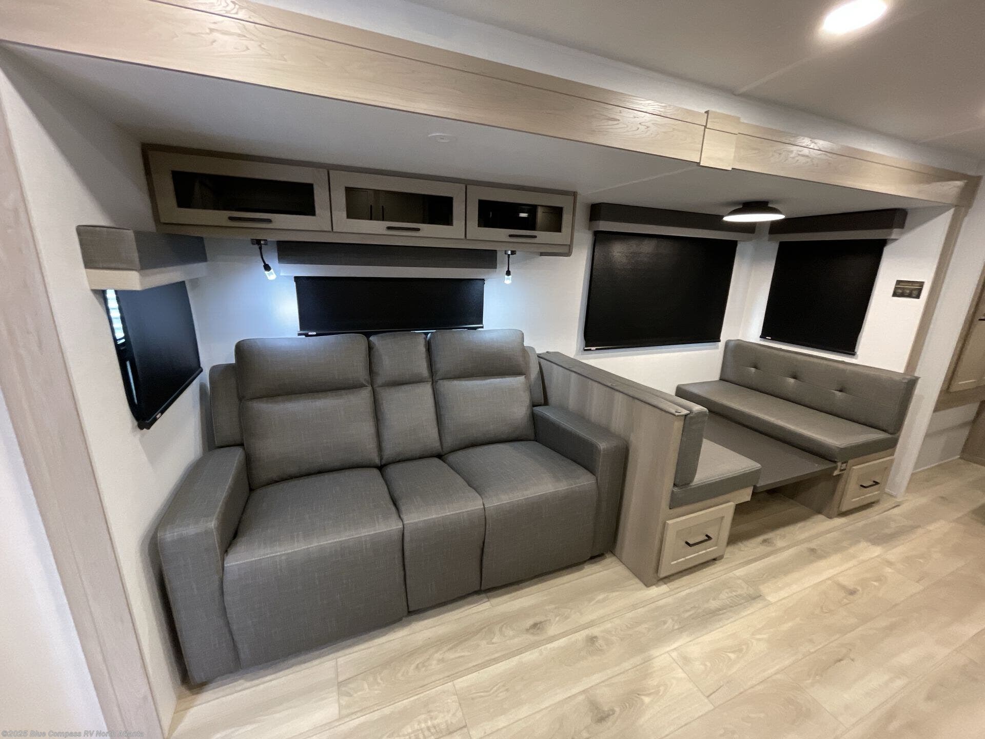 This trailer is the perfect couple's retreat with its private bedroom up front which includes a queen bed, a slide out wardrobe, and a TV option. The spacious rear full bathroom provides a shower and linen storage, and a space savings sliding door. The cook will have full amenities with ample counter space, a walk-in pantry for food storage, and a three burner range to cook meals on. If the weather is nice outside, you can turn on the outside speakers to enjoy music, and there is a 21' awning to relax under. Or you can stay inside to enjoy the fireplace and Smart TV! You will also appreciate the pass thru storage with an optional steel sliding tray to easily access gear!