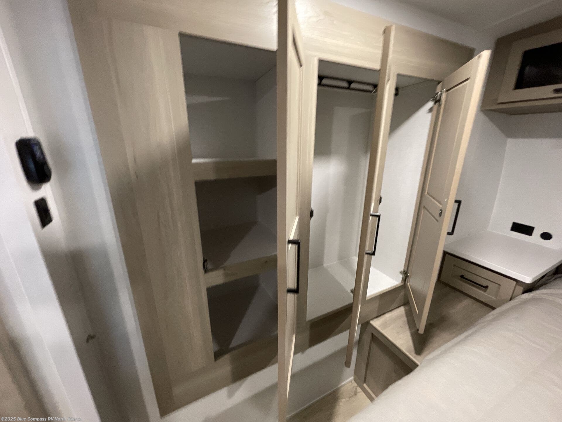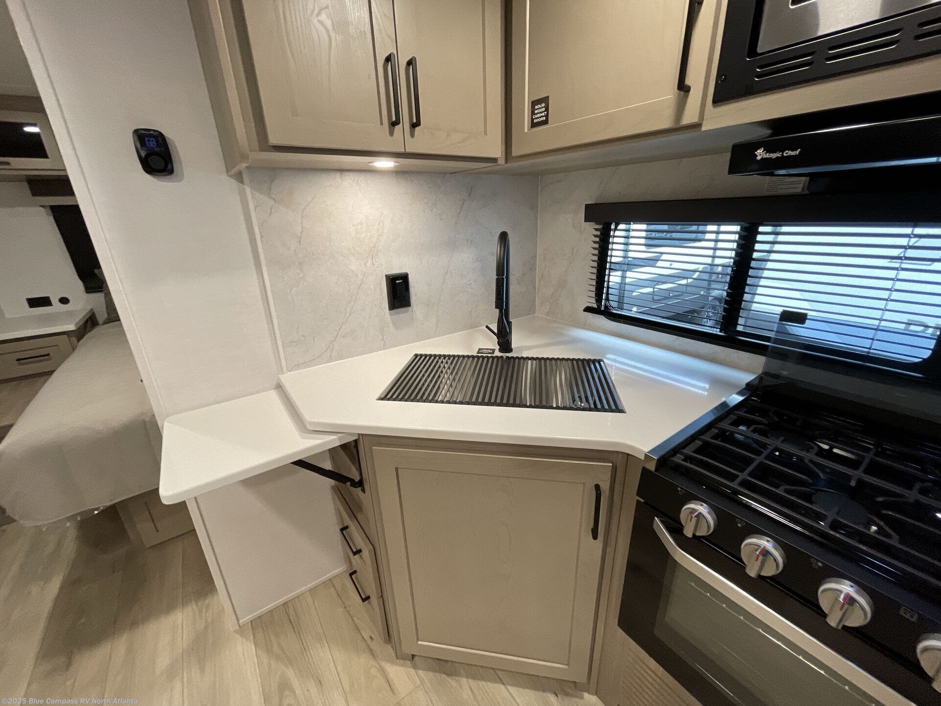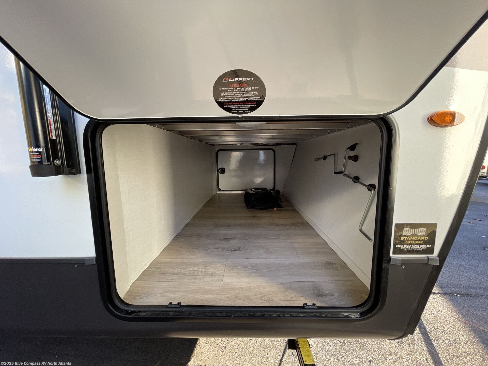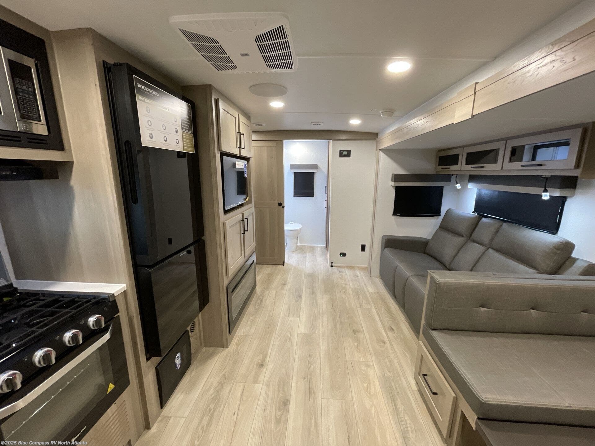 This trailer is the perfect couple's retreat with its private bedroom up front which includes a queen bed, a slide out wardrobe, and a TV option. The spacious rear full bathroom provides a shower and linen storage, and a space savings sliding door. The cook will have full amenities with ample counter space, a walk-in pantry for food storage, and a three burner range to cook meals on. If the weather is nice outside, you can turn on the outside speakers to enjoy music, and there is a 21' awning to relax under. Or you can stay inside to enjoy the fireplace and Smart TV! You will also appreciate the pass thru storage with an optional steel sliding tray to easily access gear!