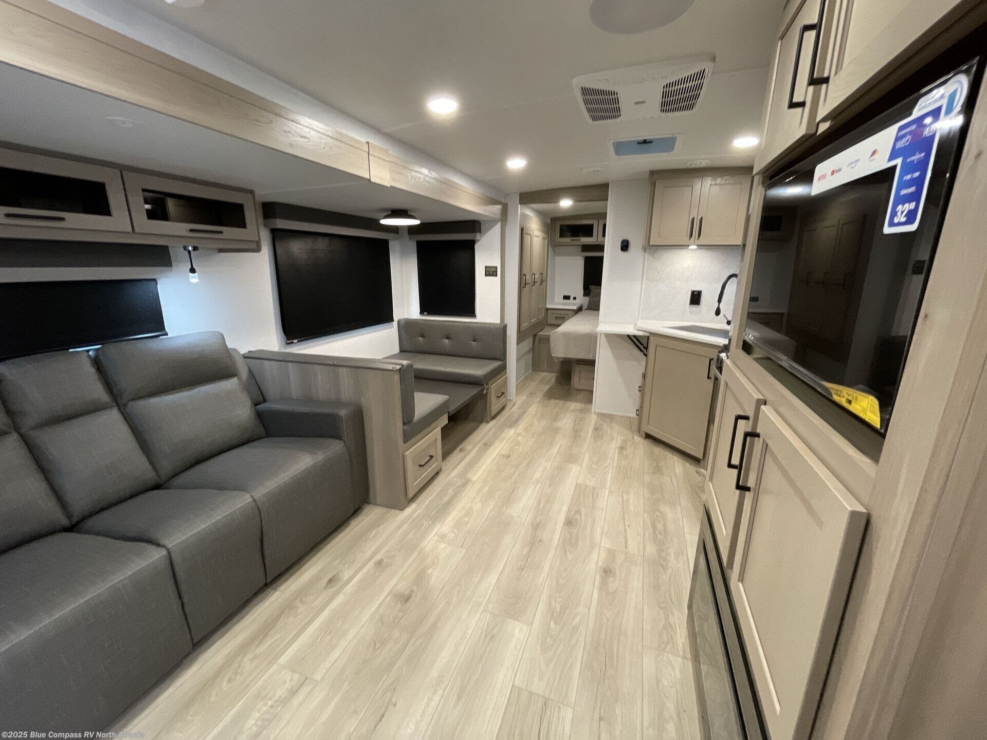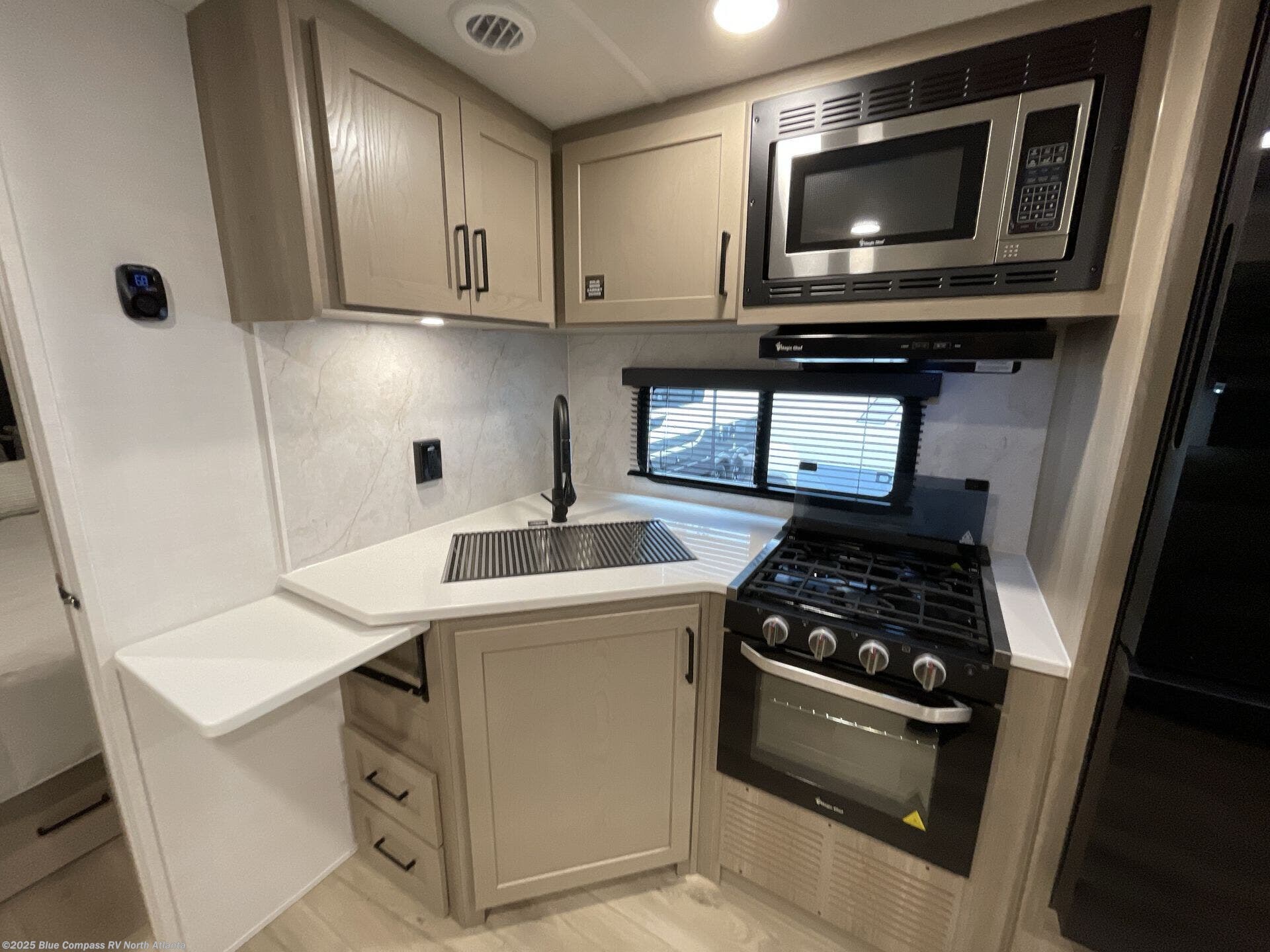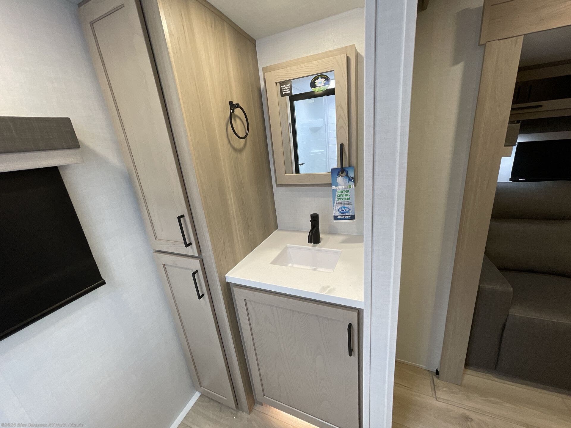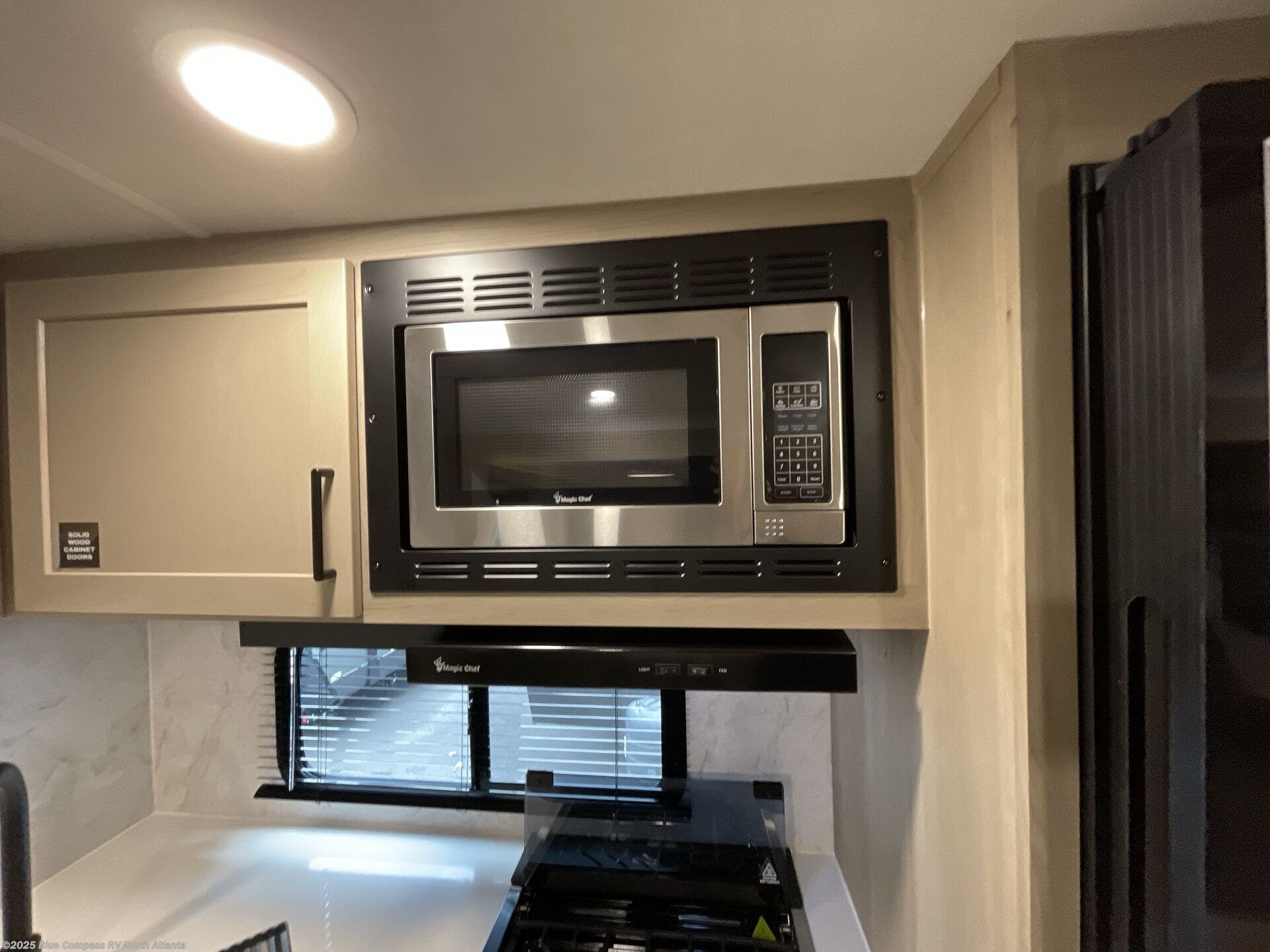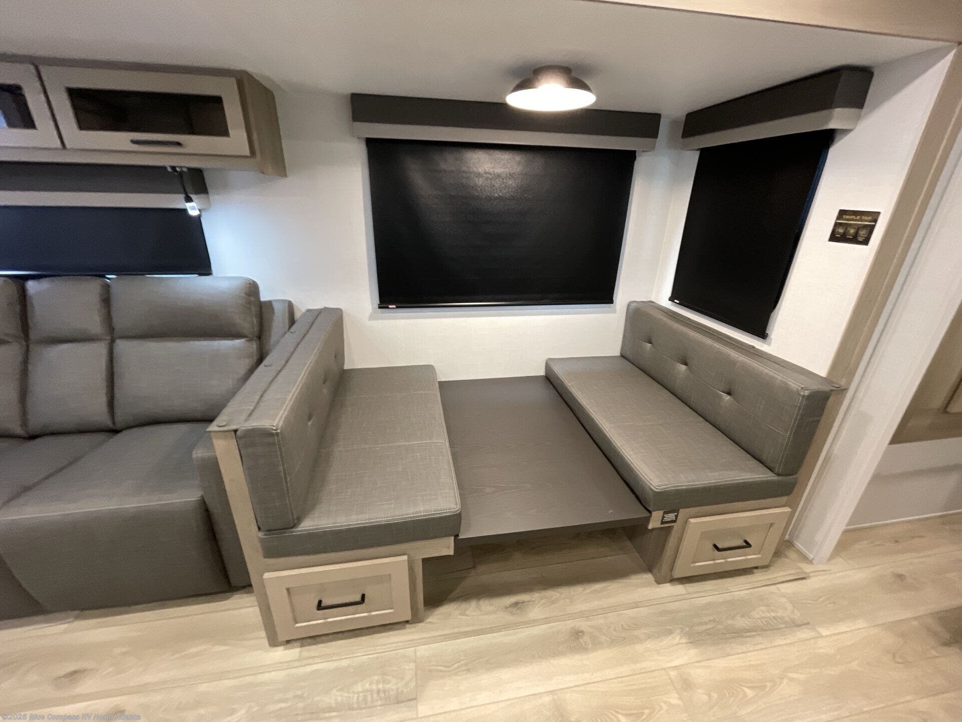 This trailer is the perfect couple's retreat with its private bedroom up front which includes a queen bed, a slide out wardrobe, and a TV option. The spacious rear full bathroom provides a shower and linen storage, and a space savings sliding door. The cook will have full amenities with ample counter space, a walk-in pantry for food storage, and a three burner range to cook meals on. If the weather is nice outside, you can turn on the outside speakers to enjoy music, and there is a 21' awning to relax under. Or you can stay inside to enjoy the fireplace and Smart TV! You will also appreciate the pass thru storage with an optional steel sliding tray to easily access gear!