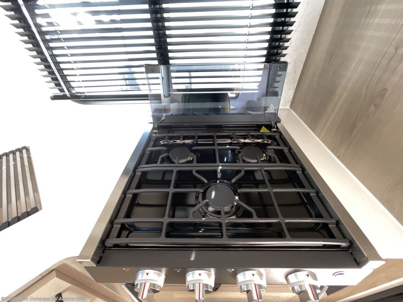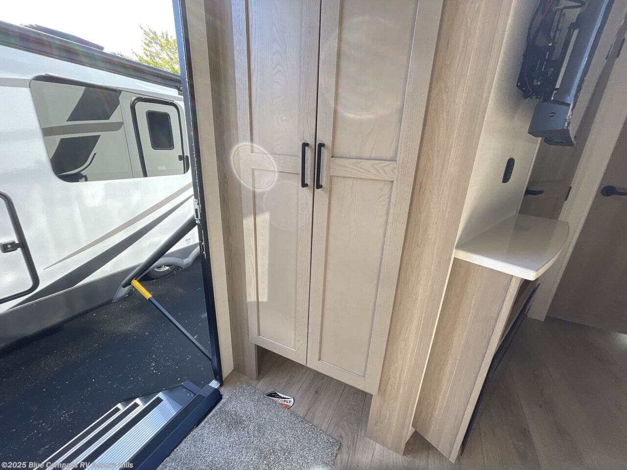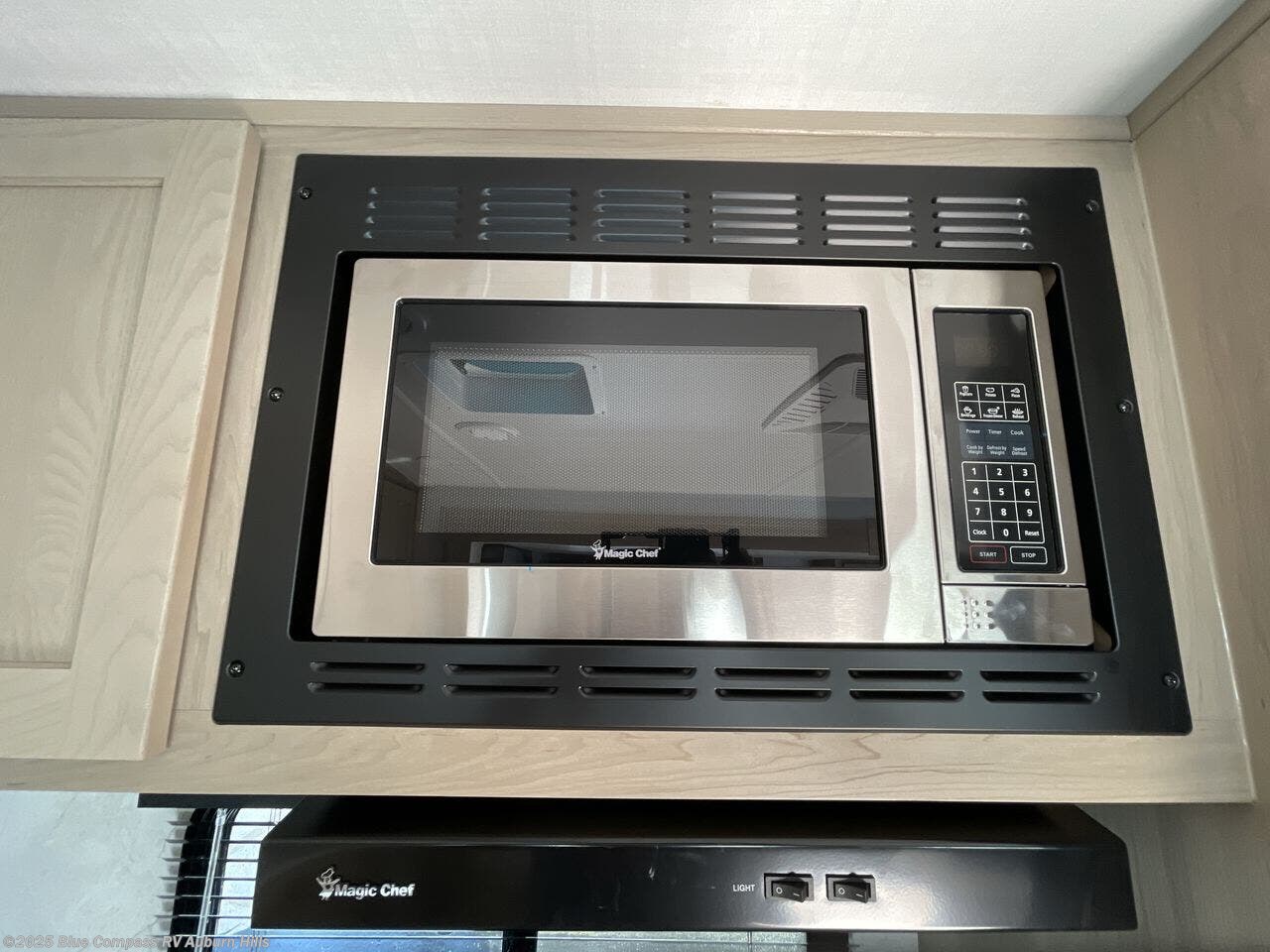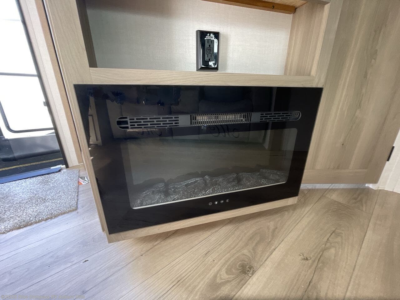 When you are outside this trailer you can enjoy the protection from the 21' power awning, you will falso find exterior storage for your extra gear, and a ladder at the rear. You get to choose which entrance to step up into, be it the spacious rear bedroom with a queen bed slide and a wardrobe, or the main entry into the kitchen and living area. The furniture slide includes a booth dinette to eat your meals at, and theater seating to watch the Smart TV with a fireplace below. And the cook will love the front kitchen with extra counter space, a three-burner range, plus a 12V refrigerator and pantry for food storage!
