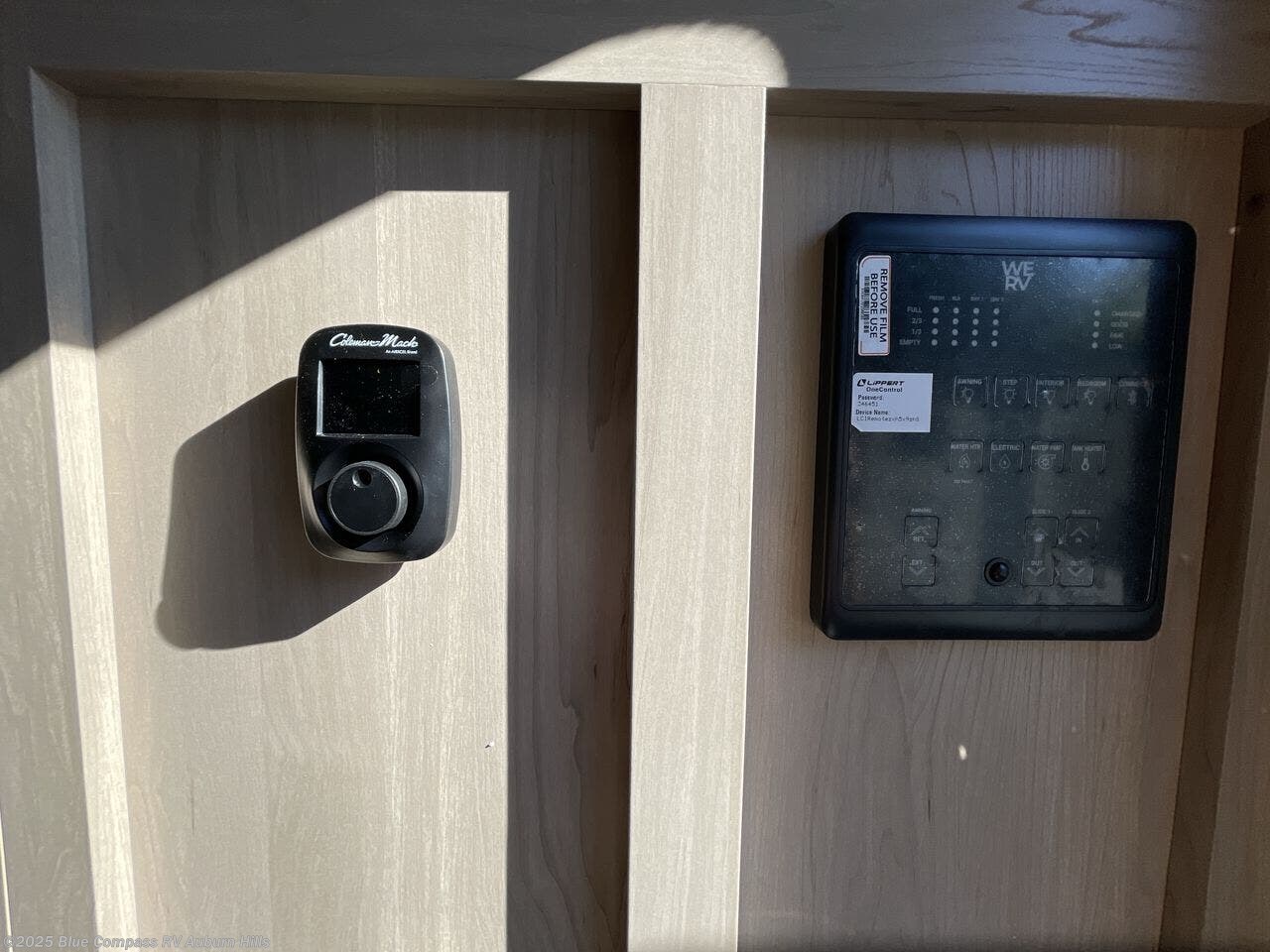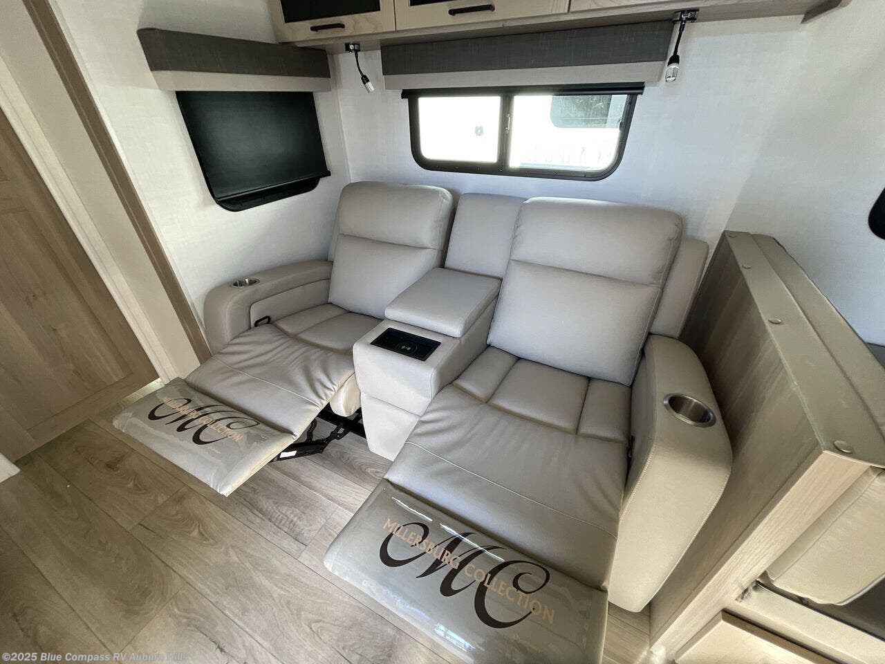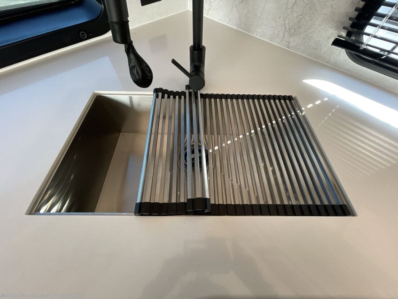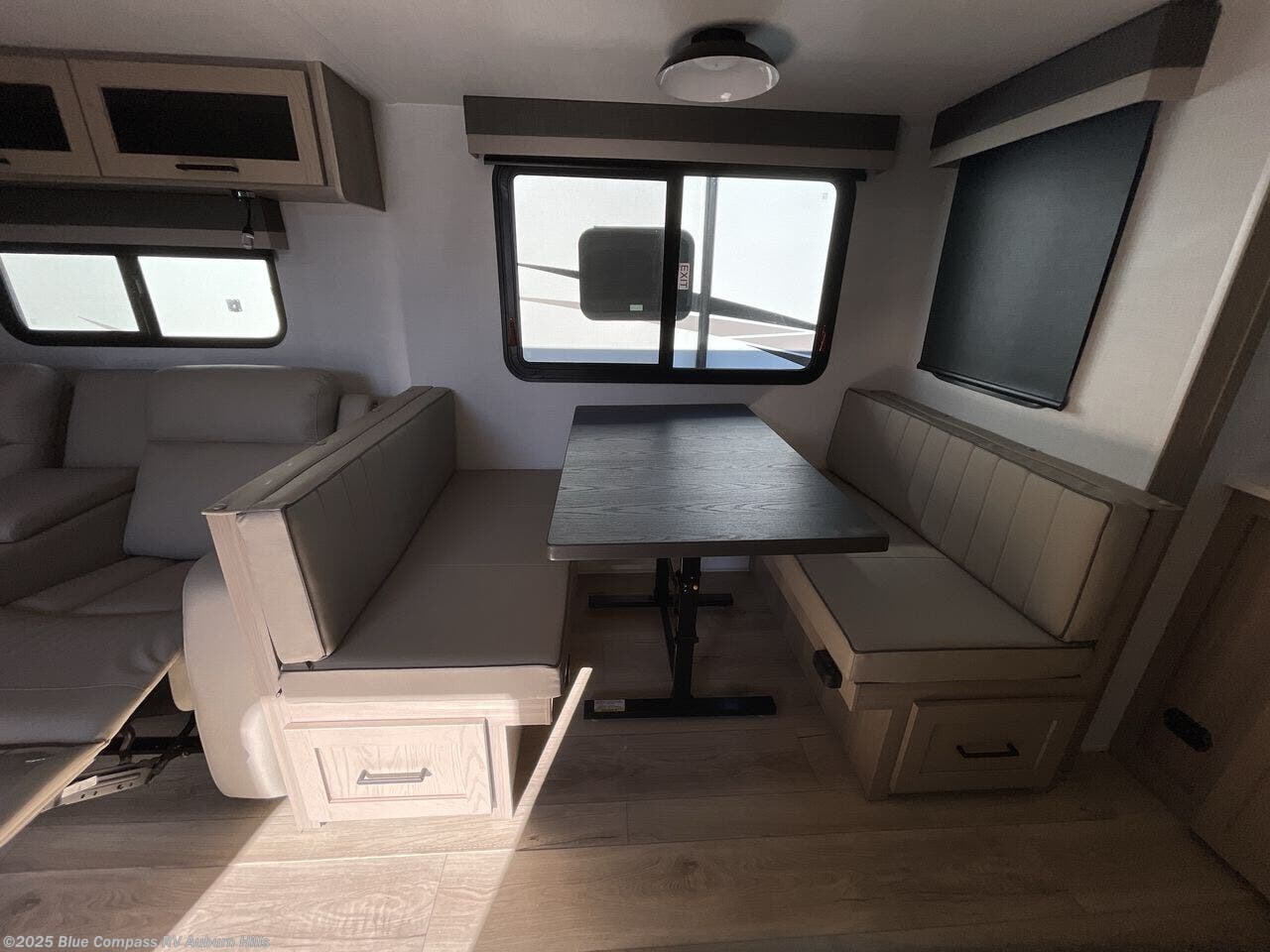 When you are outside this trailer you can enjoy the protection from the 21' power awning, you will falso find exterior storage for your extra gear, and a ladder at the rear. You get to choose which entrance to step up into, be it the spacious rear bedroom with a queen bed slide and a wardrobe, or the main entry into the kitchen and living area. The furniture slide includes a booth dinette to eat your meals at, and theater seating to watch the Smart TV with a fireplace below. And the cook will love the front kitchen with extra counter space, a three-burner range, plus a 12V refrigerator and pantry for food storage!