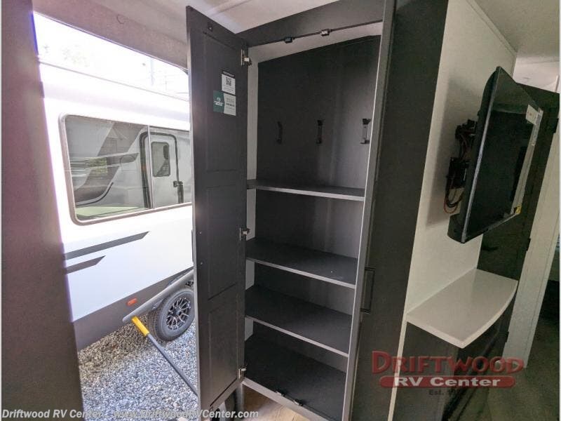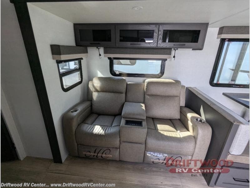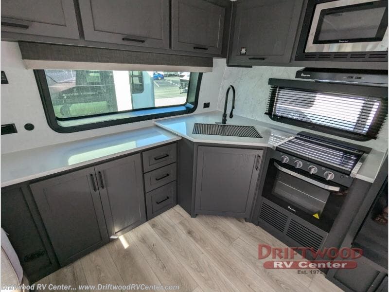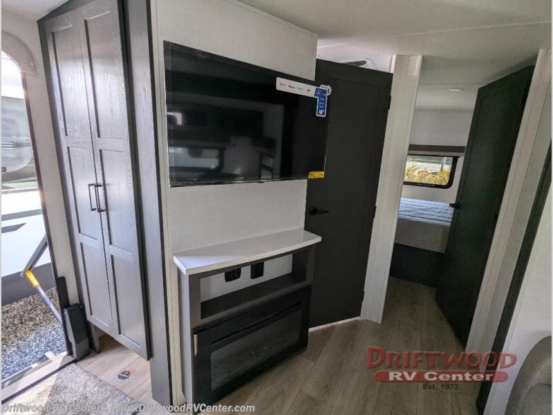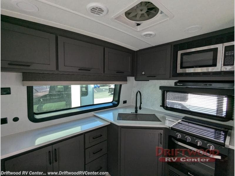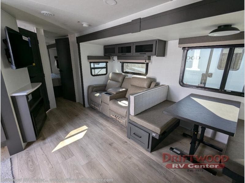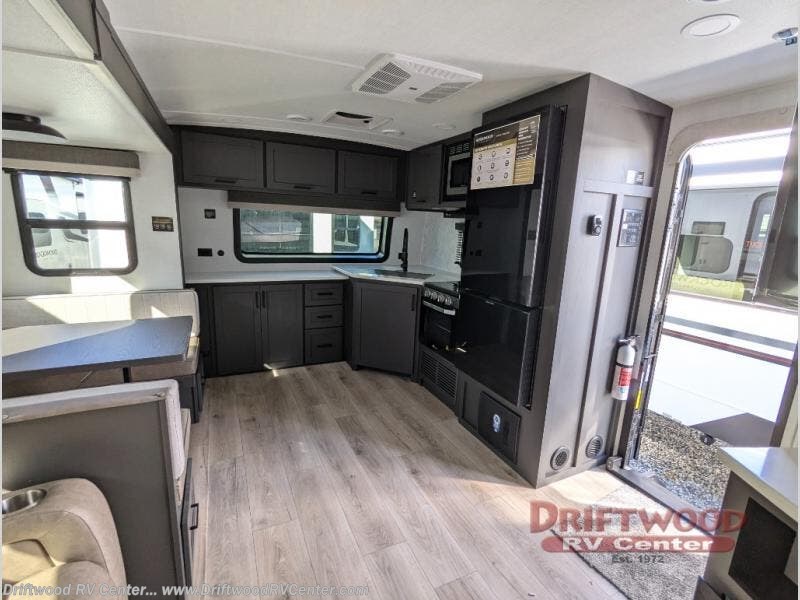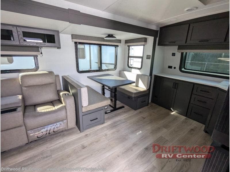 When you are outside this trailer you can enjoy the protection from the 21' power awning, you will also find exterior storage for your extra gear, and a ladder at the rear. You get to choose which entrance to step up into, be it the spacious rear bedroom with a queen bed slide and a wardrobe, or the main entry into the kitchen and living area. The furniture slide includes a booth dinette to eat your meals at, and theater seating to watch the Smart TV with a fireplace below. And the cook will love the front kitchen with extra counter space, a three-burner range, plus a 12V refrigerator and pantry for food storage!