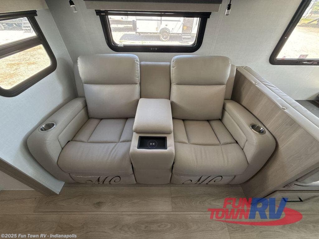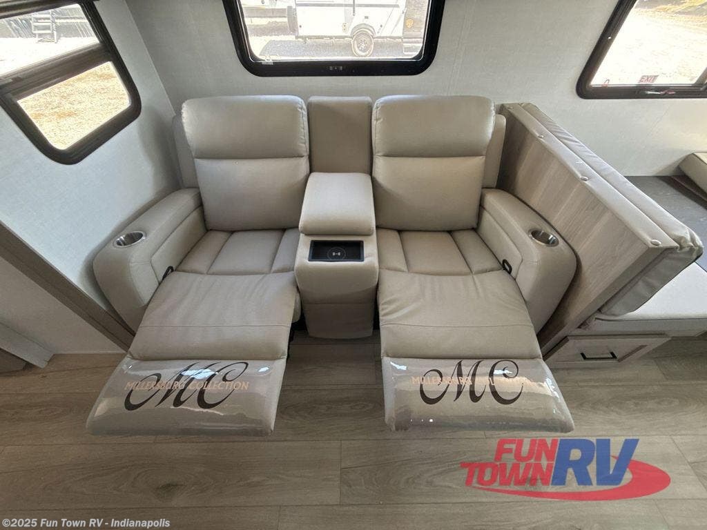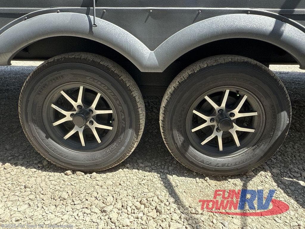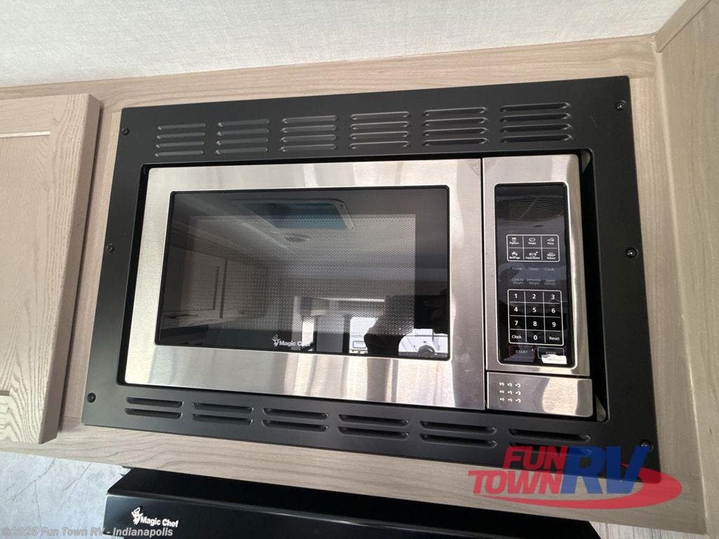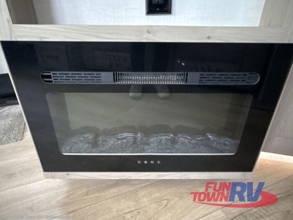 When you are outside this trailer you can enjoy the protection from the 21' power awning, and whip up a meal using the outside griddle. You will find exterior storage for your extra gear, and a ladder at the rear. You get to choose which entrance to step up into, be it the spacious rear bedroom with a queen bed slide and a wardrobe, or the main entry into the kitchen and living area. The furniture slide includes a booth dinette to eat your meals at, and theater seating to watch the Smart TV with a fireplace below. And the cook will love the front kitchen with extra counter space, a three burner range, plus a 12V refrigerator and pantry for food storage!