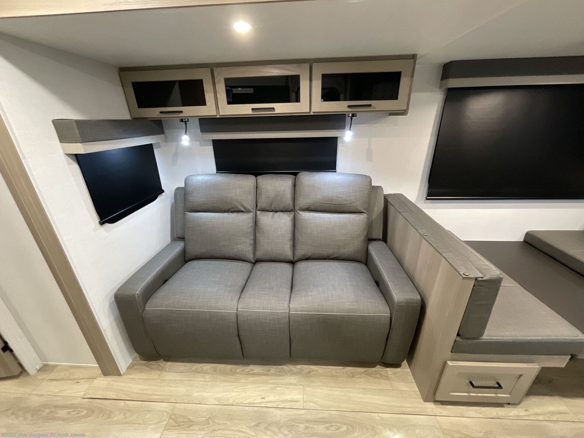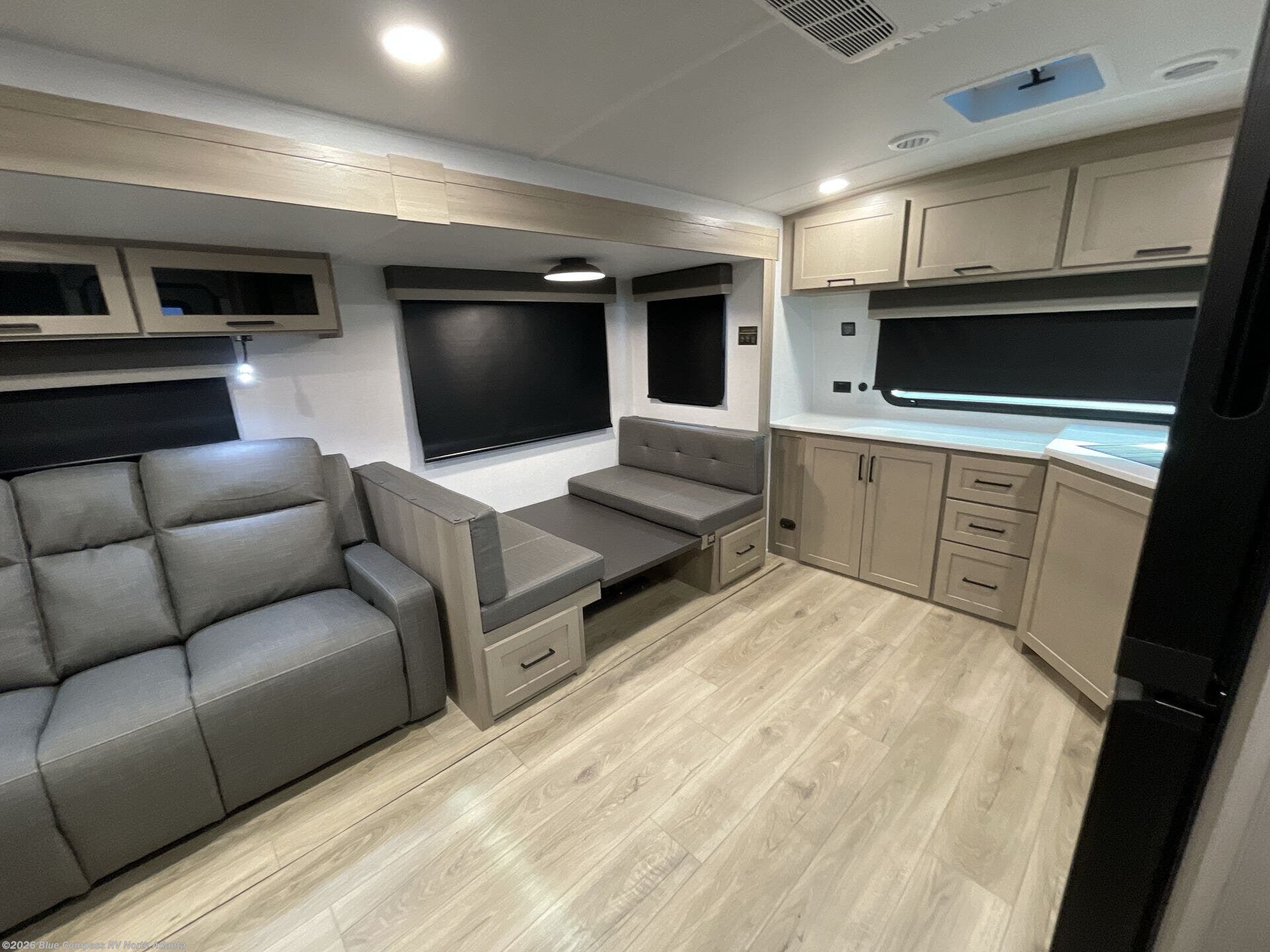 When you are outside this trailer you can enjoy the protection from the 21' power awning, you will also find exterior storage for your extra gear, and a ladder at the rear. You get to choose which entrance to step up into, be it the spacious rear bedroom with a queen bed slide and a wardrobe, or the main entry into the kitchen and living area. The furniture slide includes a booth dinette to eat your meals at, and theater seating to watch the Smart TV with a fireplace below. And the cook will love the front kitchen with extra counter space, a three-burner range, plus a 12V refrigerator and pantry for food storage!