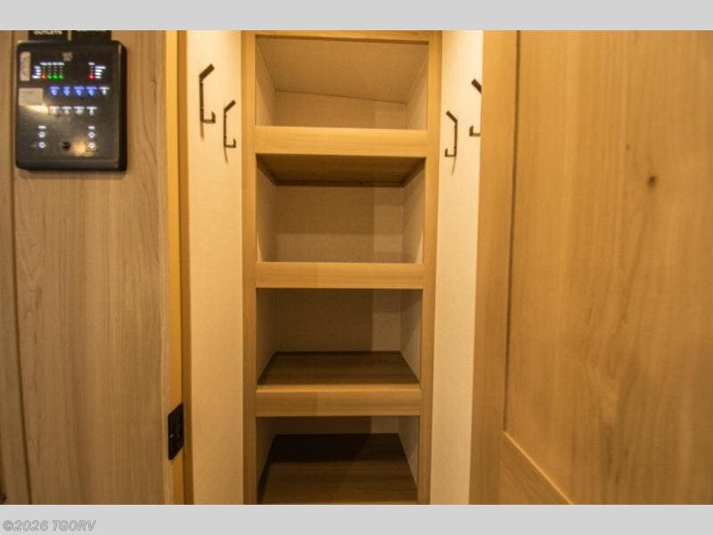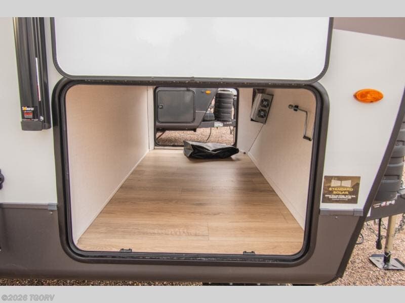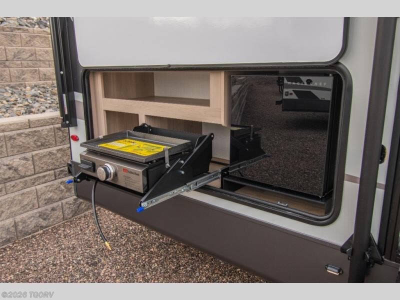 Looking for a trailer that sleeps eight, allows you to cook indoors or outdoors, and provides added interior space? This trailer provides for those wants and needs, and even more! The outside kitchen gives you more choices when feeding the masses along with the outside griddle, and the interior kitchen includes an L-shaped area for the cook to have their own space with full amenities including a walk-in pantry to bring along everything they need. The full bathroom will keep everyone refreshed, and the theater seating and U-shaped dinette offer seating inside to enjoy the Smart TV and fireplace. There is plenty of storage found throughout the interior, and along the exterior you will find several places to stow your outdoor items including in the pass thru storage with an optional steel sliding tray. There is even a front door option if you prefer to have dual entry doors!