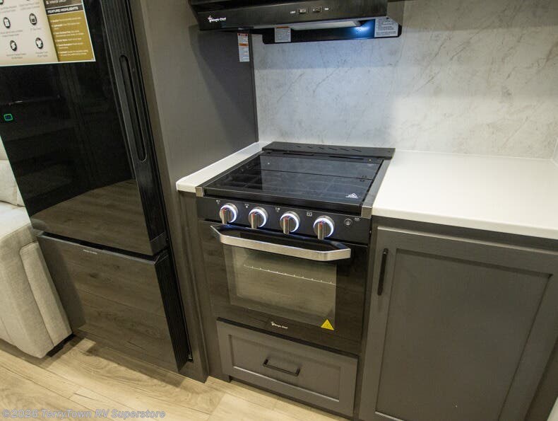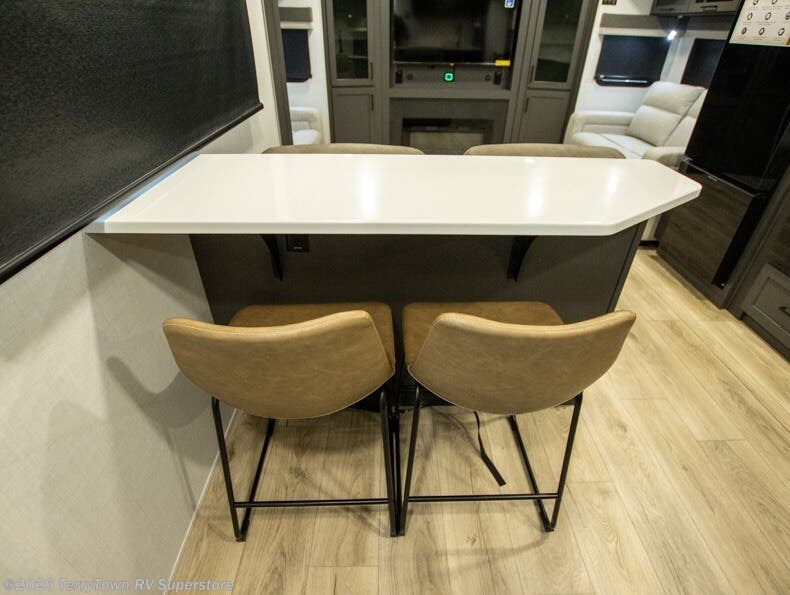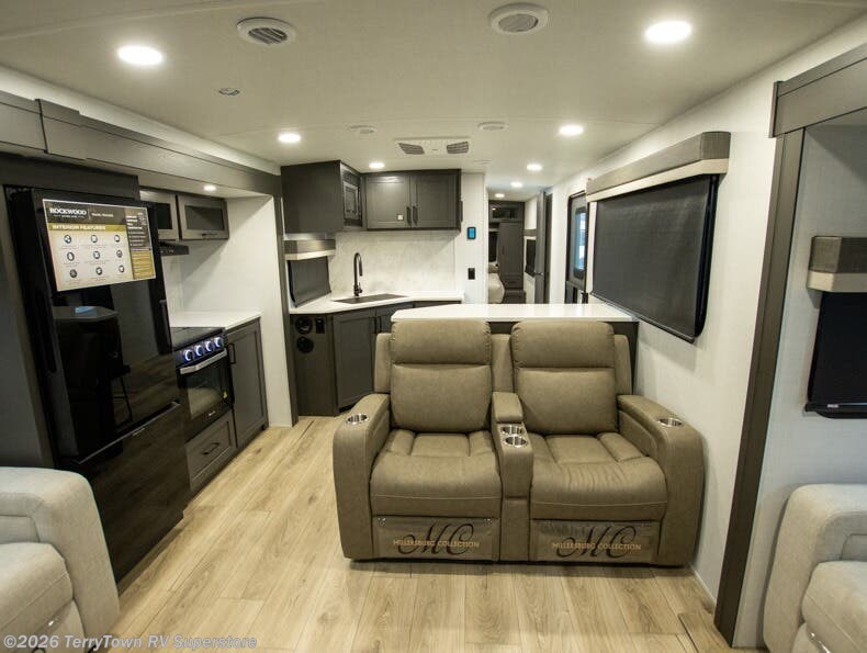 With dual slides at the rear, this Rockwood Ultra Lite travel trailer offers a spacious living area for entertaining or relaxing. Gather the whole gang for movie night with three cozy seating options facing the TV and fireplace, including two 60" hide-a-bed sofas and a 60" theater seat. A table with bar stools adds more seating and doubles as a dining spot, overlooking the TV. Overhead storage throughout the living area and kitchen provides plenty of room to stow away groceries, dishes, books, and board games, keeping everything organized. Let´s not forget the full bathroom with a large shower offers a comfortable place to refresh, while the front bedroom features a queen bed and two wardrobes for storing all your essentials.