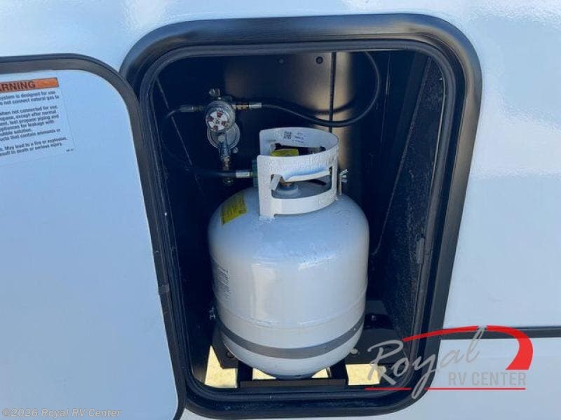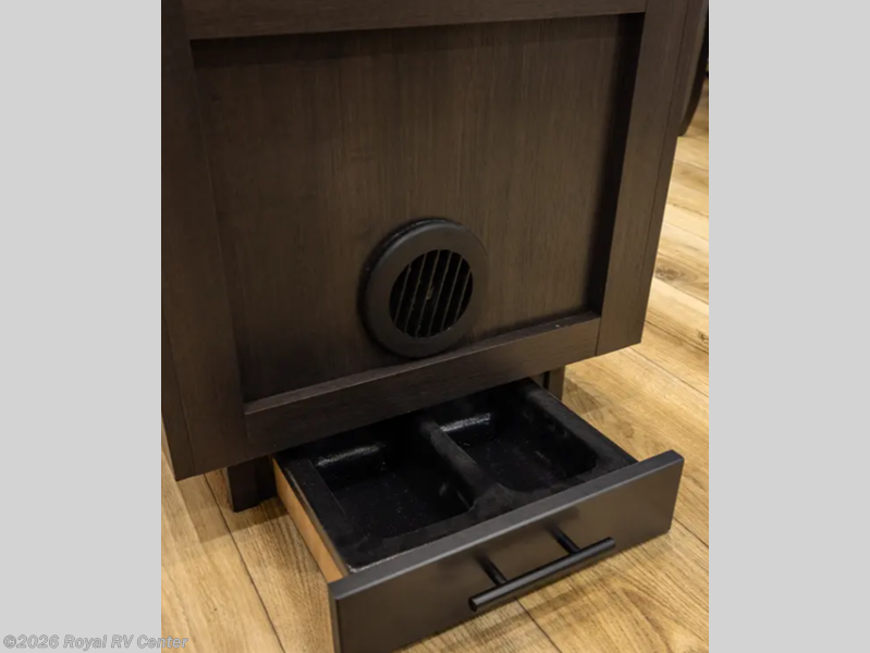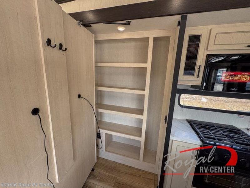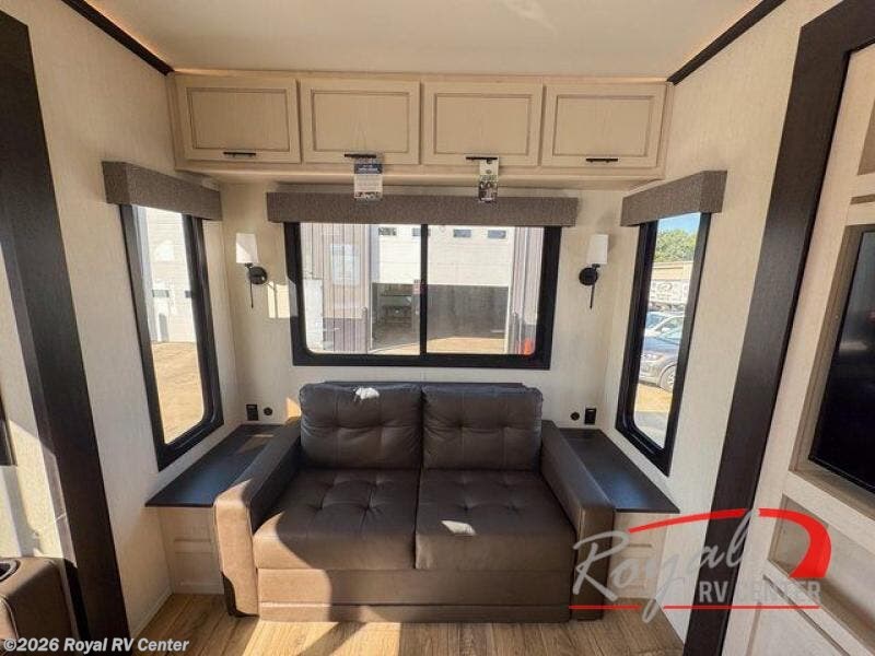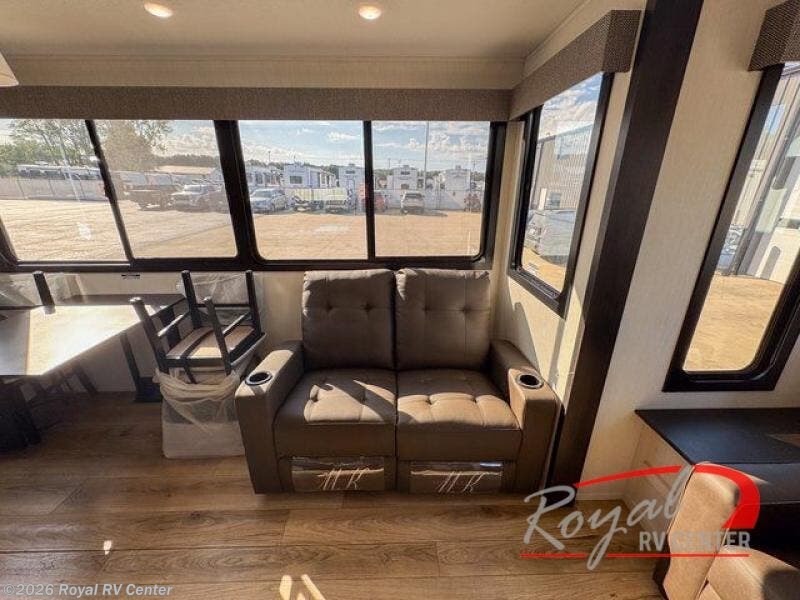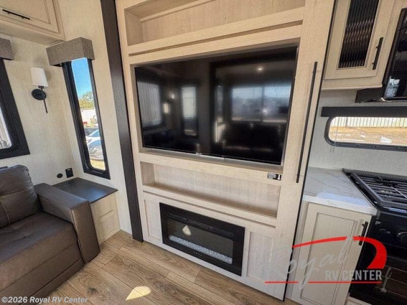 You will feel right at home in this fifth wheel! The rear living area includes a tri-fold sofa, a TV with a fireplace below, and theater seating for two making this space a second bedroom at night for guests. In the morning, you can prepare breakfast on the kitchen island and cooktop, then dine together at the versatile dinette/desk. There is plenty of storage space here, including a hidden pantry, a hutch, and overhead cabinets. The full bath will allow you to stay clean throughout your trip, and you'll feel right at home in the front private bedroom with a king bed. This model also includes an outside refrigerator for snacks, plus pass-thru storage for all your gear!