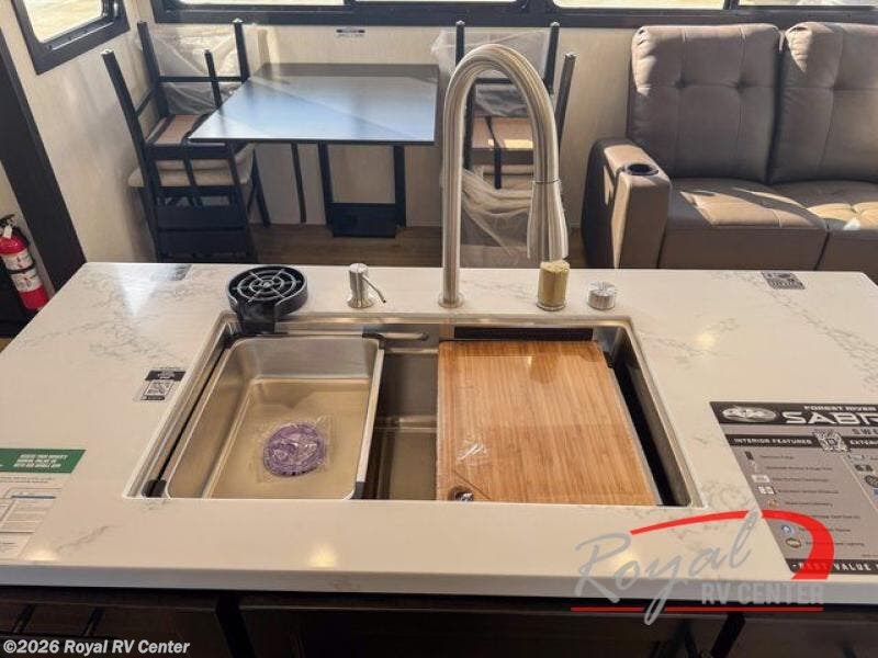 You will experience luxurious camping trips at an affordable price with any one of these Forest River Sabre fifth wheels! These models are durable and ready to travel anytime of the year thanks to features like the high-gloss gel-coat front cap with LED lighting, the PVC roof membrane, and the forced air underbelly with enclosed gate valves. The electric auto-leveling system makes setting up easy and safe, and the adjustable power awning with LED lighting will create an inviting outdoor living space. Each model includes a universal docking station which includes a black tank flush and an outside shower, and adjustable stable steps for you to enter and exit the unit safely. Inside, you will love the design of the ambient accent lighting in the living area, the real wood lumbercore cabinetry, and the linoleum flooring!