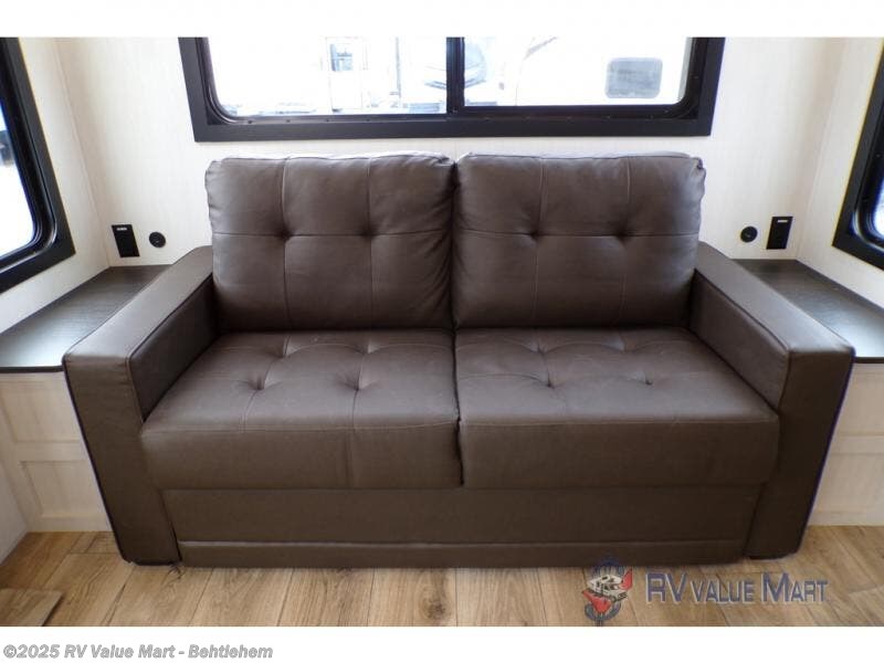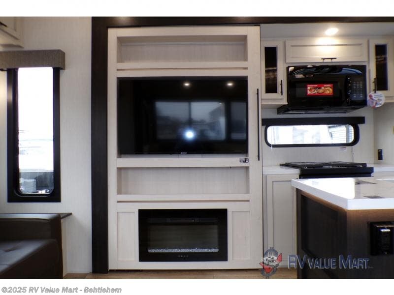 You will feel right at home in this fifth wheel! The rear living area includes a tri-fold sofa, a TV with a fireplace below, and theater seating for two making this space a second bedroom at night for guests. In the morning, you can prepare breakfast on the kitchen island and cooktop, then dine together at the versatile dinette/desk. There is plenty of storage space here, including a hidden pantry, a hutch, and overhead cabinets. The full bath will allow you to stay clean throughout your trip, and you'll feel right at home in the front private bedroom with a king bed. This model also includes an outside refrigerator for snacks, plus pass-thru storage for all your gear!