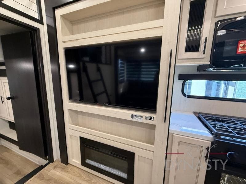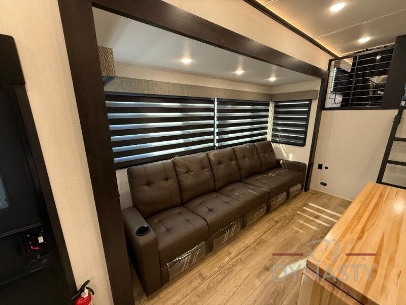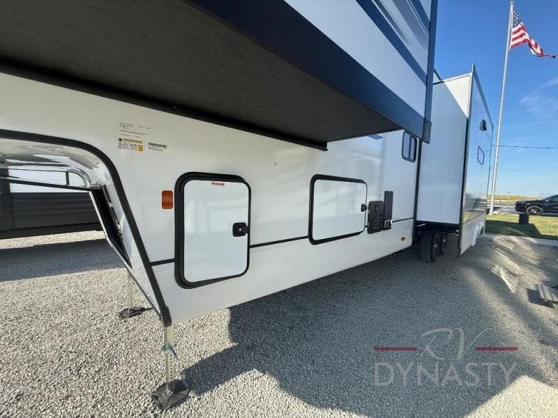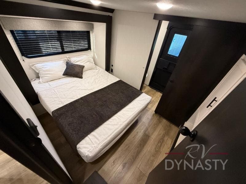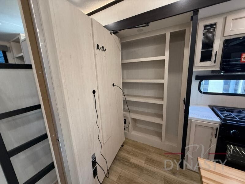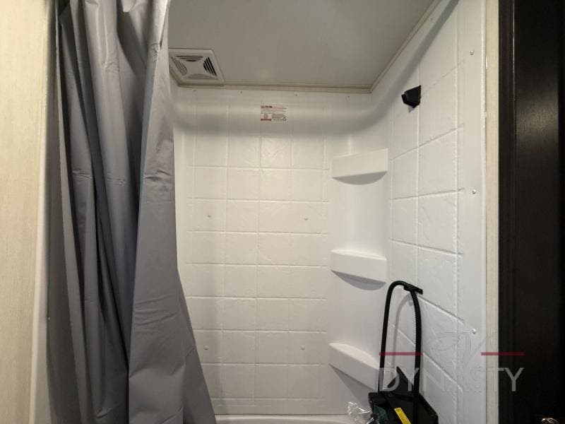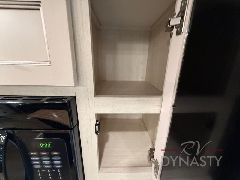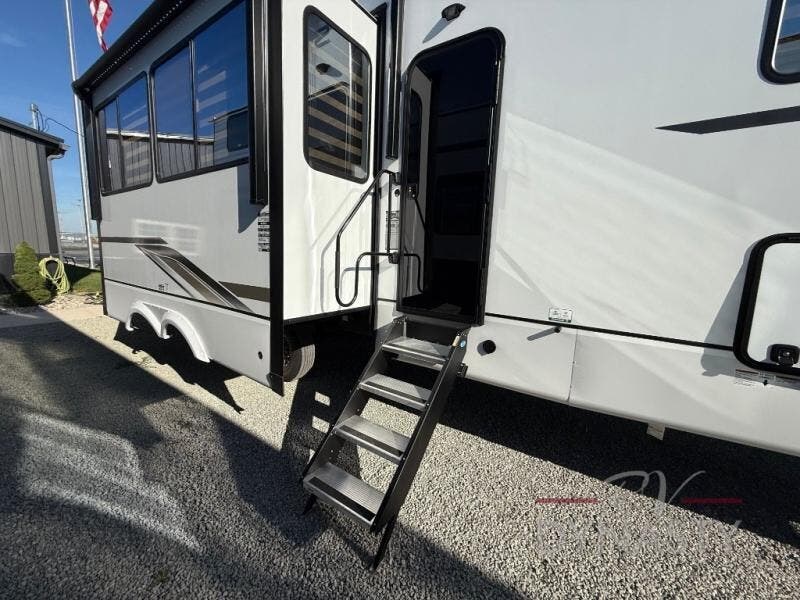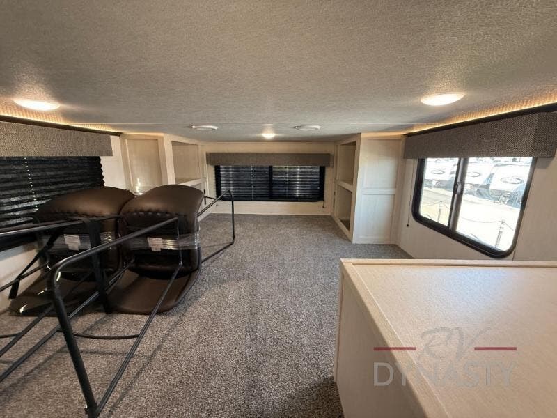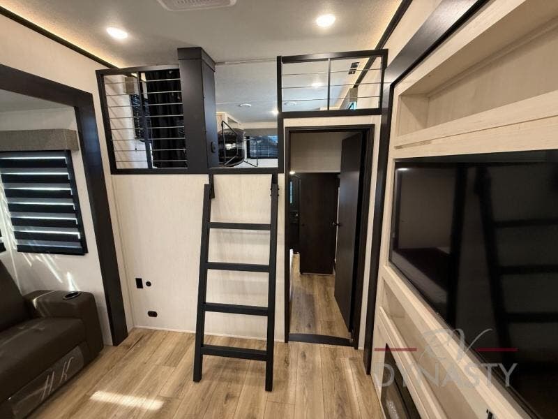 Are you looking for a fifth wheel where you can bring along your neighbor friends? You can do just that since there are two bedrooms in this unit, one of which includes a master bath with its own exterior entry door! The front bedroom is right next to the second full bath for convenience, and includes a camper king bed slide, a dresser, and front wardrobe. The rear master bedroom has a queen bed slide out across from a second slide for more floor space, and there is a loft above this room for more sleeping or storage space. Everyone can meet in the middle kitchen and living room since there are recliners, a ceiling fan, and kitchen island with four chairs. There is also storage below the island for kitchen necessities, and the hidden pantry behind the TV will be perfect for snacks, board games and more!
