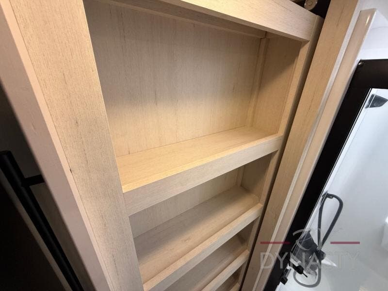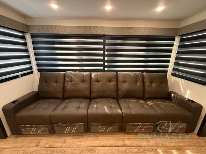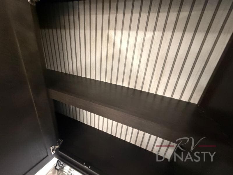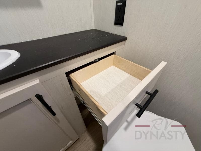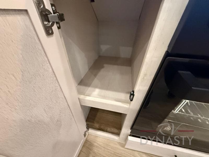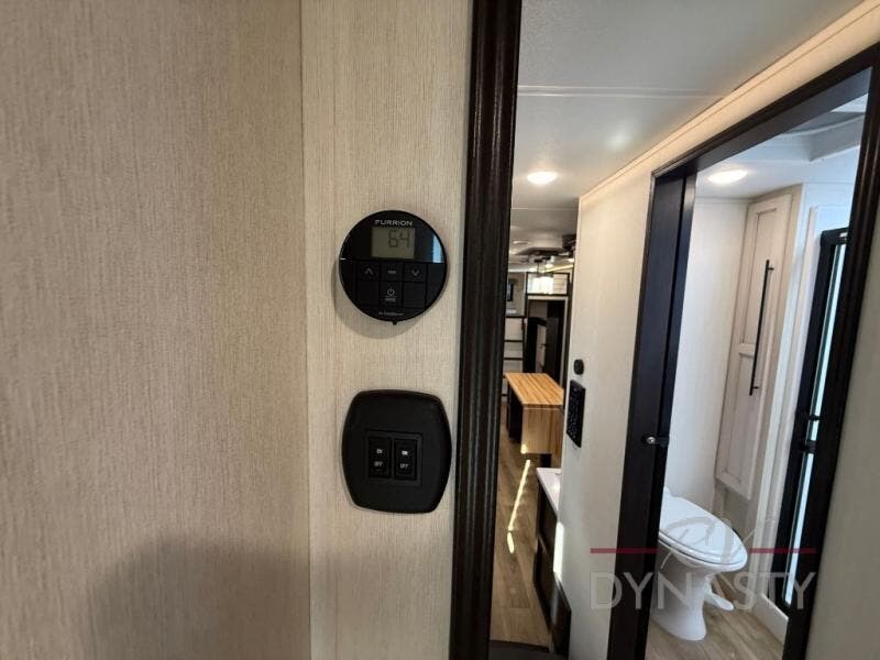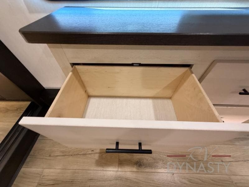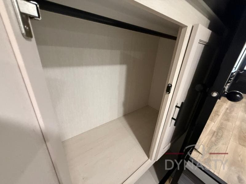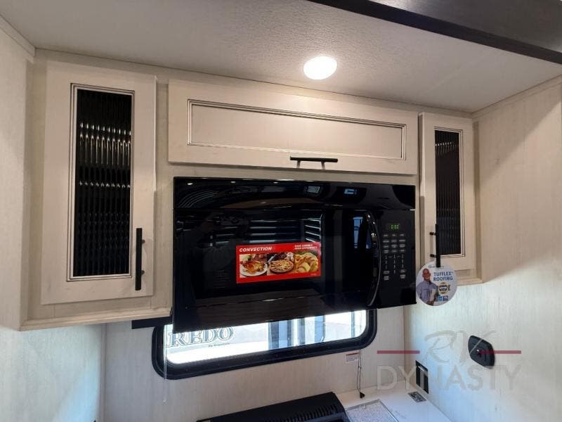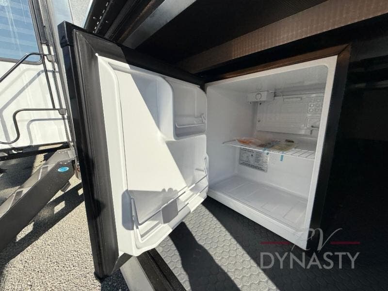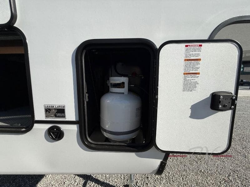 Are you looking for a fifth wheel where you can bring along your neighbor friends? You can do just that since there are two bedrooms in this unit, one of which includes a master bath with its own exterior entry door! The front bedroom is right next to the second full bath for convenience, and includes a camper king bed slide, a dresser, and front wardrobe. The rear master bedroom has a queen bed slide out across from a second slide for more floor space, and there is a loft above this room for more sleeping or storage space. Everyone can meet in the middle kitchen and living room since there are recliners, a ceiling fan, and kitchen island with four chairs. There is also storage below the island for kitchen necessities, and the hidden pantry behind the TV will be perfect for snacks, board games and more!