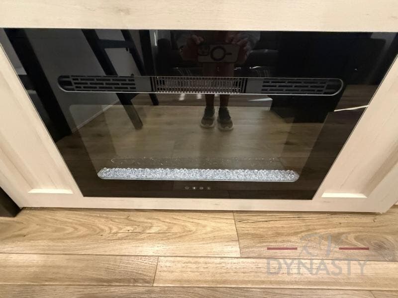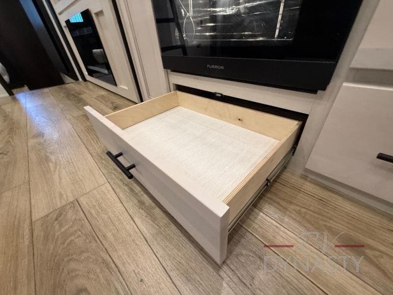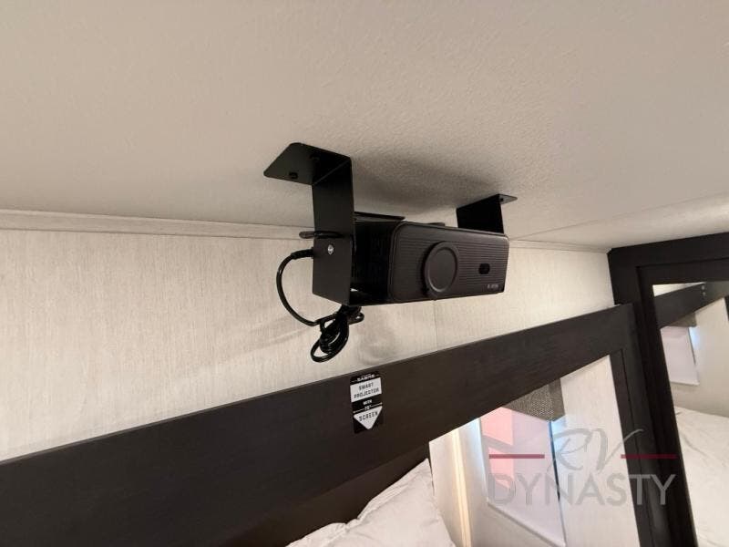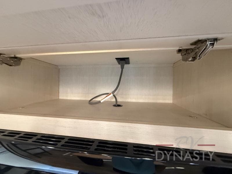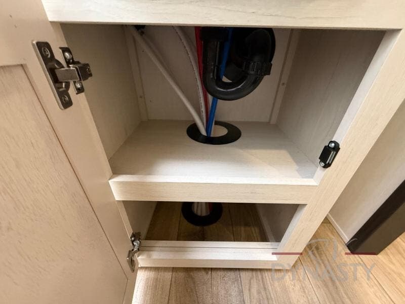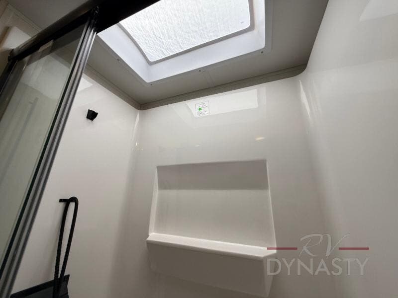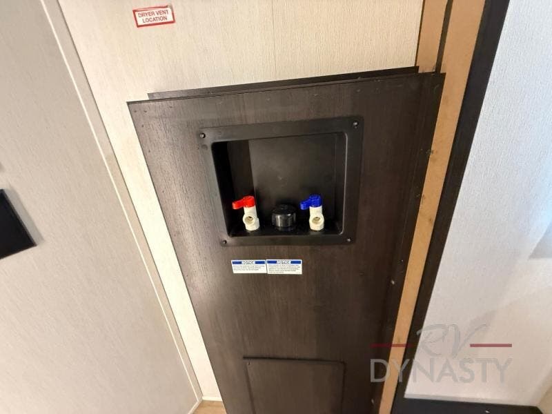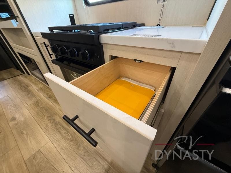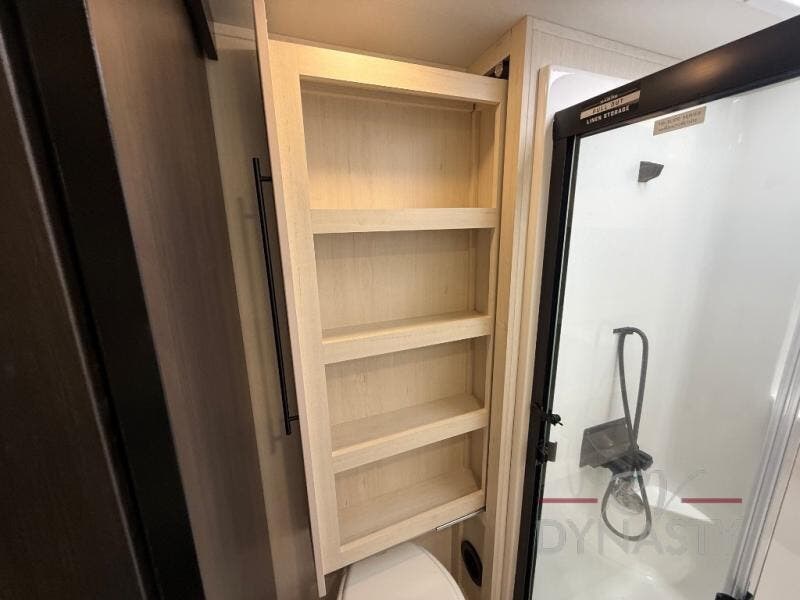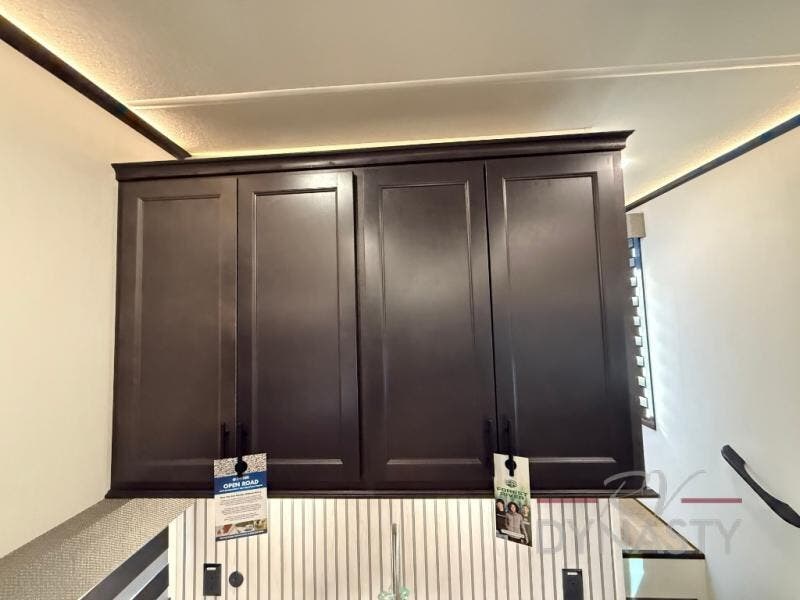 Are you looking for a fifth wheel where you can bring along your neighbor friends? You can do just that since there are two bedrooms in this unit, one of which includes a master bath with its own exterior entry door! The front bedroom is right next to the second full bath for convenience, and includes a camper king bed slide, a dresser, and front wardrobe. The rear master bedroom has a queen bed slide out across from a second slide for more floor space, and there is a loft above this room for more sleeping or storage space. Everyone can meet in the middle kitchen and living room since there are recliners, a ceiling fan, and kitchen island with four chairs. There is also storage below the island for kitchen necessities, and the hidden pantry behind the TV will be perfect for snacks, board games and more!