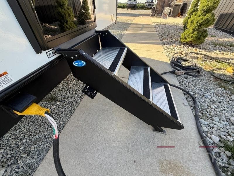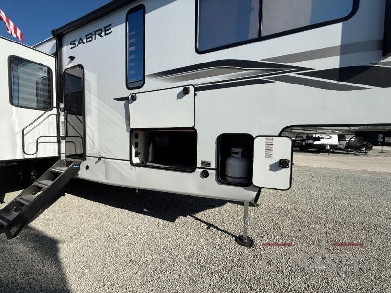You will experience luxurious camping trips at an affordable price with any one of these Forest River Sabre fifth wheels! These models are durable and ready to travel anytime of the year thanks to features like the high-gloss gel-coat front cap with LED lighting, the PVC roof membrane, and the forced air underbelly with enclosed gate valves. The electric auto-leveling system makes setting up easy and safe, and the adjustable power awning with LED lighting will create an inviting outdoor living space. Each model includes a universal docking station which includes a black tank flush and an outside shower, and adjustable stable steps for you to enter and exit the unit safely. Inside, you will love the design of the ambient accent lighting in the living area, the real wood lumbercore cabinetry, and the linoleum flooring!