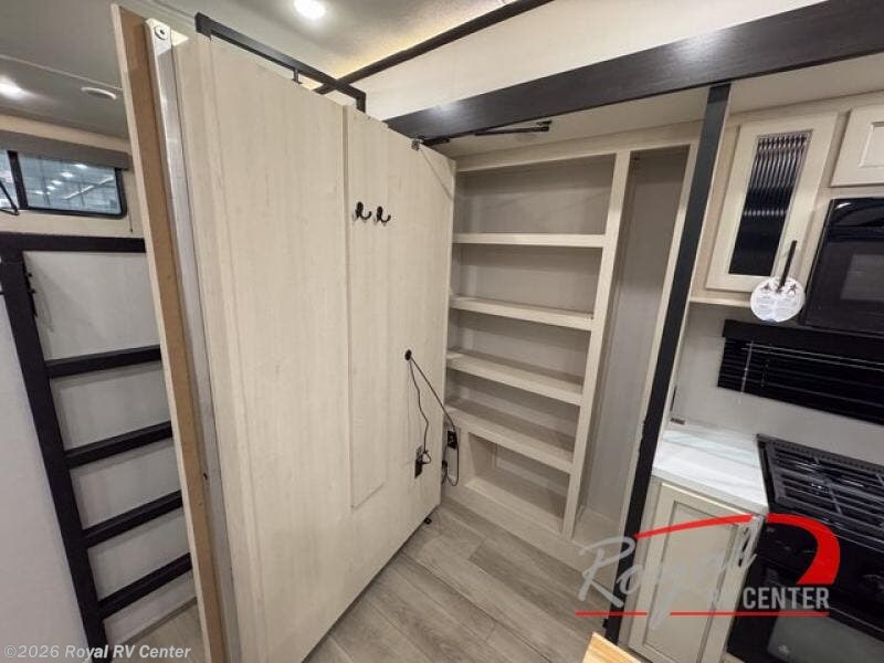 Are you looking for a fifth wheel where you can bring along your neighbor friends? You can do just that since there are two bedrooms in this unit, one of which includes a master bath with its own exterior entry door! The front bedroom is right next to the second full bath for convenience, and includes a camper king bed slide, a dresser, and front wardrobe. The rear master bedroom has a queen bed slide out across from a second slide for more floor space, and there is a loft above this room for more sleeping or storage space. Everyone can meet in the middle kitchen and living room since there are recliners, a ceiling fan, and kitchen island with four chairs. There is also storage below the island for kitchen necessities, and the hidden pantry behind the TV will be perfect for snacks, board games and more!