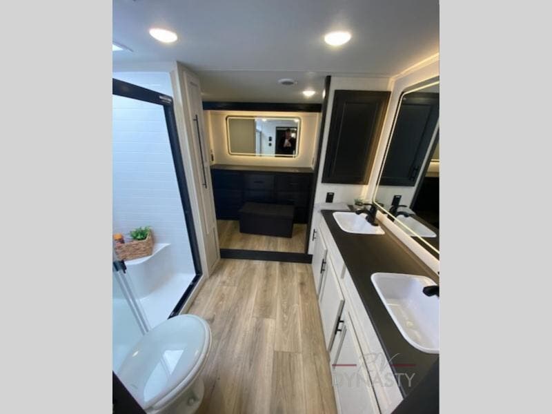 Get ready to elevate your travels to new heights with this show-stopping fifth wheel, designed for thrill-seekers. The rear kitchen is a culinary powerhouse, featuring a spacious layout, overhead cabinets, ample countertop, three-burner cooktop, microwave, oversized fridge, and pantry. In the living area section, the sectional sofa creates a warm and inviting space, perfect for socializing, relaxing, and making memories. The fireplace crackles with warmth, while the entertainment center provides endless entertainment options. Also, the dinette is a charming spot for meals, laughter, and storytelling. Unwind and recharge in style, with plenty of room to get ready for the day ahead, thanks to the full bath with dual sinks, ample dresser space, and a half-bath in the middle of this unit for added convenience. Moving to the main bedroom, the camper king bed is perfect for a restful night's sleep, and the dresser with hidden storage keeps your belongings organized, while the projector above the dresser adds a touch of magic to movie nights.