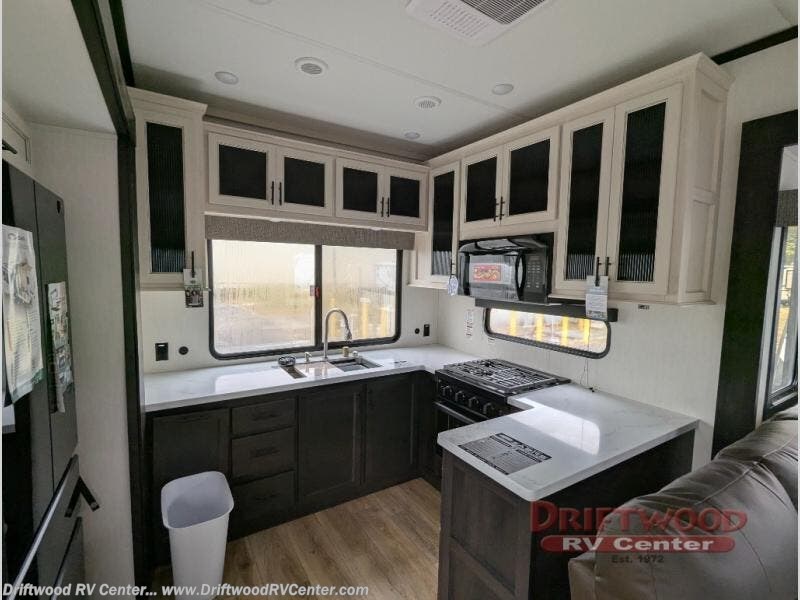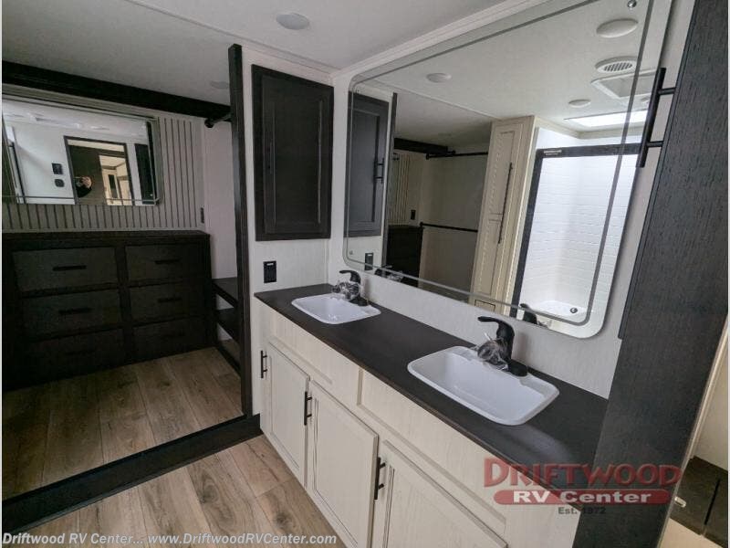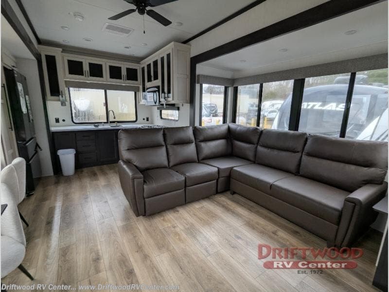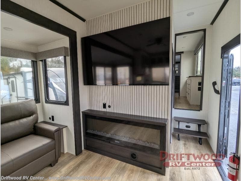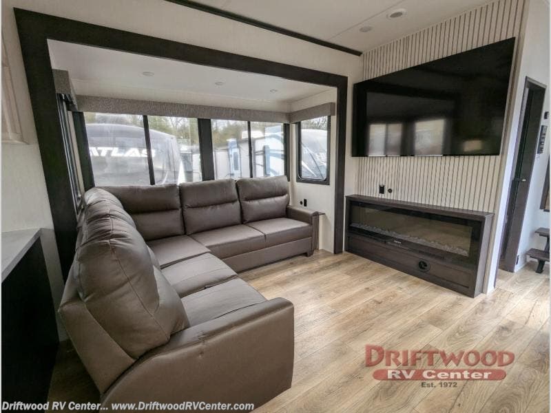 Get ready to elevate your travels to new heights with this show-stopping fifth wheel, designed for thrill-seekers. The rear kitchen is a culinary powerhouse, featuring a spacious layout, overhead cabinets, ample countertop, three-burner cooktop, microwave, oversized fridge, and pantry. In the living area section, the sectional sofa creates a warm and inviting space, perfect for socializing, relaxing, and making memories. The fireplace crackles with warmth, while the entertainment center provides endless entertainment options. Also, the dinette is a charming spot for meals, laughter, and storytelling. Unwind and recharge in style, with plenty of room to get ready for the day ahead, thanks to the full bath with dual sinks, ample dresser space, and a half-bath in the middle of this unit for added convenience. Moving to the main bedroom, the camper king bed is perfect for a restful night's sleep, and the dresser with hidden storage keeps your belongings organized, while the projector above the dresser adds a touch of magic to movie nights.