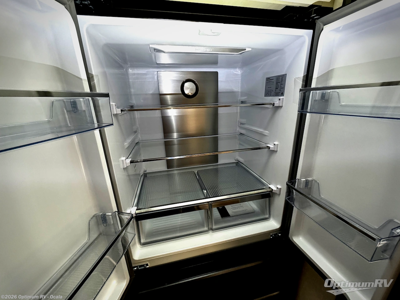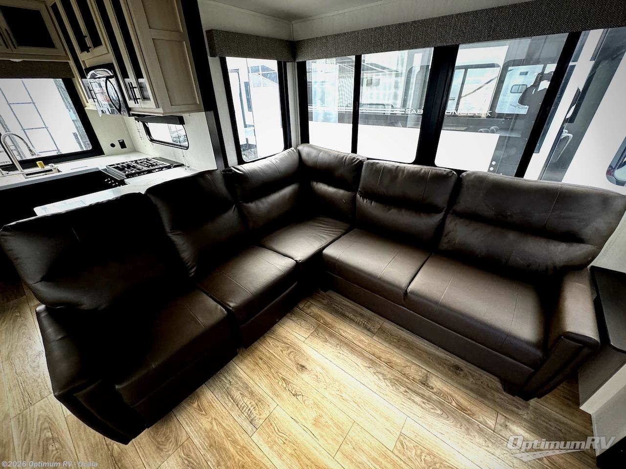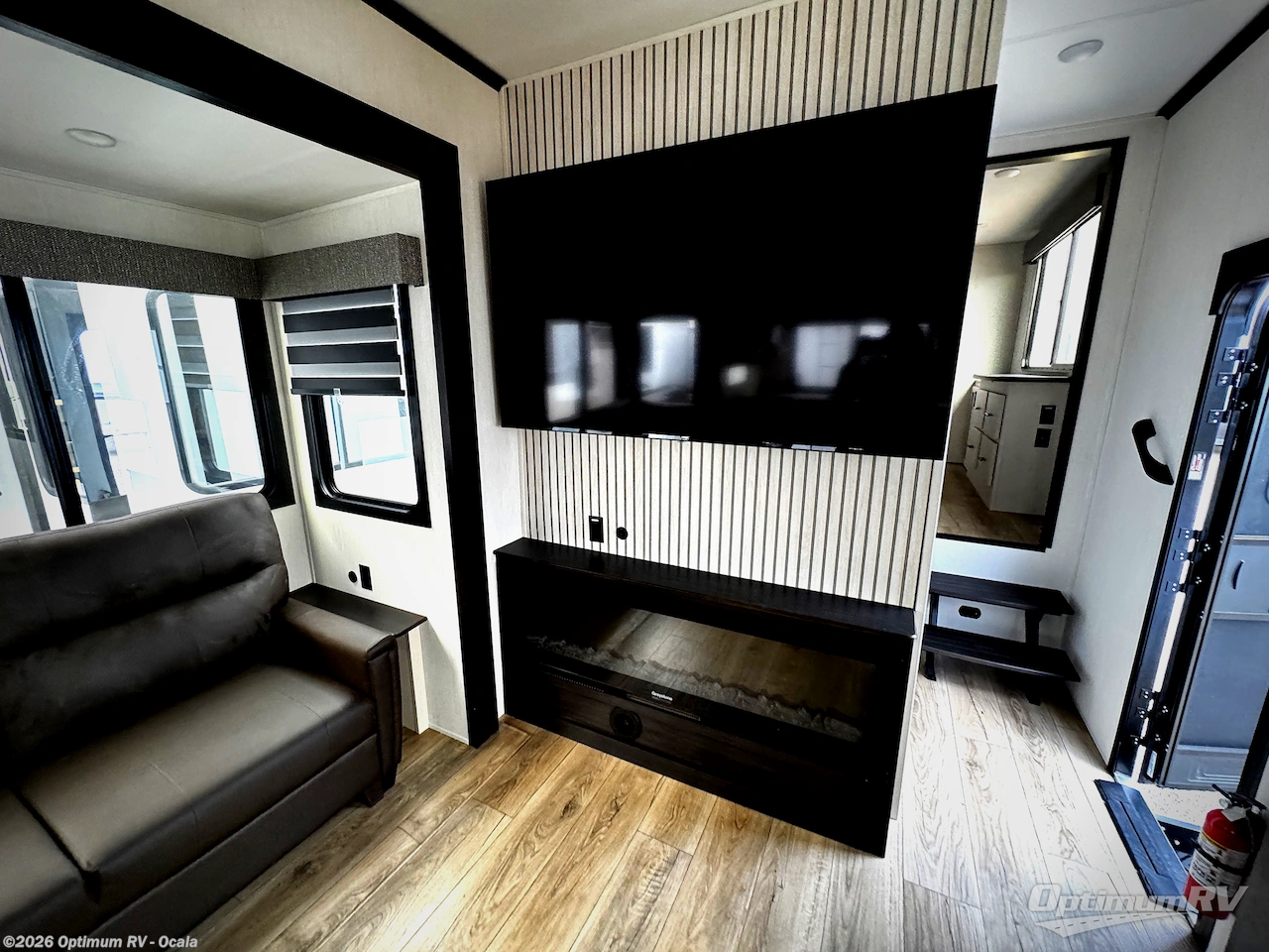 Get ready to elevate your travels to new heights with this show-stopping fifth wheel, designed for thrill-seekers. The rear kitchen is a culinary powerhouse, featuring a spacious layout, overhead cabinets, ample countertop, three-burner cooktop, microwave, oversized fridge, and pantry. In the living area section, the sectional sofa creates a warm and inviting space, perfect for socializing, relaxing, and making memories. The fireplace crackles with warmth, while the entertainment center provides endless entertainment options. Also, the dinette is a charming spot for meals, laughter, and storytelling. Unwind and recharge in style, with plenty of room to get ready for the day ahead, thanks to the full bath with dual sinks, ample dresser space, and a half-bath in the middle of this unit for added convenience. Moving to the main bedroom, the camper king bed is perfect for a restful night's sleep, and the dresser with hidden storage keeps your belongings organized, while the projector above the dresser adds a touch of magic to movie nights.