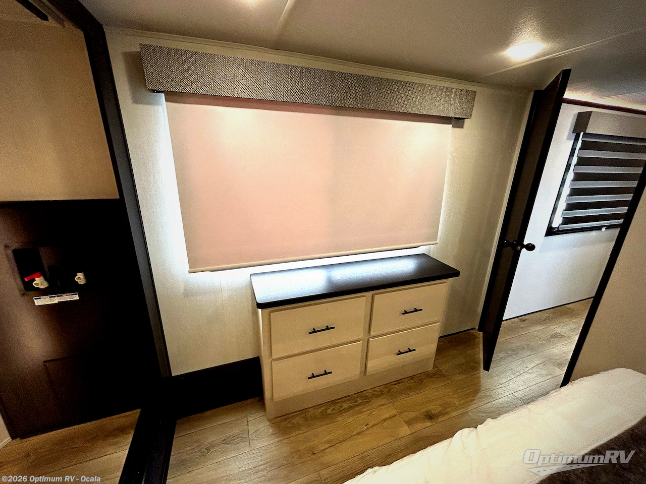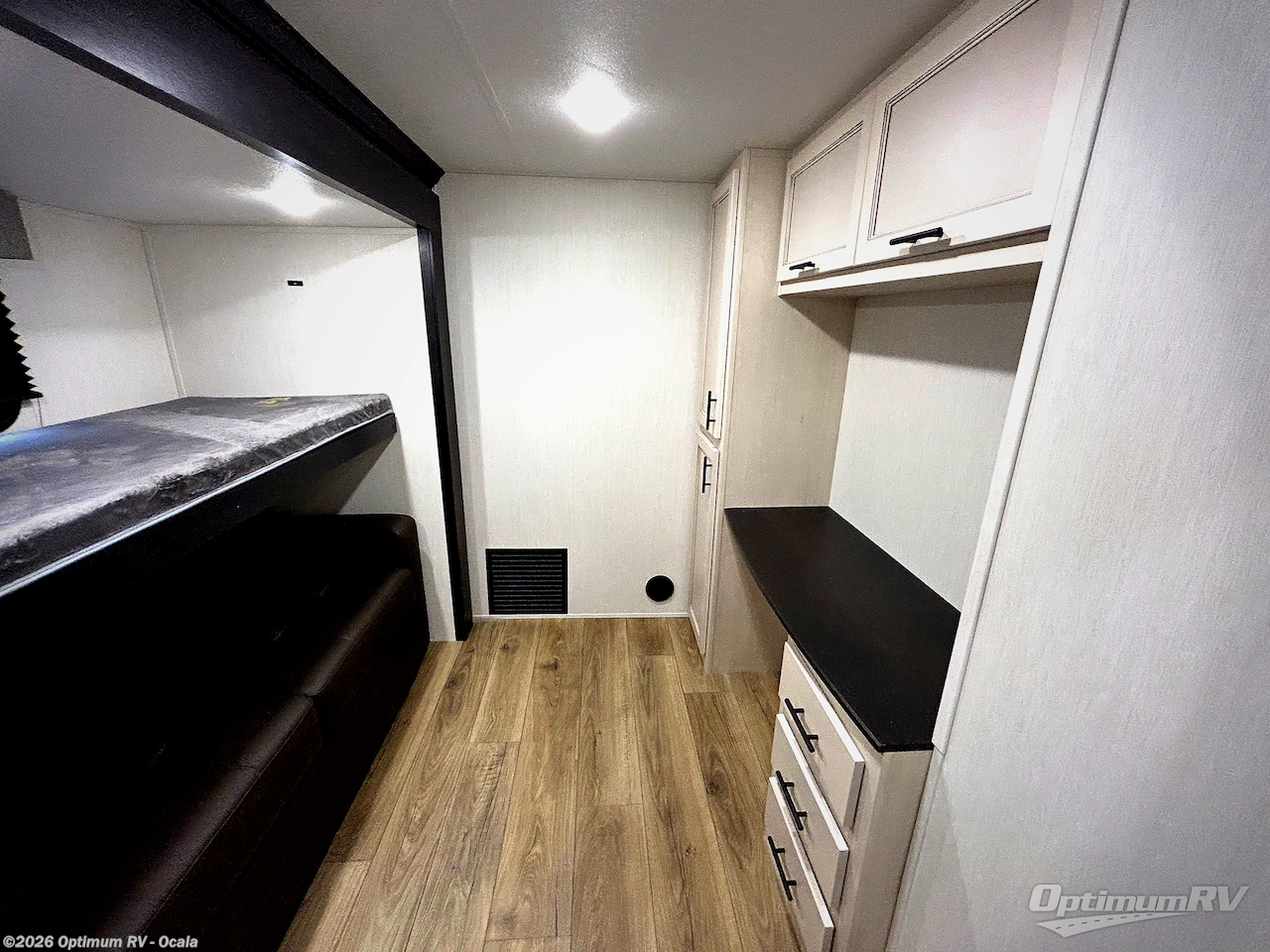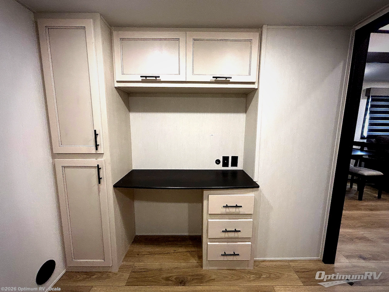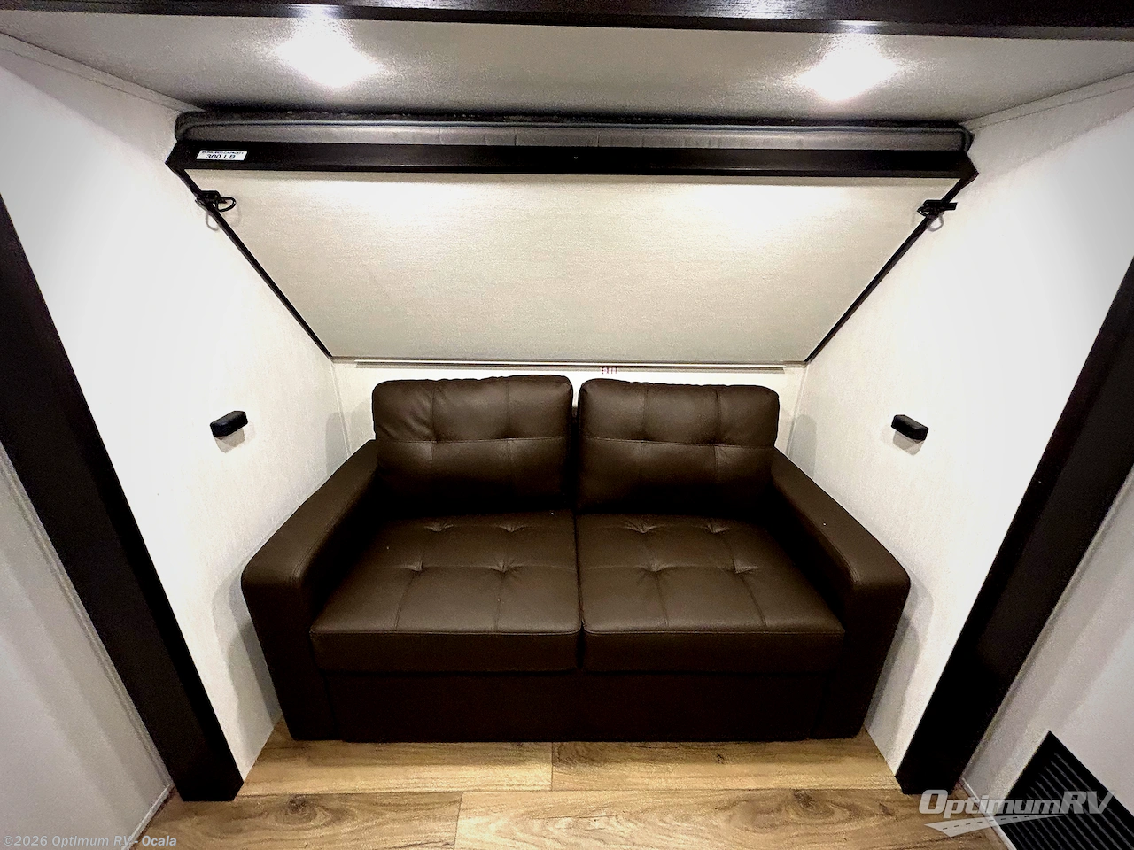 There is much to love in this fifth wheel! Starting with the second bedroom which has a slide that houses a flip-up bunk above a tri-fold sofa across from a desk with drawers, a drop zone, and a wardrobe, plus above all of that is a storage/bunk loft. The rear living area includes a tri-fold sofa, a TV with a hidden pantry behind, and theater seating for two making this space another area at night for guests. In the morning, you can prepare breakfast on the kitchen island, then dine together at the versatile dinette/desk. The full bath will allow you to stay clean throughout your trip, and you'll feel right at home in the front private bedroom with a camper king bed, a dresser, and front wardrobe. Outside, a kitchen and two power awnings create an inviting space!