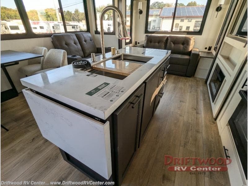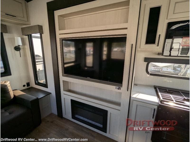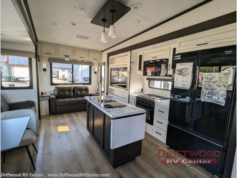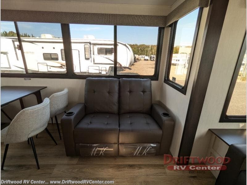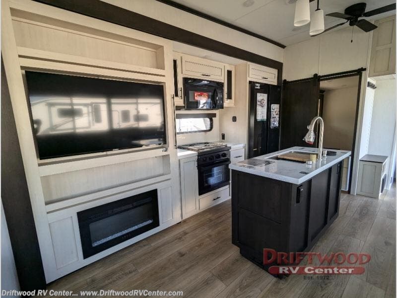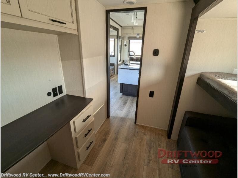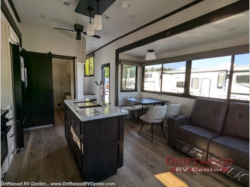 There is much to love in this fifth wheel! Starting with the second bedroom which has a slide that houses a flip-up bunk above a tri-fold sofa across from a desk with drawers, a drop zone, and a wardrobe, plus above all of that is a storage/bunk loft. The rear living area includes a tri-fold sofa, a TV with a hidden pantry behind, and theater seating for two making this space another area at night for guests. In the morning, you can prepare breakfast on the kitchen island, then dine together at the versatile dinette/desk. The full bath will allow you to stay clean throughout your trip, and you'll feel right at home in the front private bedroom with a camper king bed, a dresser, and front wardrobe. Outside, a kitchen and two power awnings create an inviting space!