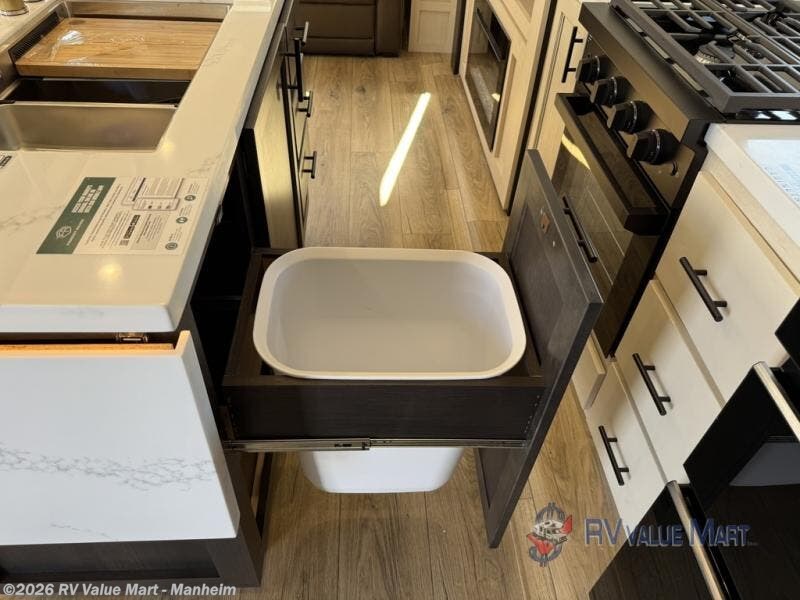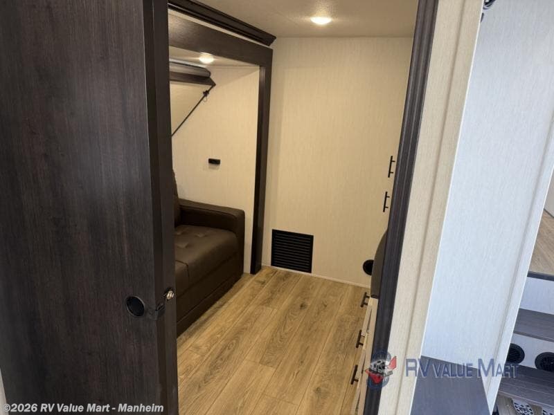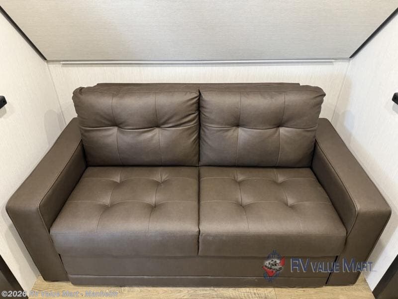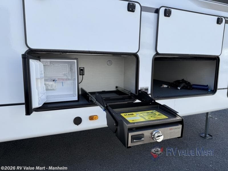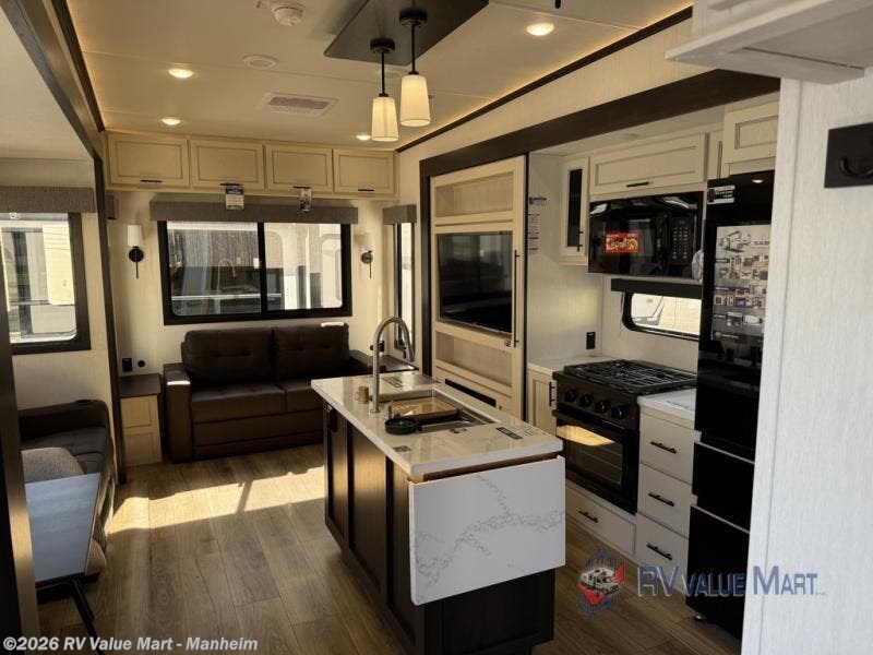 There is much to love in this fifth wheel! Starting with the second bedroom which has a slide that houses a flip-up bunk above a tri-fold sofa across from a desk with drawers, a drop zone, and a wardrobe, plus above all of that is a storage/bunk loft. The rear living area includes a tri-fold sofa, a TV with a hidden pantry behind, and theater seating for two making this space another area at night for guests. In the morning, you can prepare breakfast on the kitchen island, then dine together at the versatile dinette/desk. The full bath will allow you to stay clean throughout your trip, and you'll feel right at home in the front private bedroom with a camper king bed, a dresser, and front wardrobe. Outside, a kitchen and two power awnings create an inviting space!