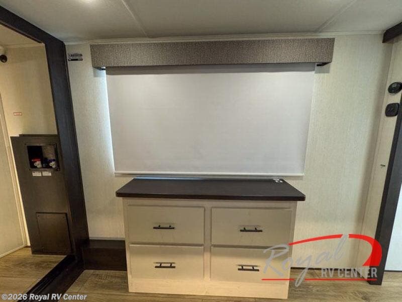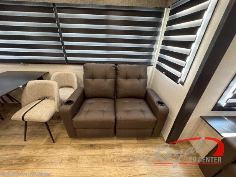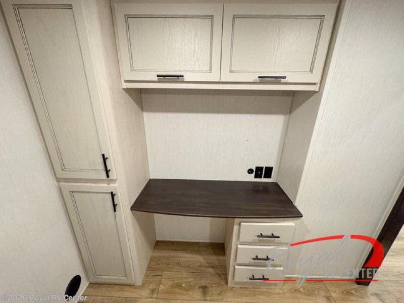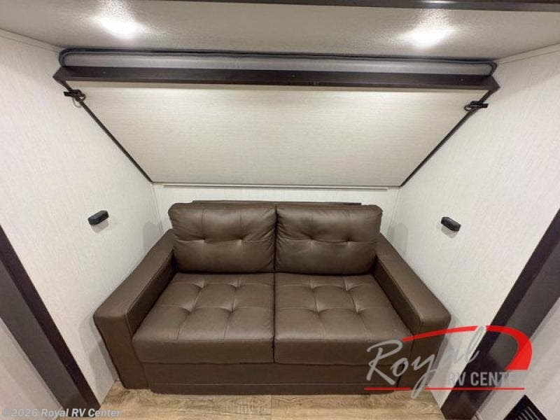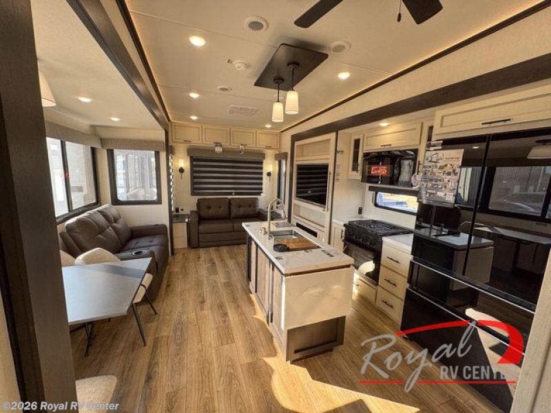 There is much to love in this fifth wheel! Starting with the second bedroom which has a slide that houses a flip-up bunk above a tri-fold sofa across from a desk with drawers, a drop zone, and a wardrobe, plus above all of that is a storage/bunk loft. The rear living area includes a tri-fold sofa, a TV with a hidden pantry behind, and theater seating for two making this space another area at night for guests. In the morning, you can prepare breakfast on the kitchen island, then dine together at the versatile dinette/desk. The full bath will allow you to stay clean throughout your trip, and you'll feel right at home in the front private bedroom with a camper king bed, a dresser, and front wardrobe. Outside, a kitchen and two power awnings create an inviting space!