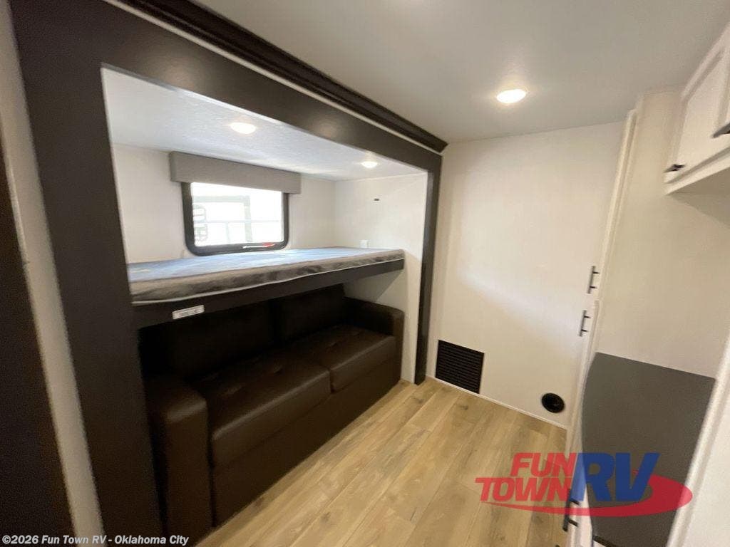 There is much to love in this fifth wheel! Starting with the second bedroom which has a slide that houses a flip-up bunk above a tri-fold sofa across from a desk with drawers, a drop zone, and a wardrobe, plus above all of that is a storage/bunk loft. The rear living area includes a tri-fold sofa, a TV with a hidden pantry behind, and theater seating for two making this space another area at night for guests. In the morning, you can prepare breakfast on the kitchen island, then dine together at the versatile dinette/desk. The full bath will allow you to stay clean throughout your trip, and you'll feel right at home in the front private bedroom with a camper king bed, a dresser, and front wardrobe. Outside, a kitchen and two power awnings create an inviting space!